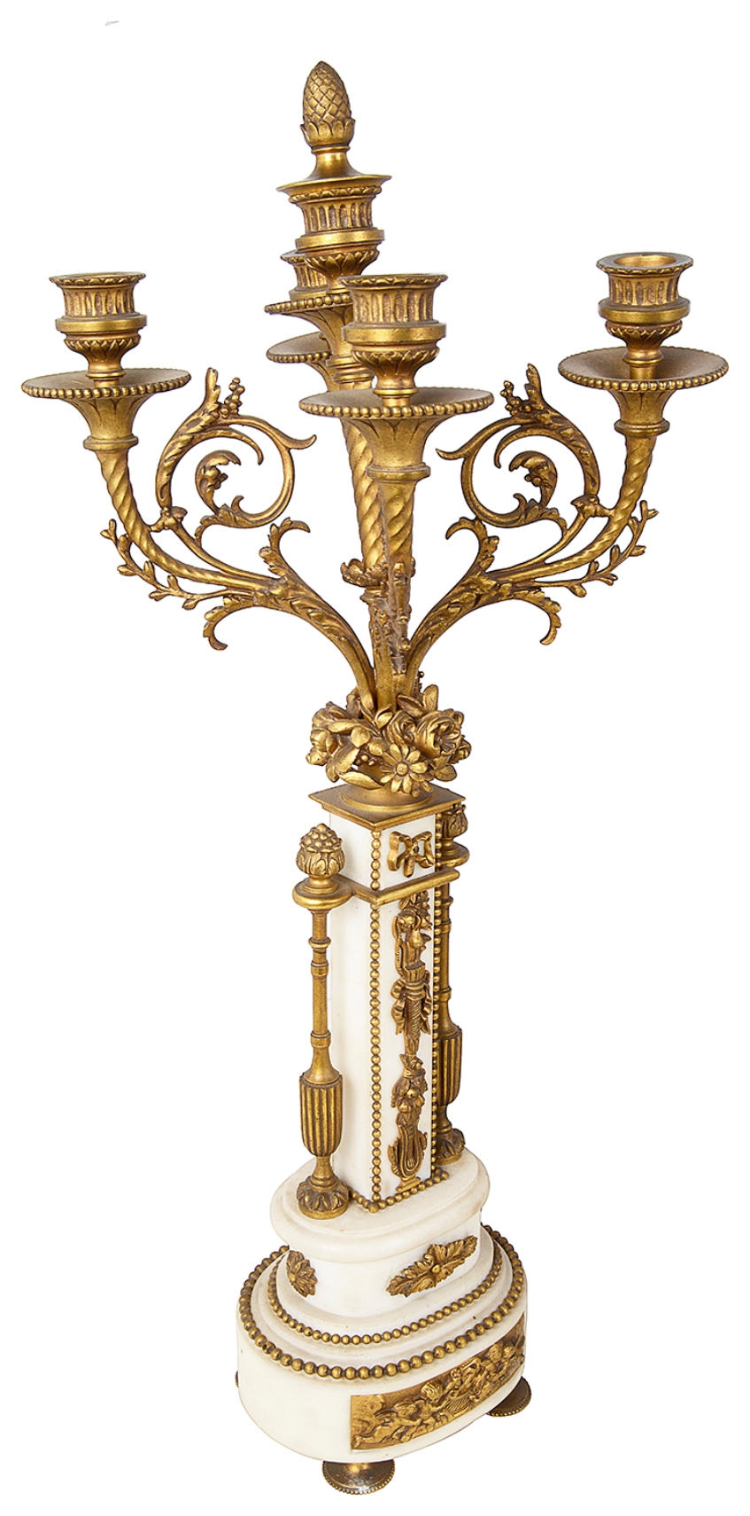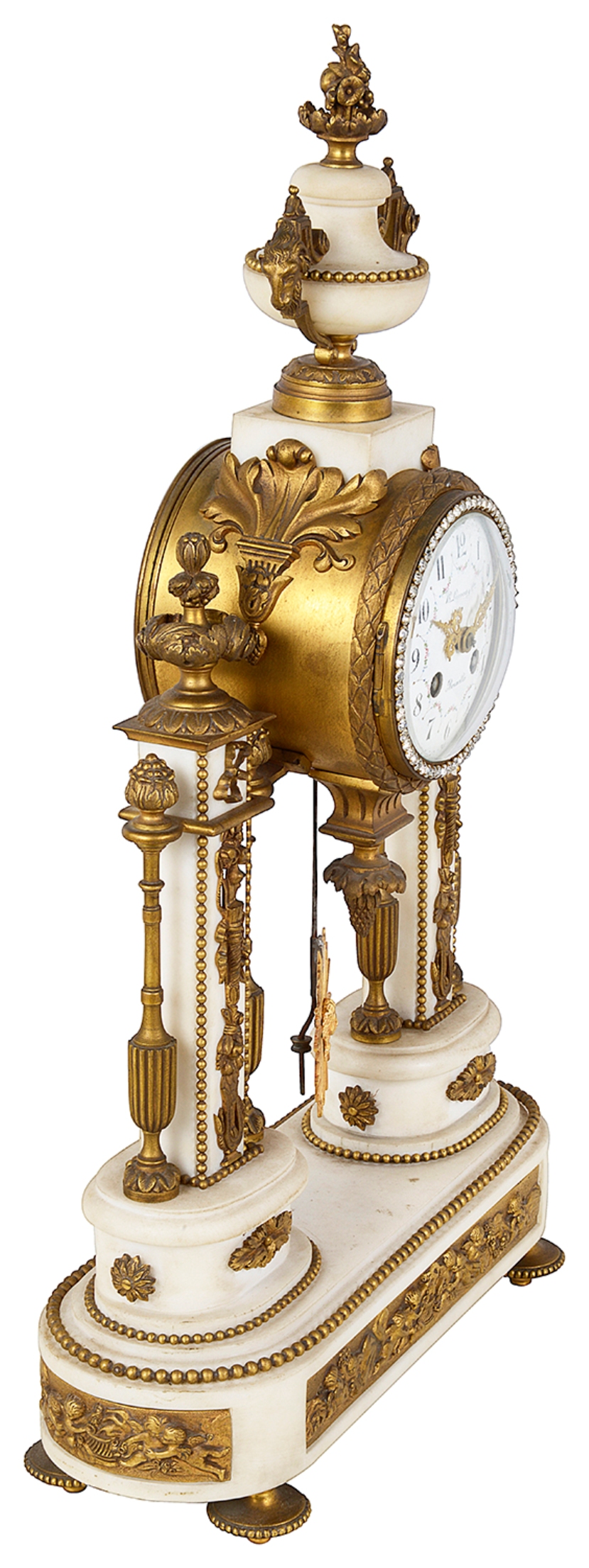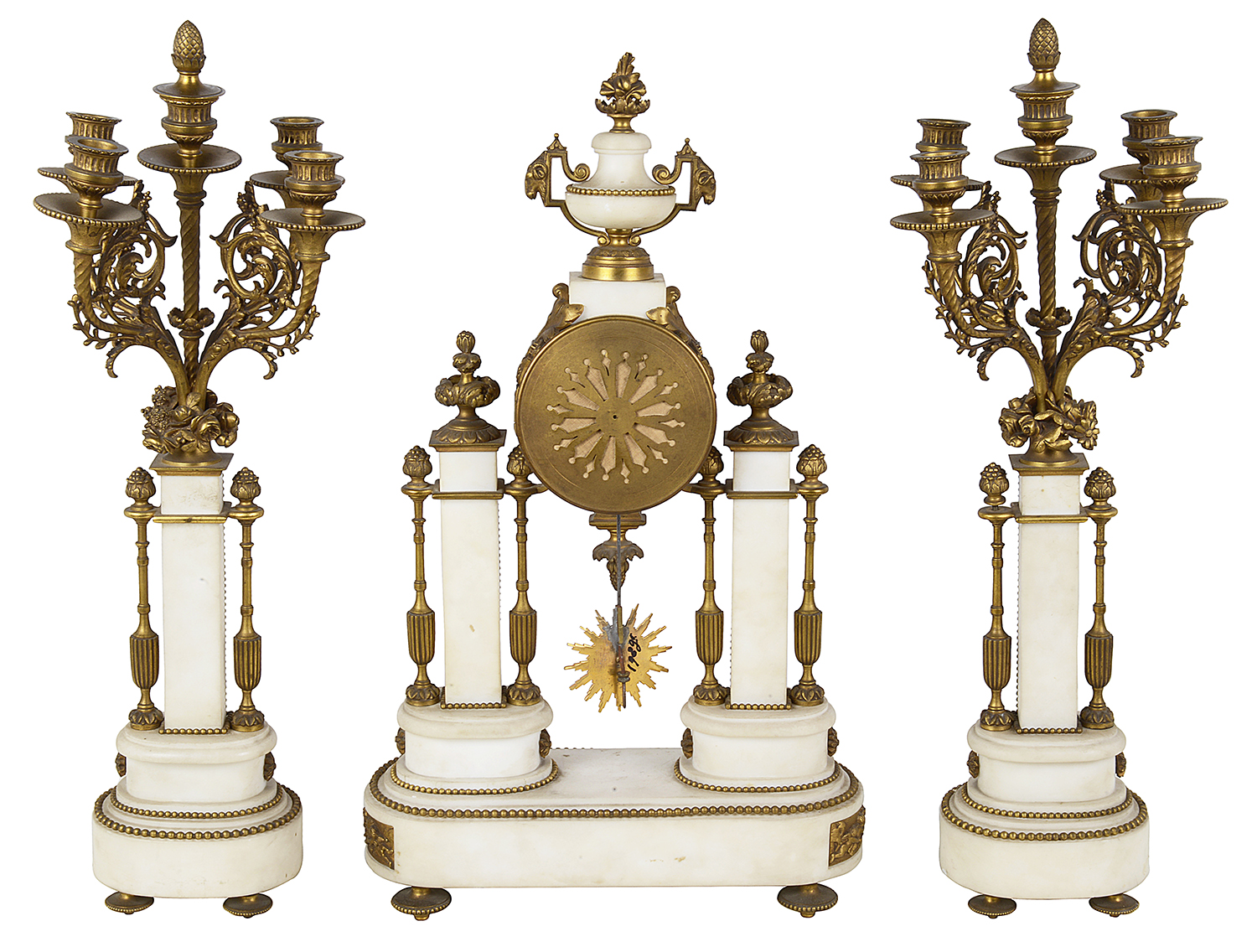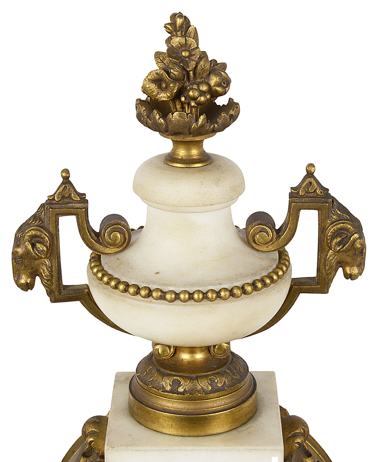 French 19th Century Louis XVI style white marble and gilded ormolu clock garniture, having a two handled urn finial above a white enamel clock face, an eight day duration clock that strikes on the hour and half hour. Flanked by a matching pair of five branch candelabra.