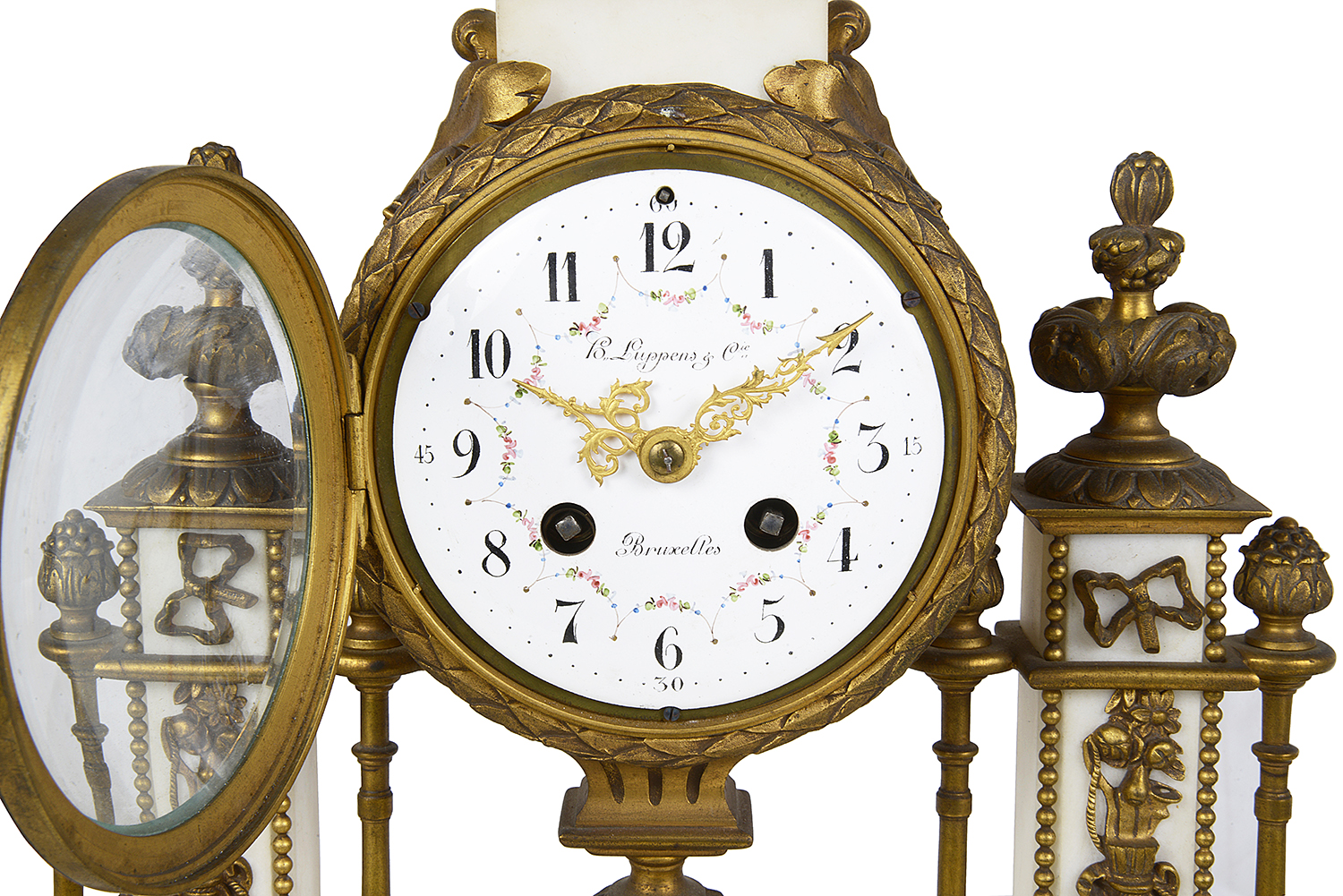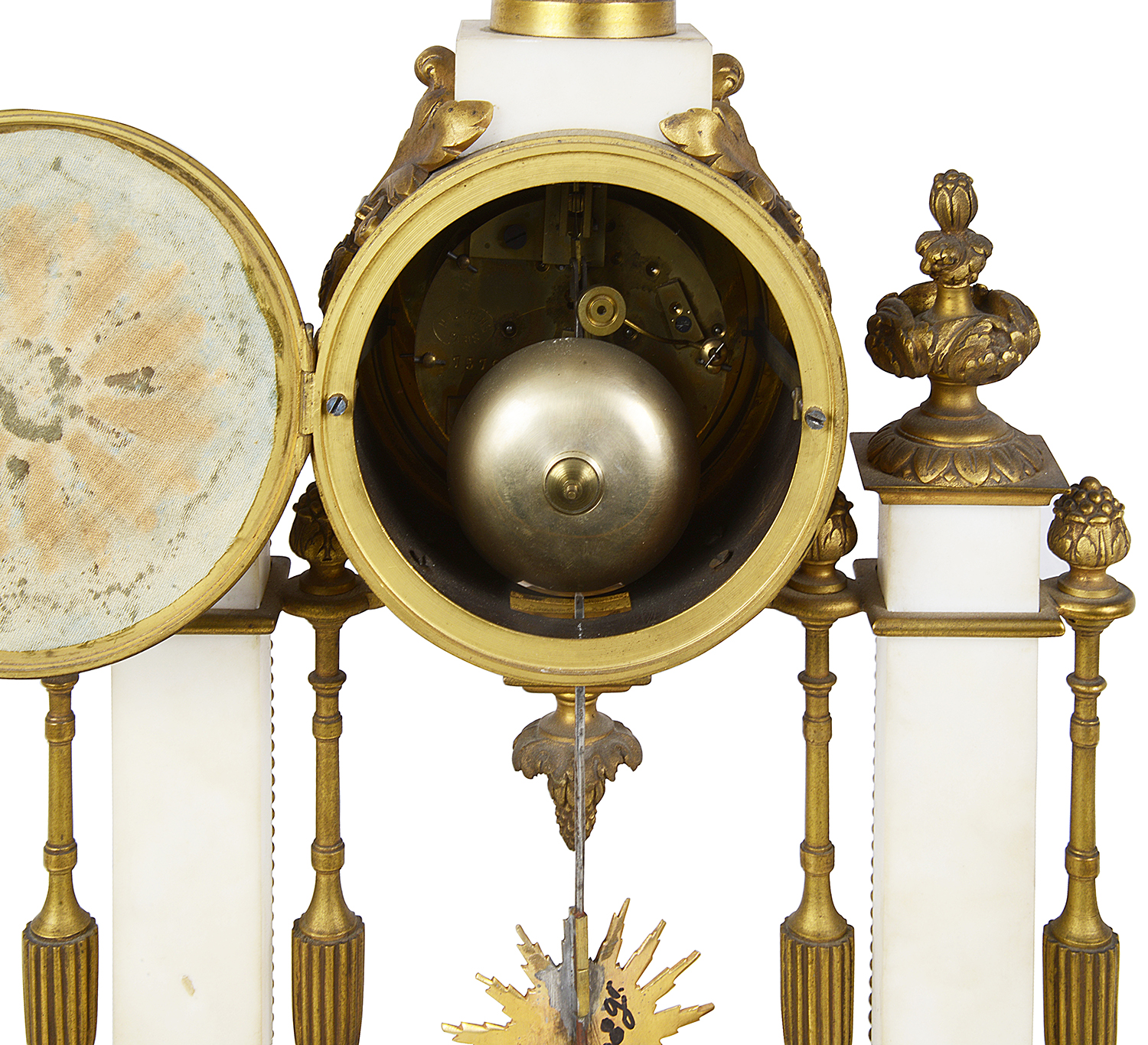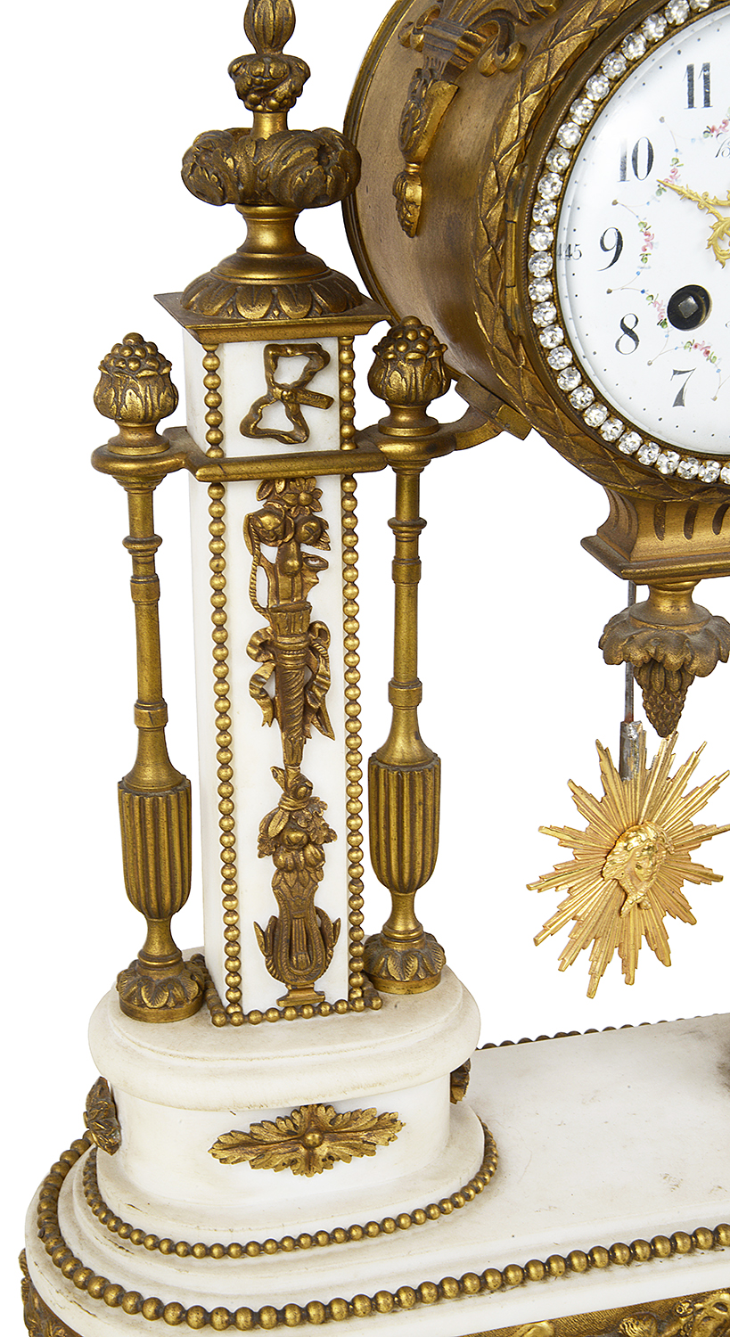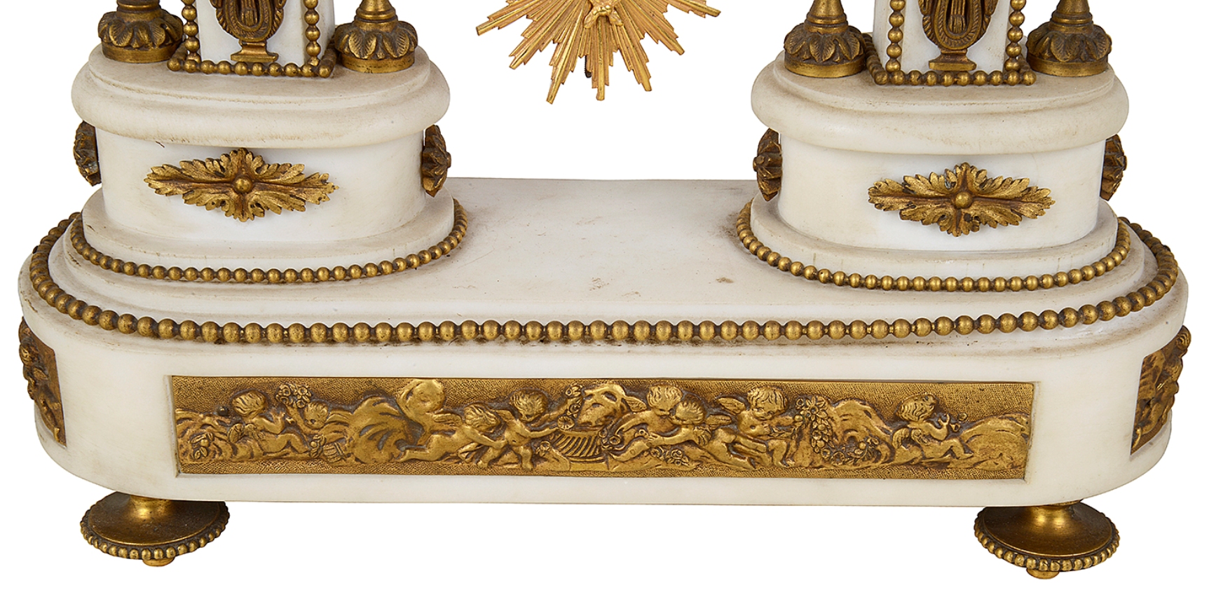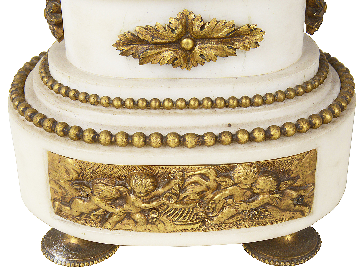 French 19th Century Louis XVI style white marble and gilded ormolu clock garniture, having a two handled urn finial above a white enamel clock face, an eight day duration clock that strikes on the hour and half hour. Flanked by a matching pair of five branch candelabra.