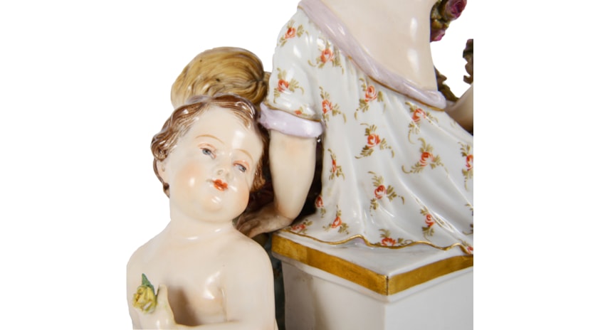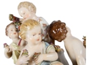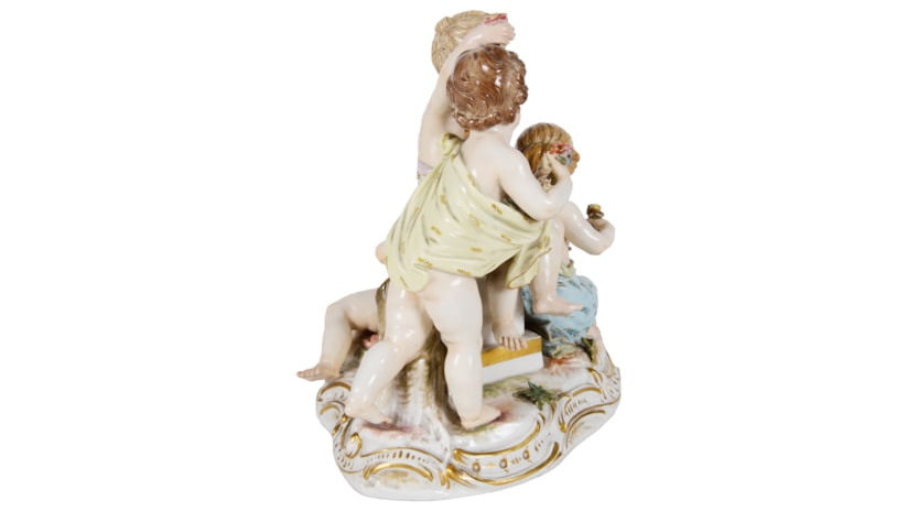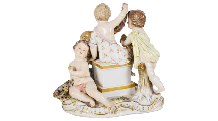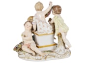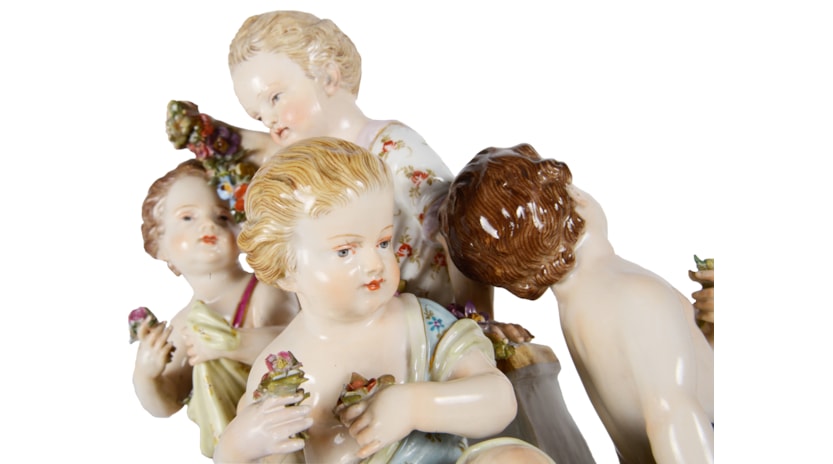 An enchanting fine quality 19th Century Germany, Meissen Porcelain group of four children representing 'Spring' Having wonderful bold colouring and a blue crossed swords signature to the base.