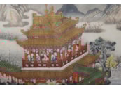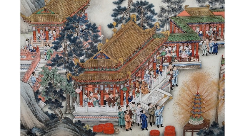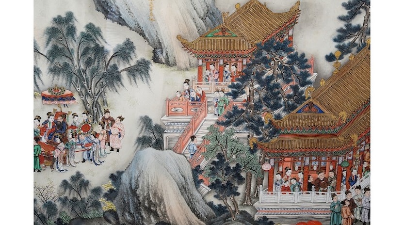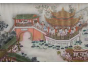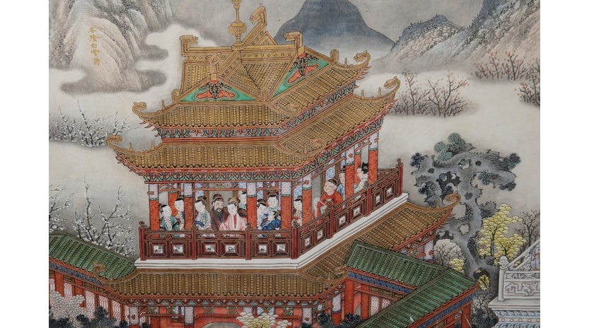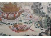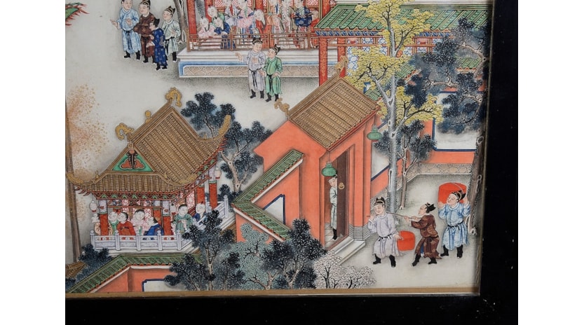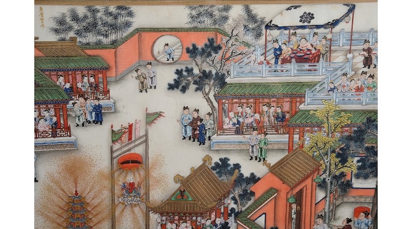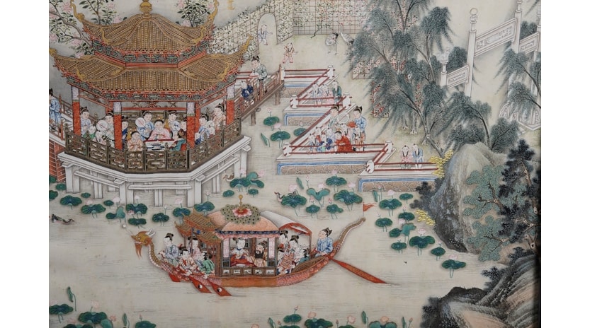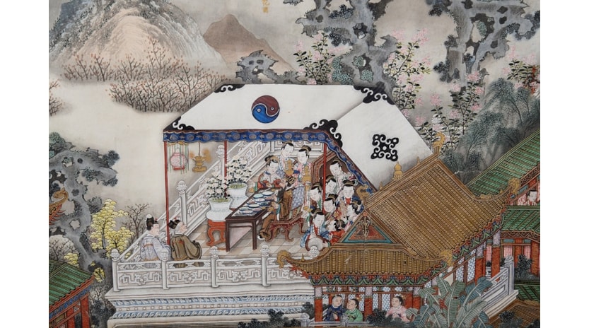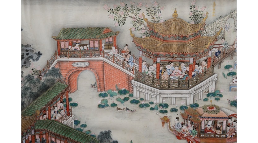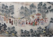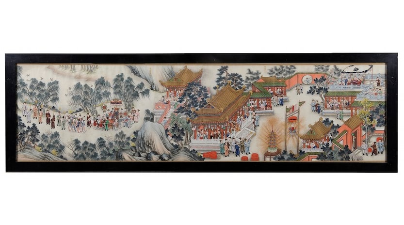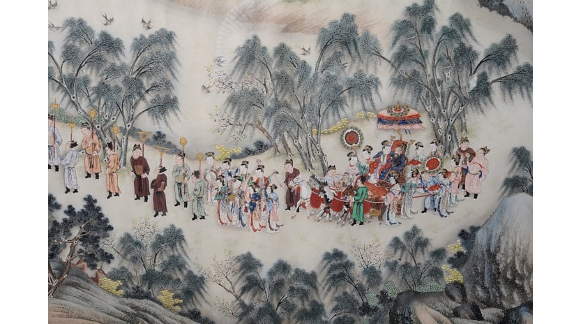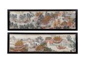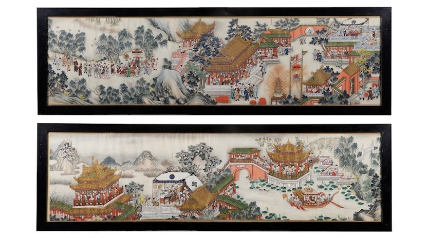 Pair 19th Century Chinese hand painted scrolls of processions.