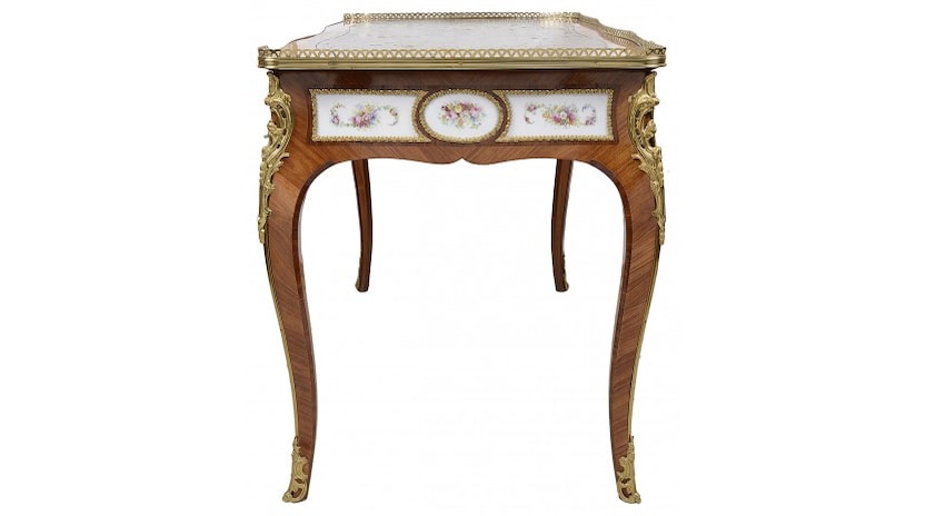 A beautiful French 19th Century Sevres style porcelain mounted bureau plat, having an inset leather top with a three quarter brass gallery, three frieze drawers, inset porcelain panels on all four sides, each with hand-painted floral decoration. Raised on elegant cabriole legs, gilded ormolu mounts and terminating in scrolling feet..