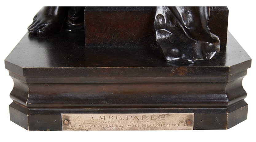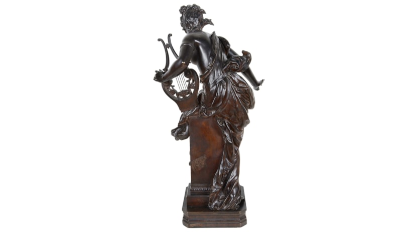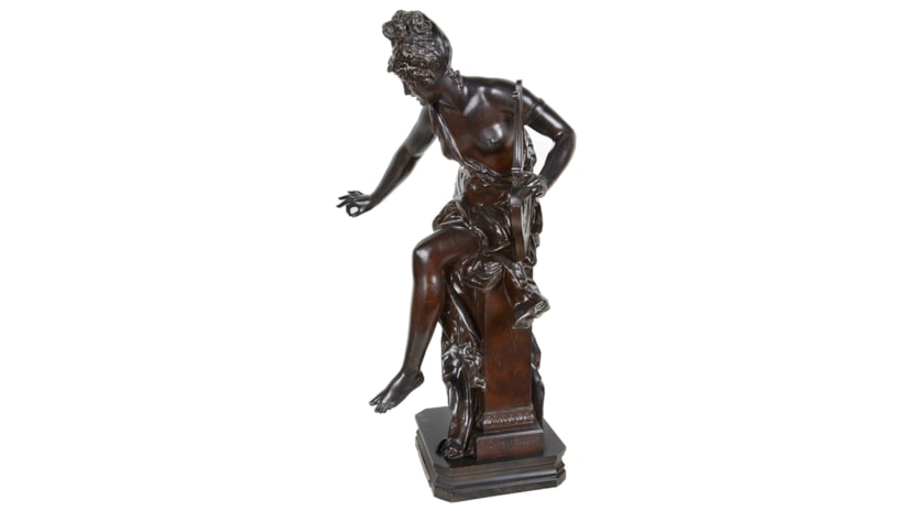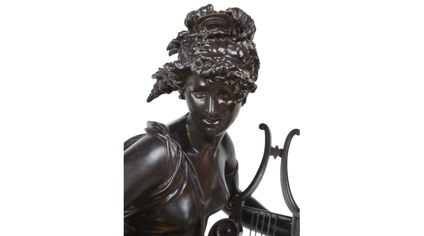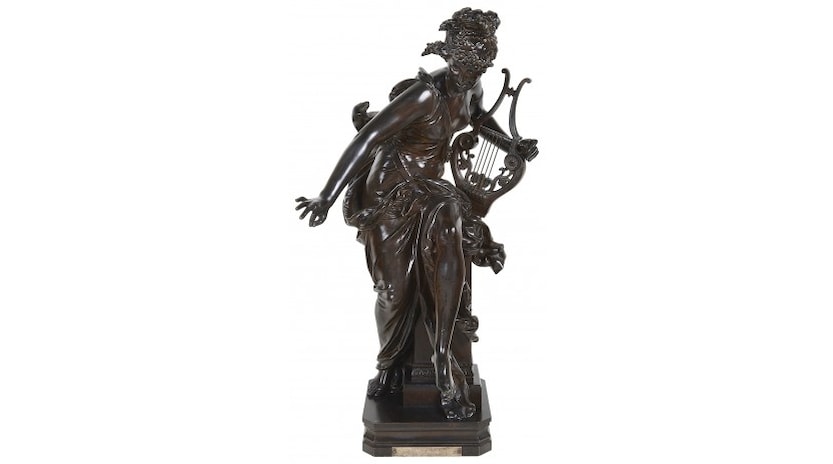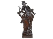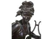 Carrier-Belleuse bronze female statue holding a harp, 'Harmone' 19th Century.