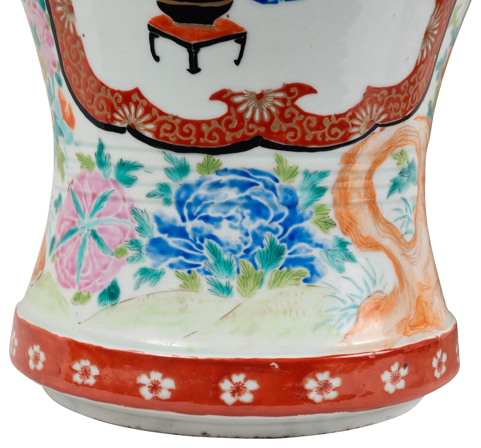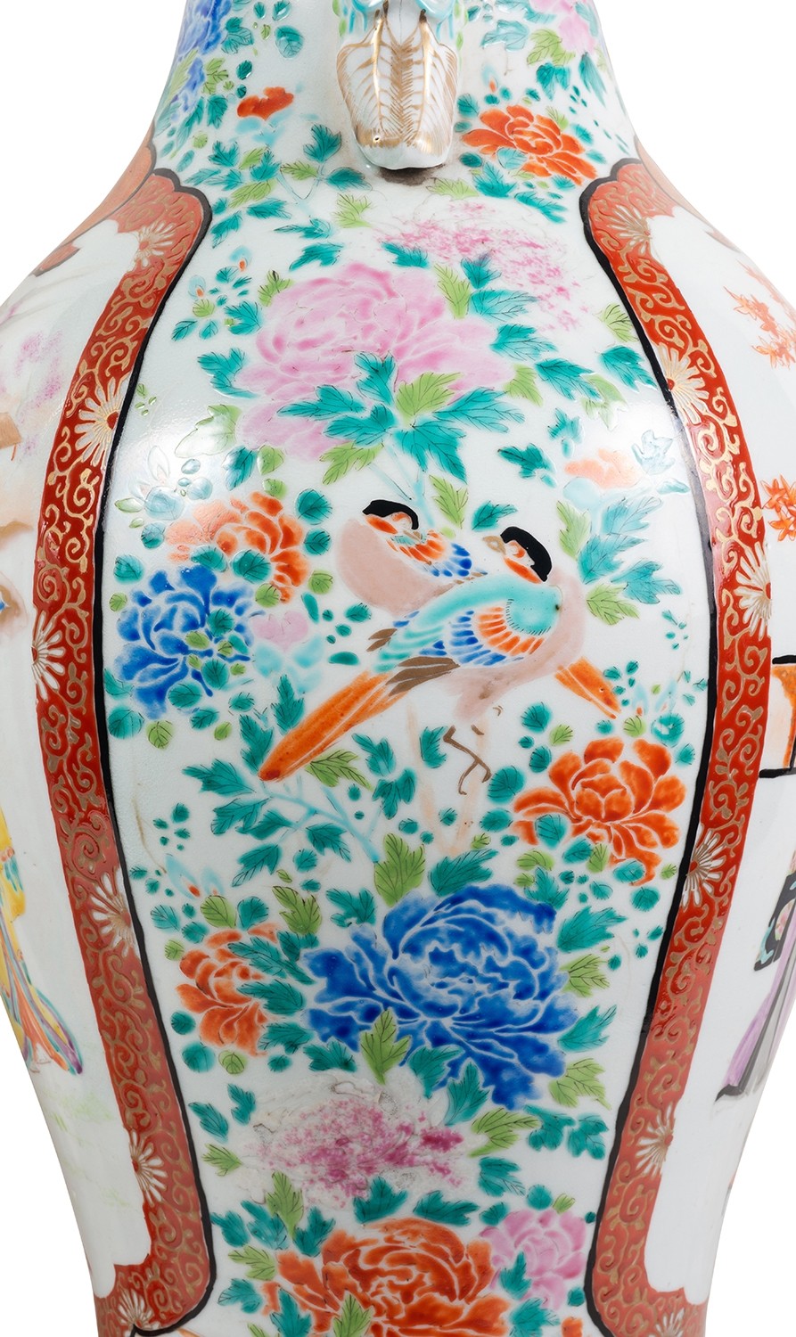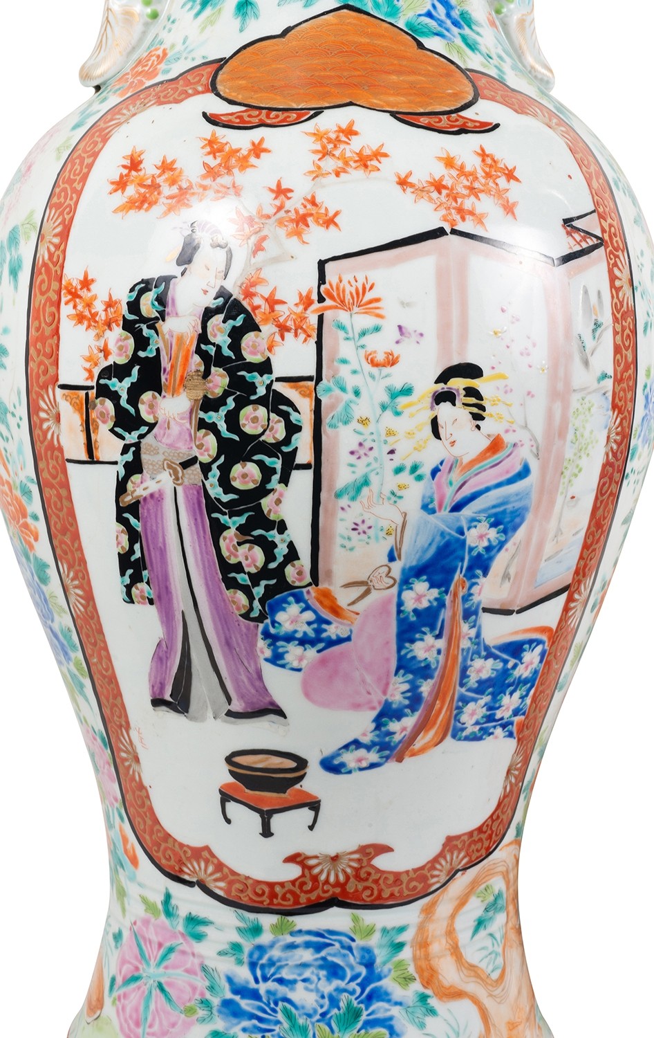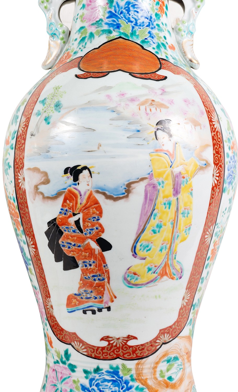 An impressive and very decorative pair of Meiji period (1868-1912) Japanese Kutani porcelain vases, each with wonderful exotic floral decoration to the ground, inset hand painted panels depicting a swords man looking over a Geisha girl cutting flowers.