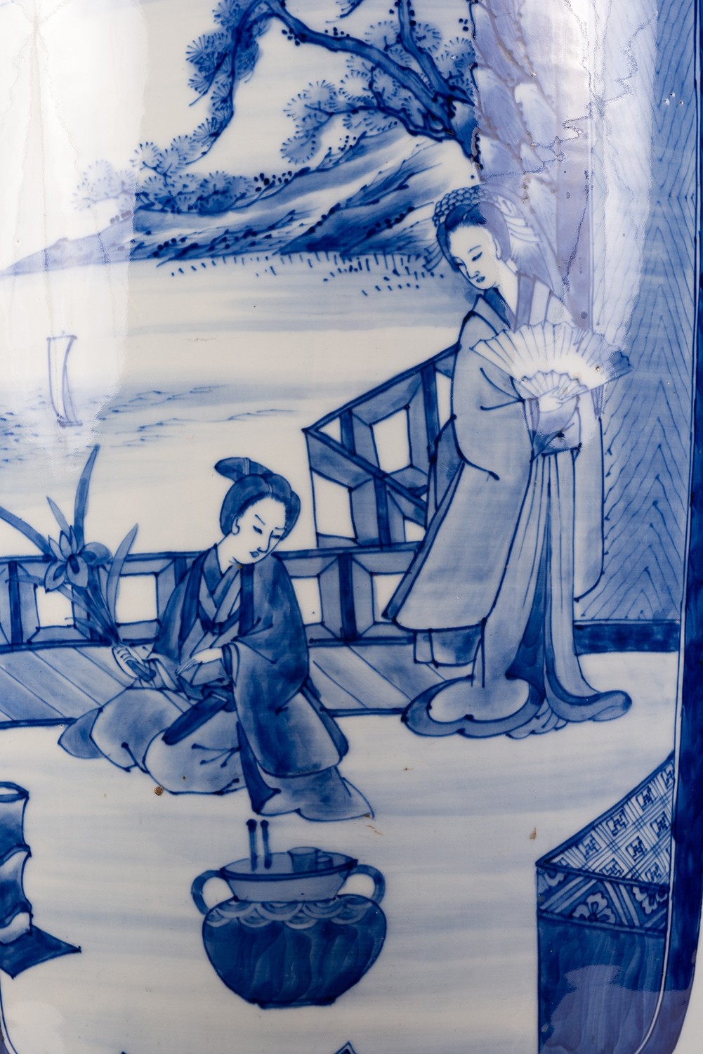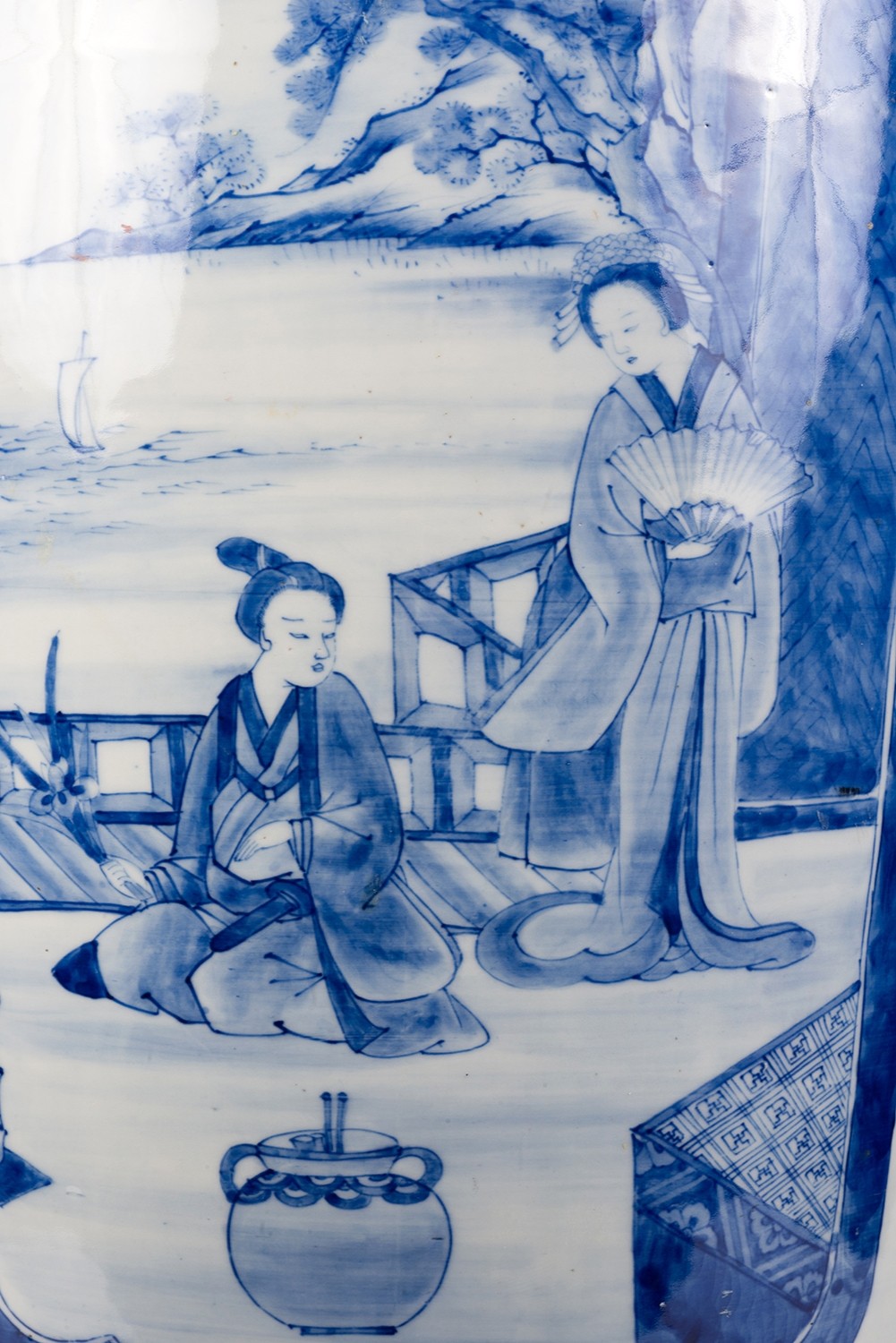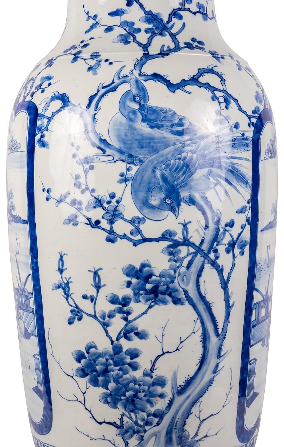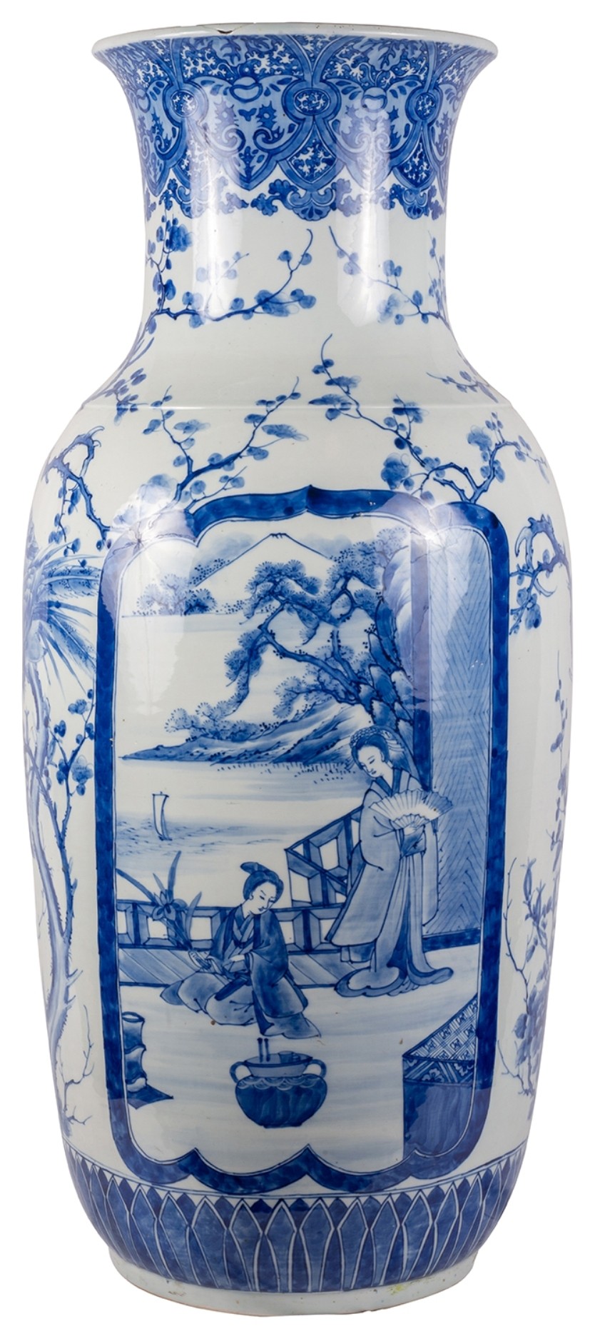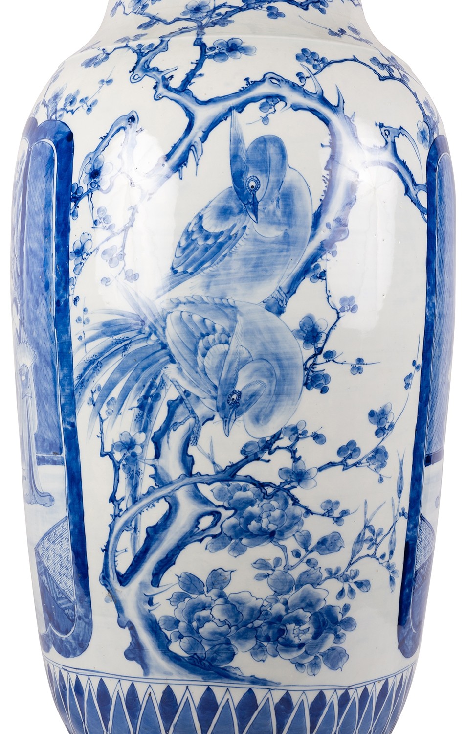 A very impressive pair of Japanese Meiji (1868-1912) period Blue and White porcelain vases, each with wonderful classical motif decoration to the neck and base. Blossom trees to the ground and inset hand painted panels depicting Geisha girls in attendance.