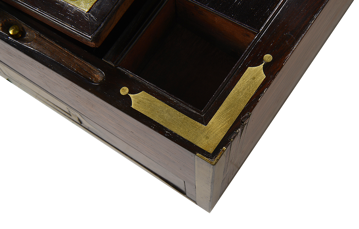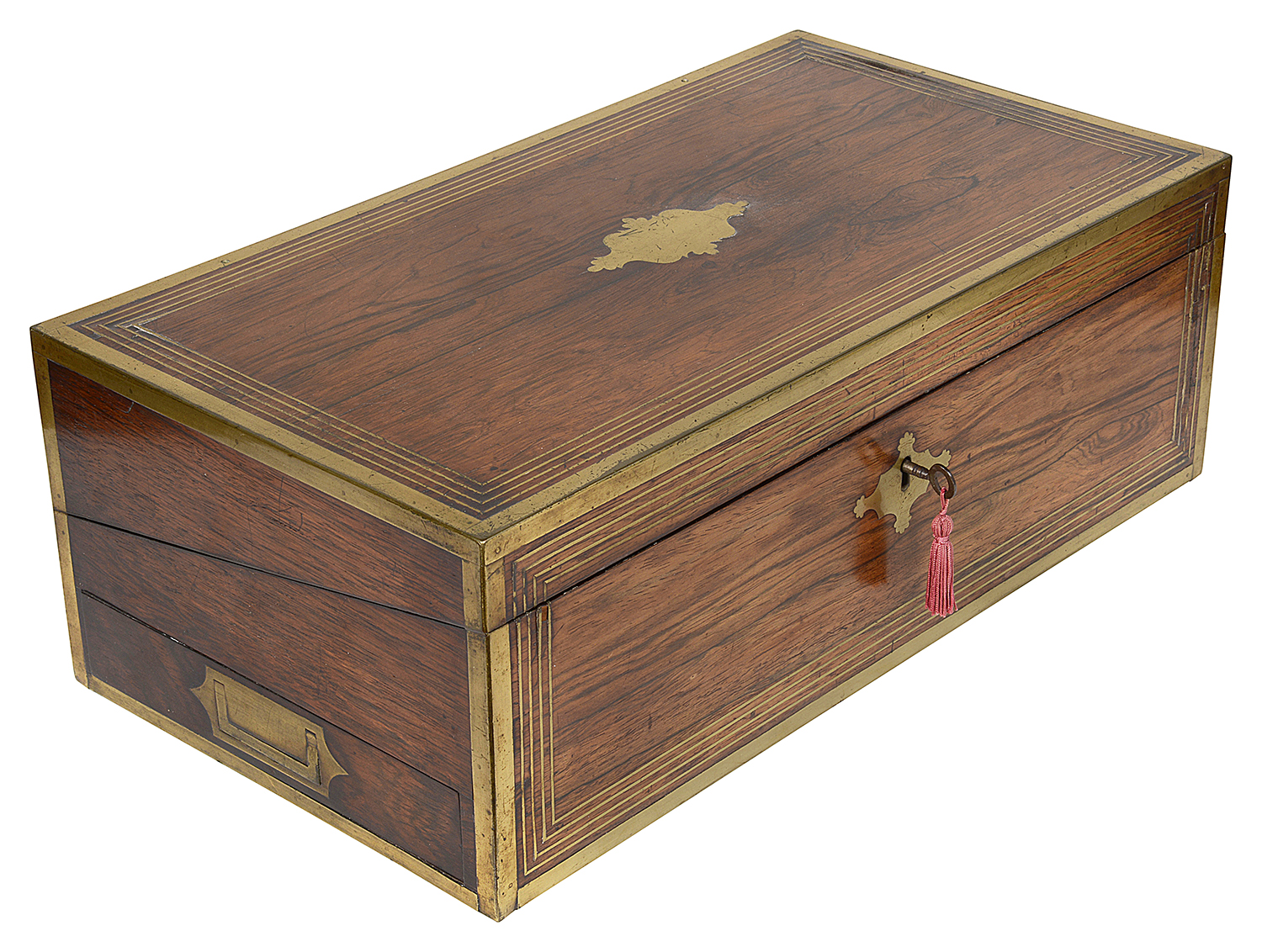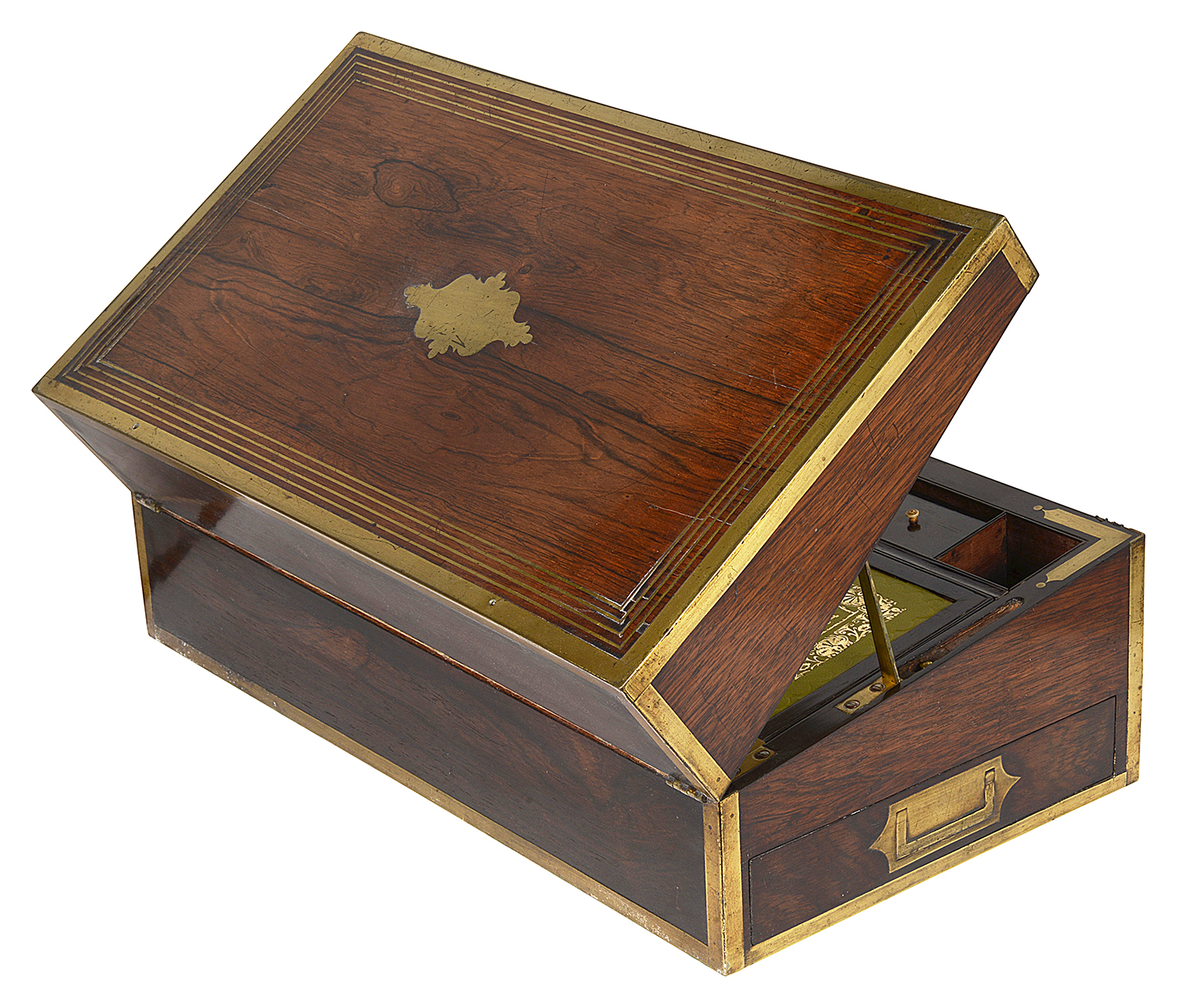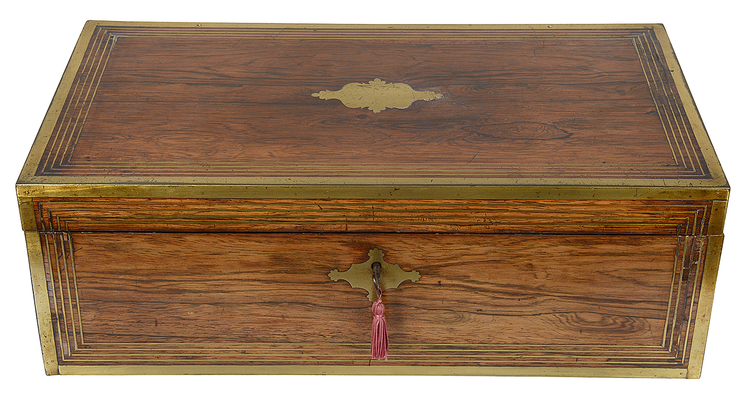 A very good quality early 19th Century Regency Rosewood, brass inlaid writing slope, with a hinged lid openeing to reveal a writing slope within, compartmented, an inset leather tablet, and a drawer to the side. Circa 1820.