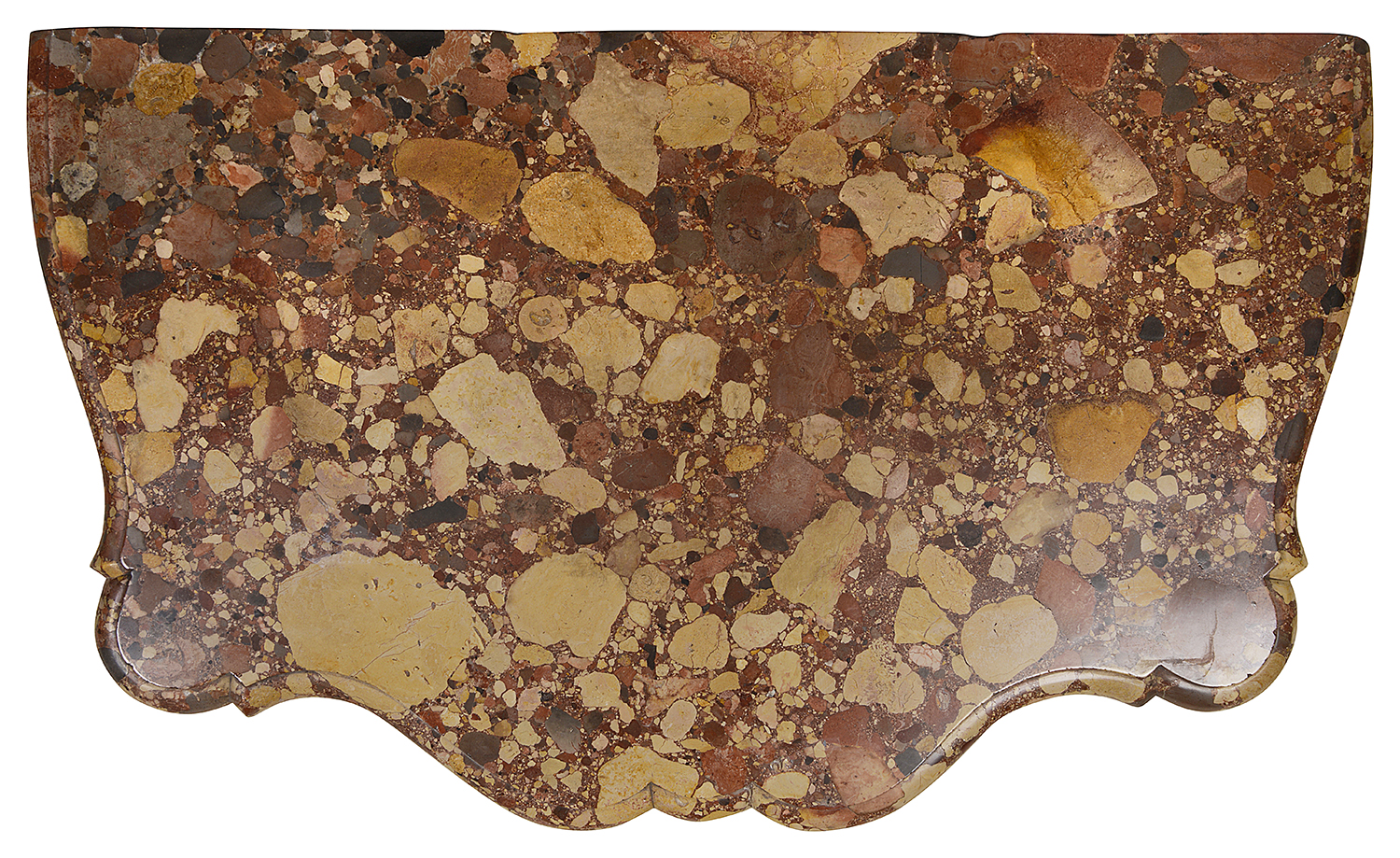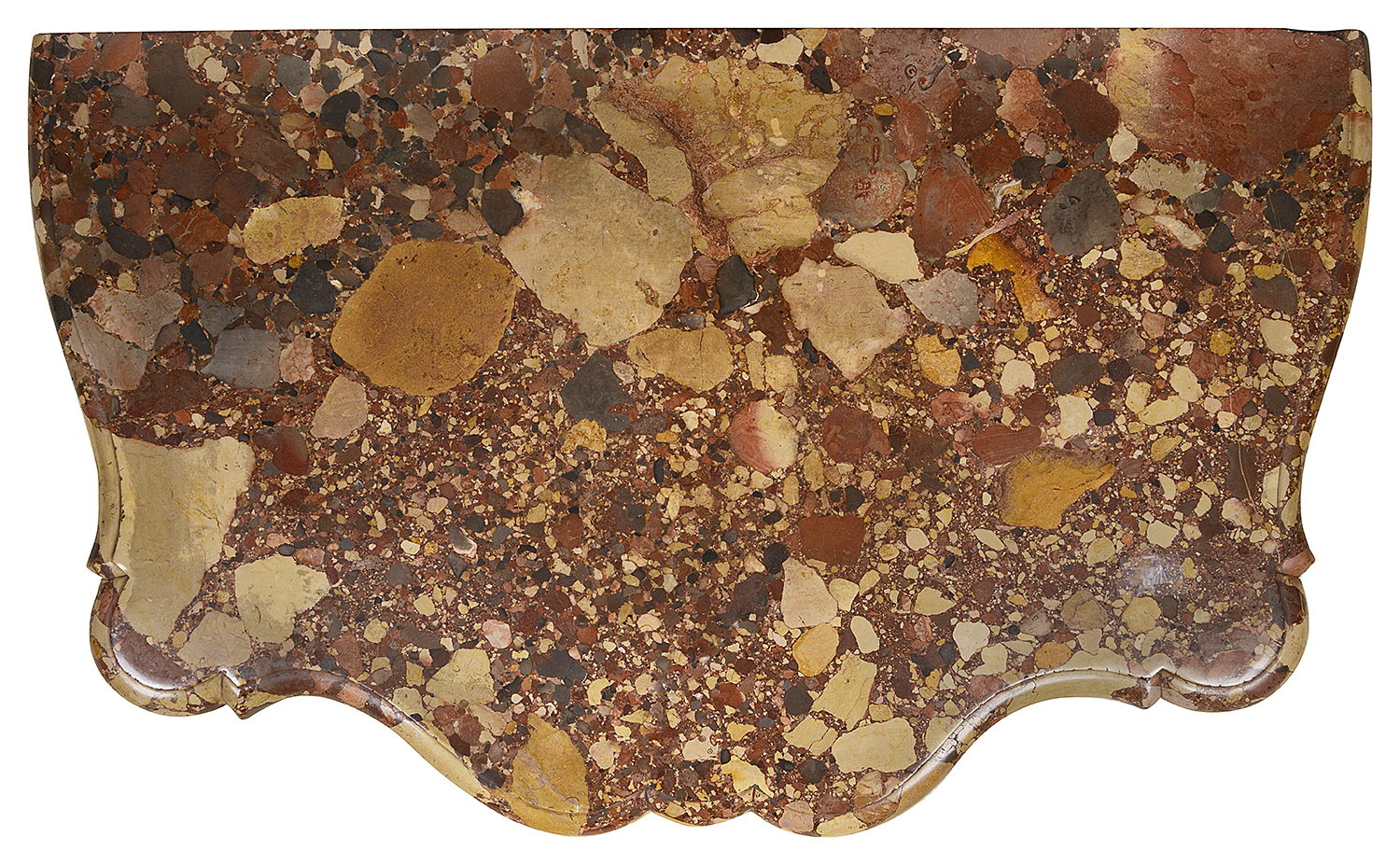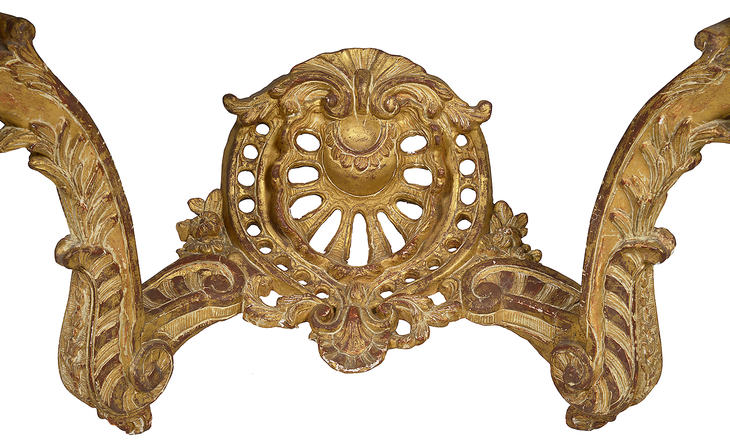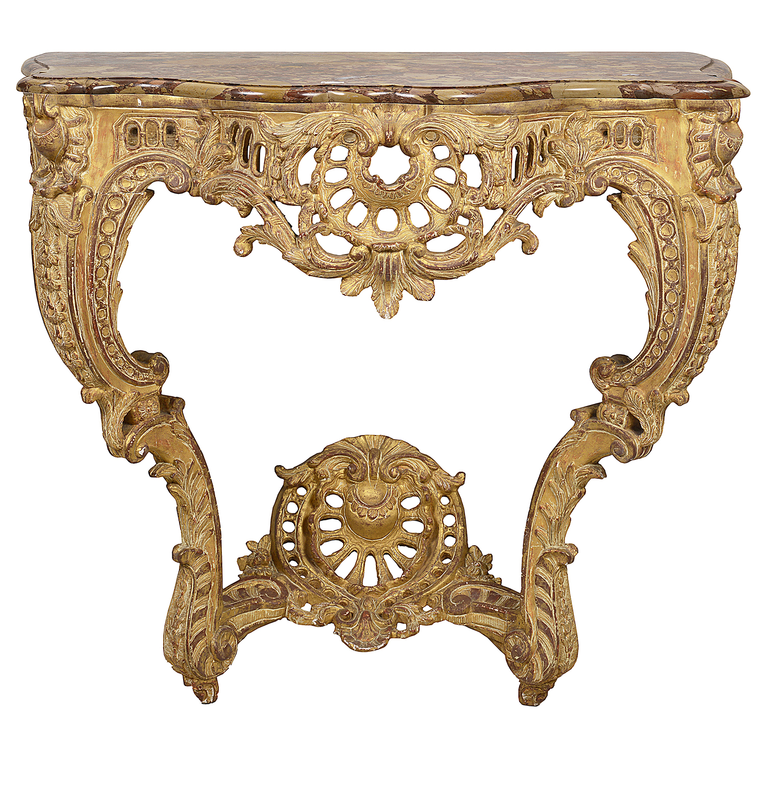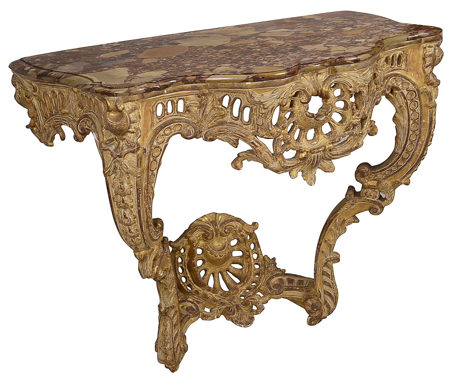 A very impressive pair of french 18th Century carved gilt wood console tables, each with their original Breccia marble tops. Wonderful scrolling rococo influenced foliate decoration with pierced fretwork, raised to the frieze and raised on carved cabriole legs, united by a pierced shell stretcher beneath.