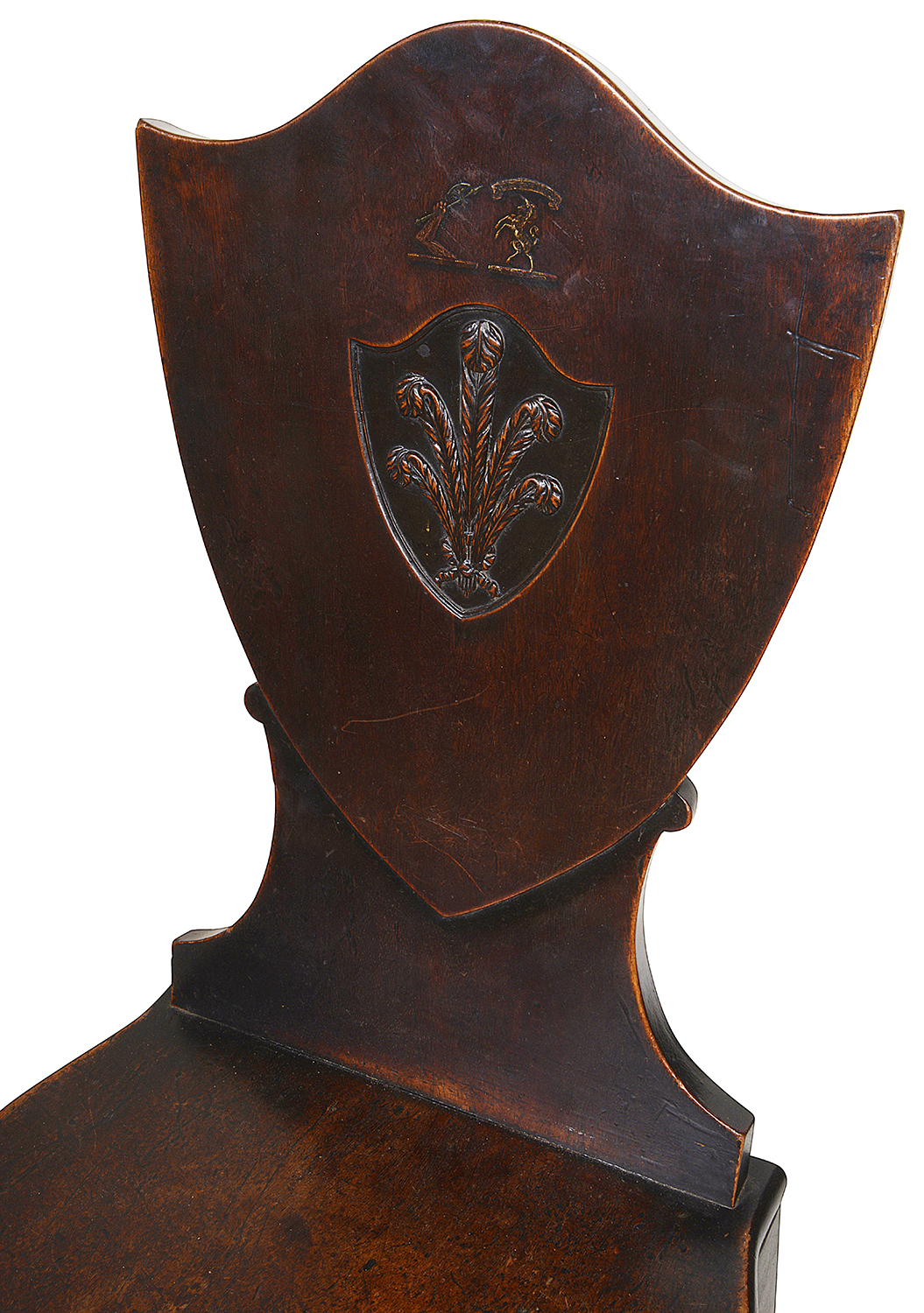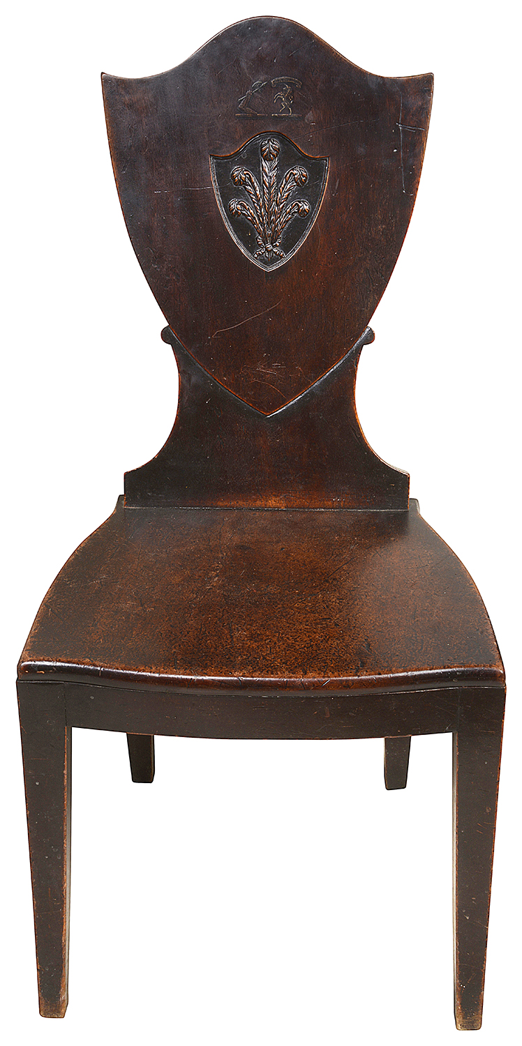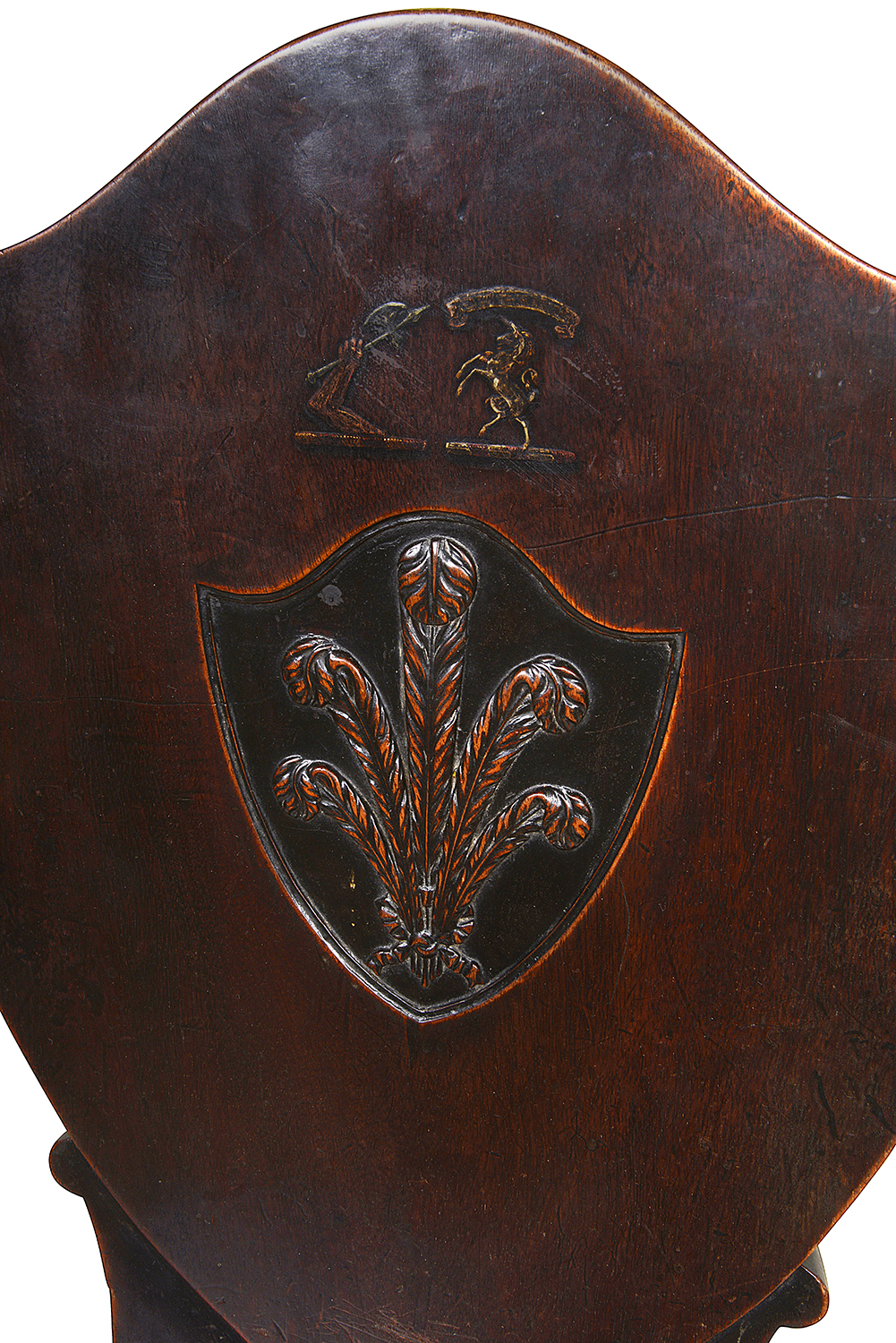 Pair 18th Century Mahogany Hall chair, Prince of Wales feathers.