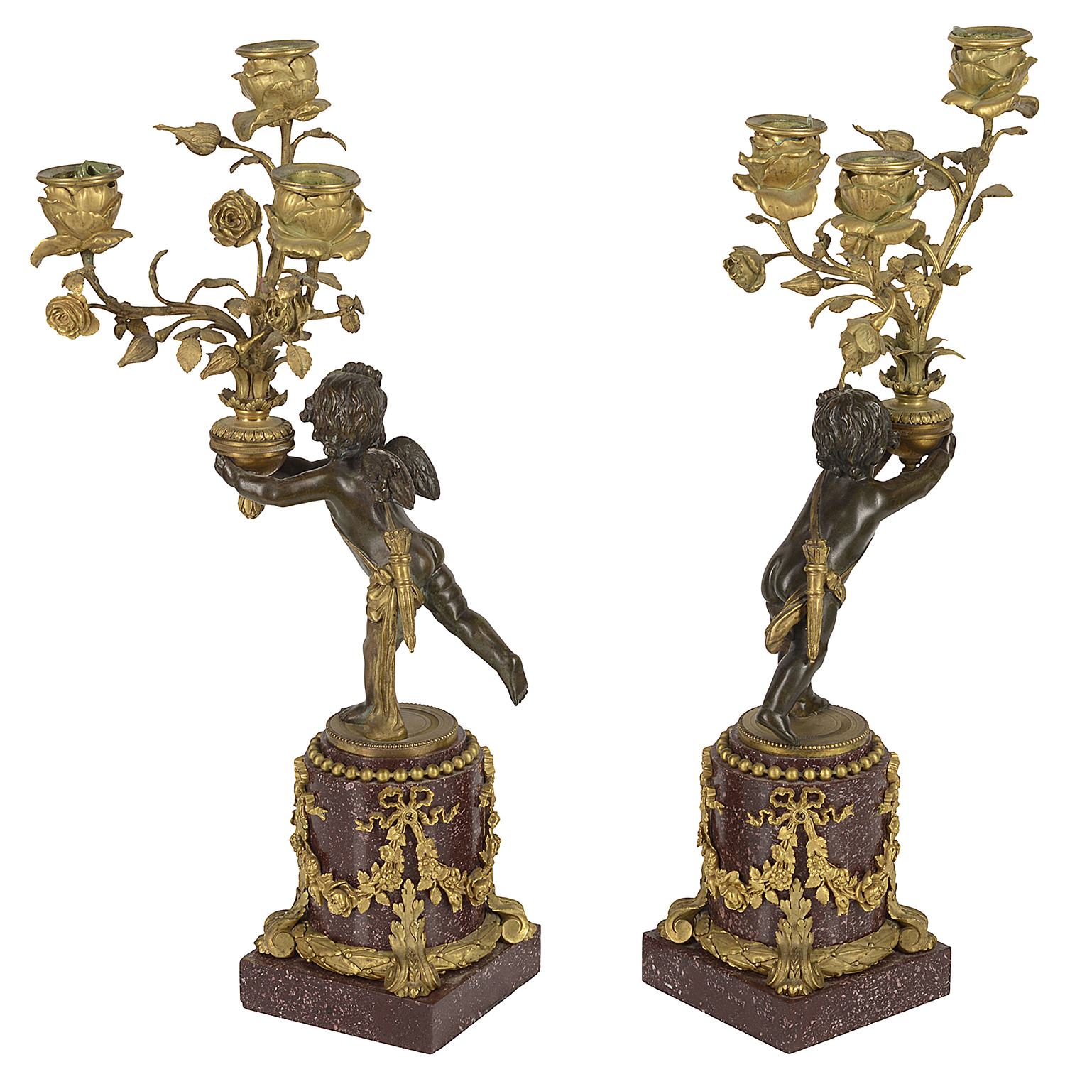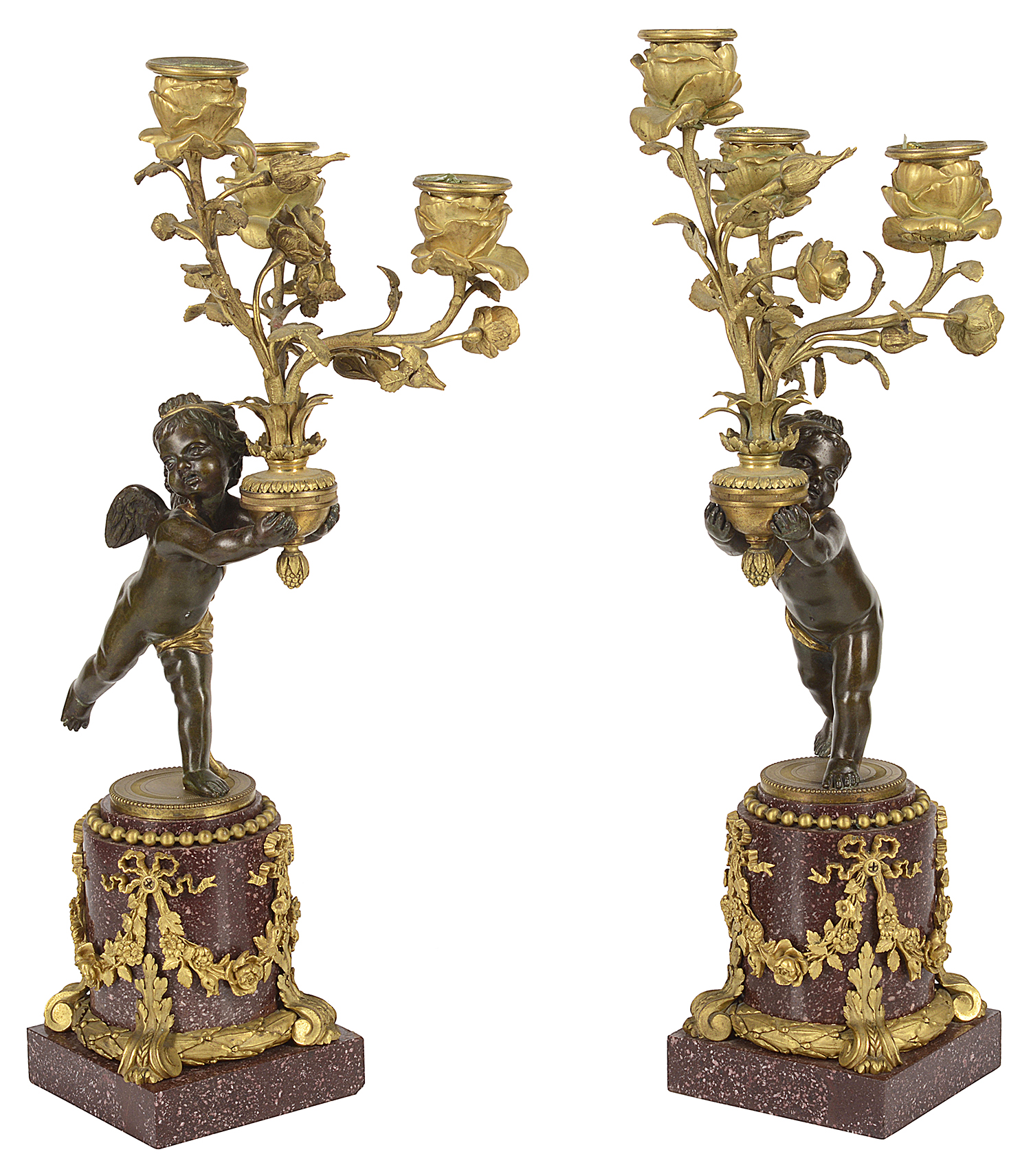 Fine pair 19th Century ormolu and Porphyry candelabra, attributed to Henry Dasson