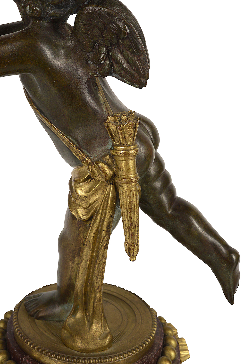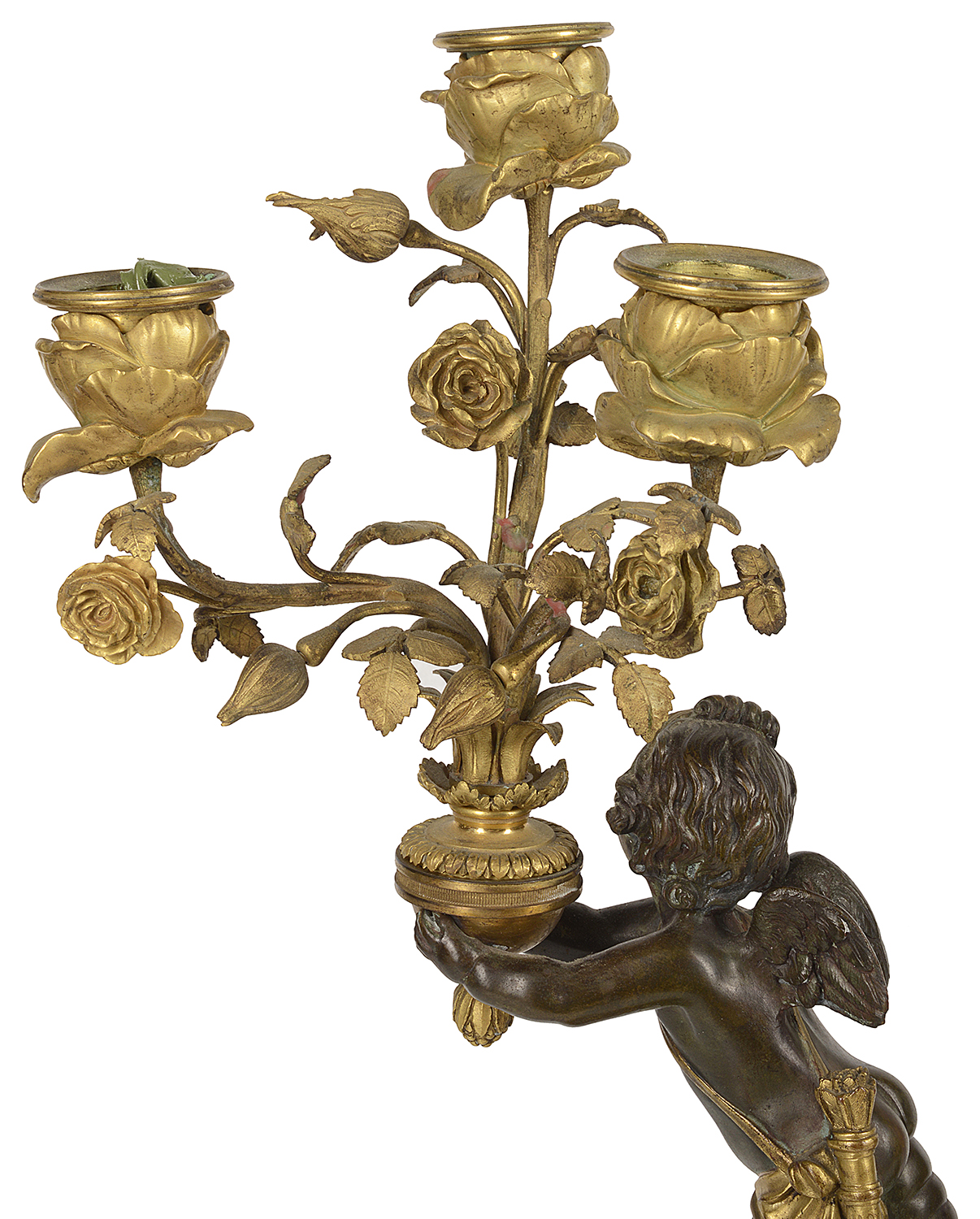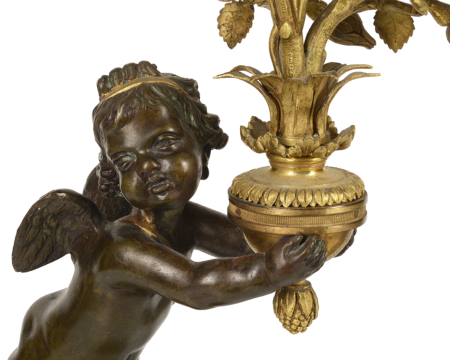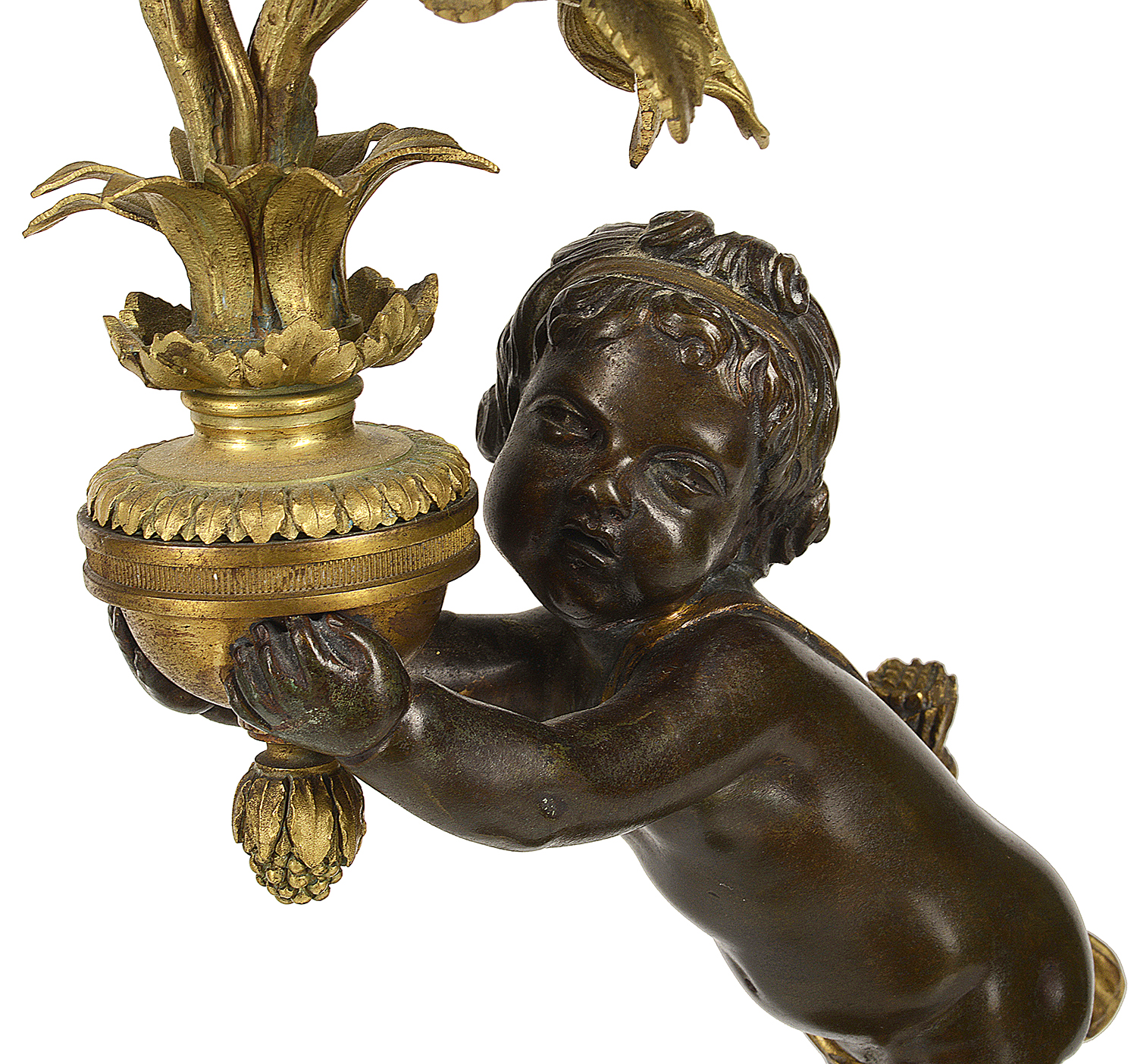A rare and fine quality pair of 19th Century gilded ormolu, patinated bronze   cherubs, each holding a three branch scrolling foliate candelabra with floral sconces, raised on these wondereful Porphyry pedestal bases with ormolu swag mounts. Attributed to 'Henry Dasson'