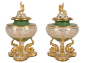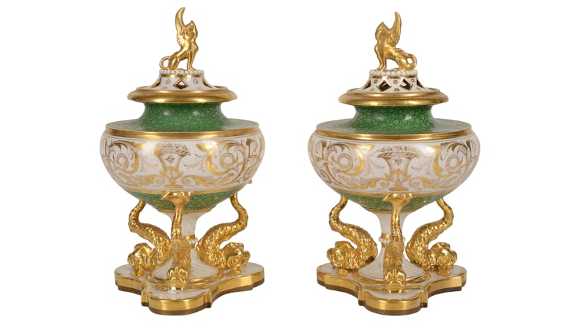 A fine and rare pair of early 19th Century Royal Worcester, Flight Barr & Barr hand painted porcelain lidded urns. Each with this wonderful green ground, the pierced lids with gilded sphinks finials, classical scrolling decoration with inset scenes of sea shells, raised and supported by a three gilded Dolphins and plinth bases.