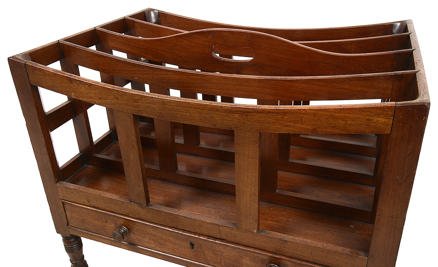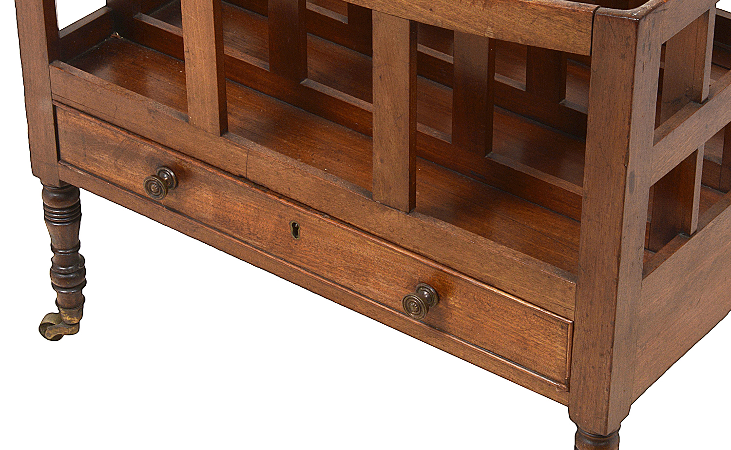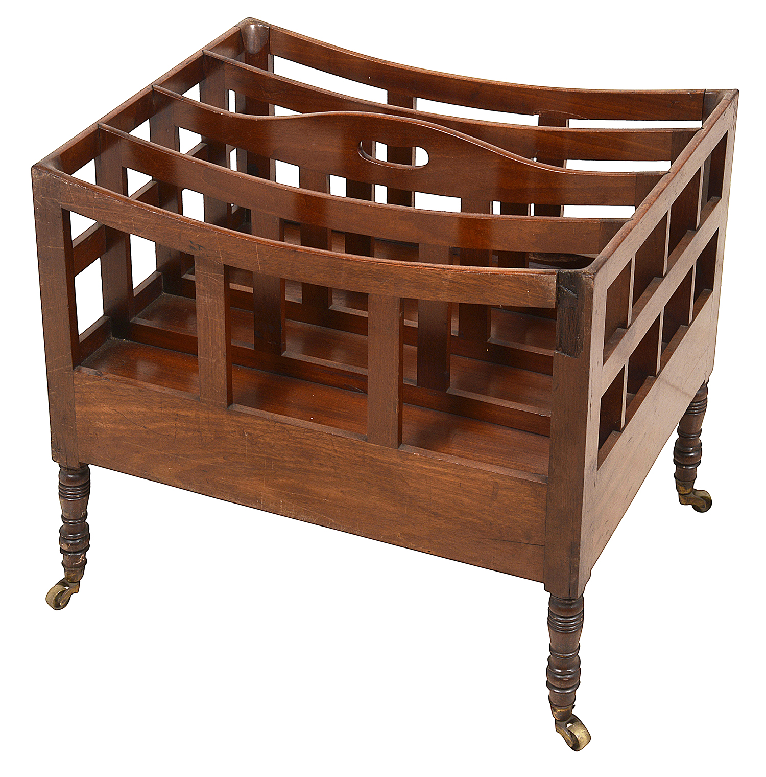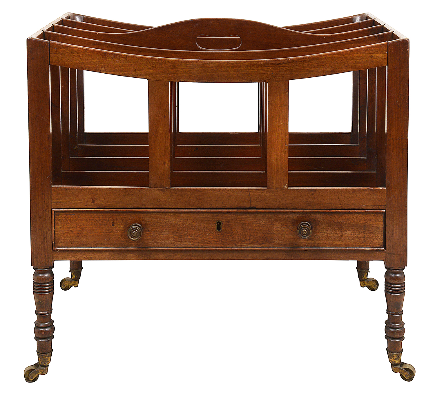 A very good quality Regency period Mahogany music canterbury, having four divisions, a freize drawer and raised on turned tapering leg with the original brass castors.