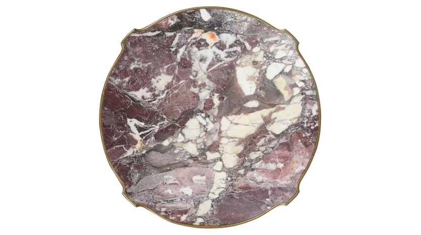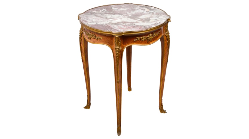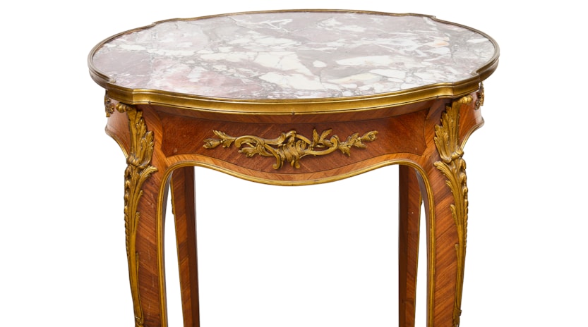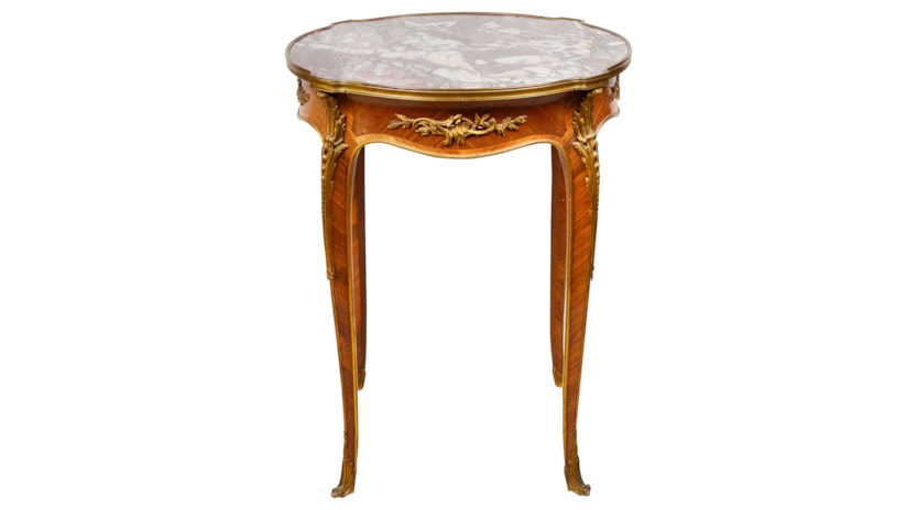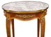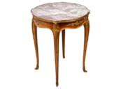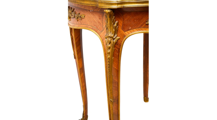 Having wonderful gilded ormolu scrolling foliate mounts and moulding, an inset rouge marble top and raised on elegant cabriole legs, terminating in scrolling ormolu feet.
