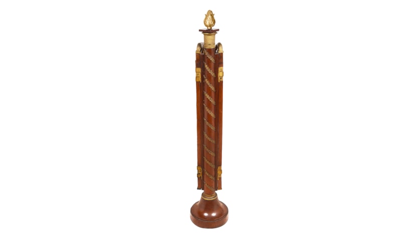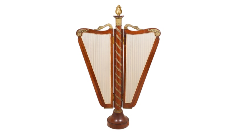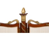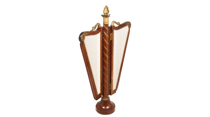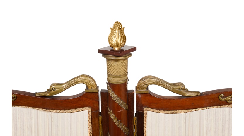 A very stylish 19th Century French Mahogany Empire influenced folding fire screen, having an ormolu finial, a pair of Swans head mounts and scrolling foliate decoration twisting around the central column. Each leaf hinged and raised on a turned base, circa 1880.