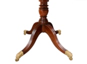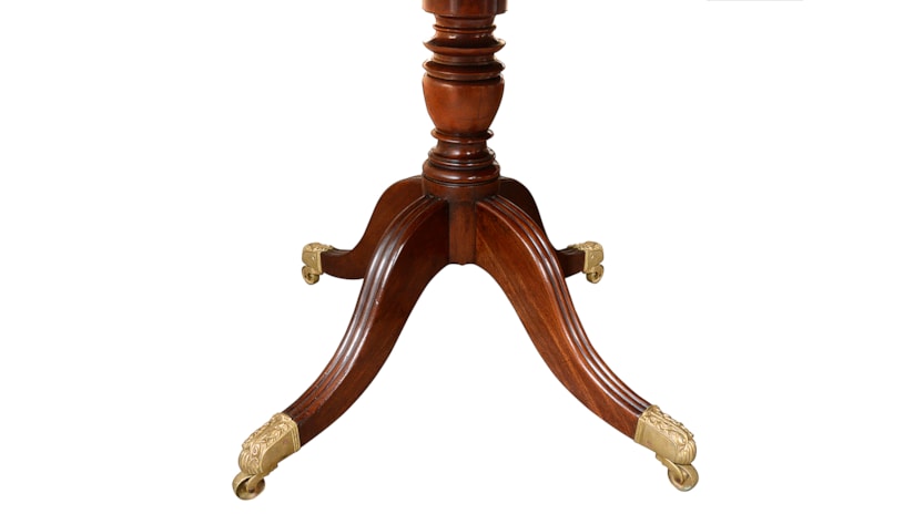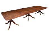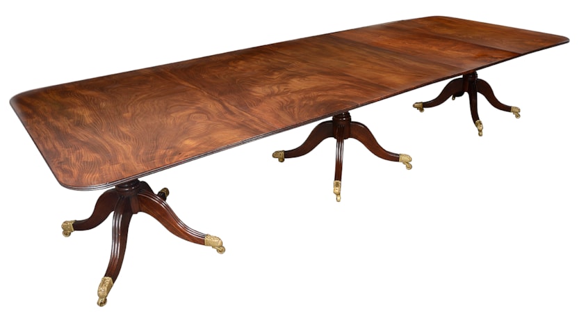 A very imposing and good quality Regency period Mahogany triple pedestal dining table, with two extra leaves, having this wonderful figuring and patina to the top, raised on three four splay pedestals each with reeded decoration to the legs, terminating in the original scrolling folate decorated and gilded brass castors. Circa 1820