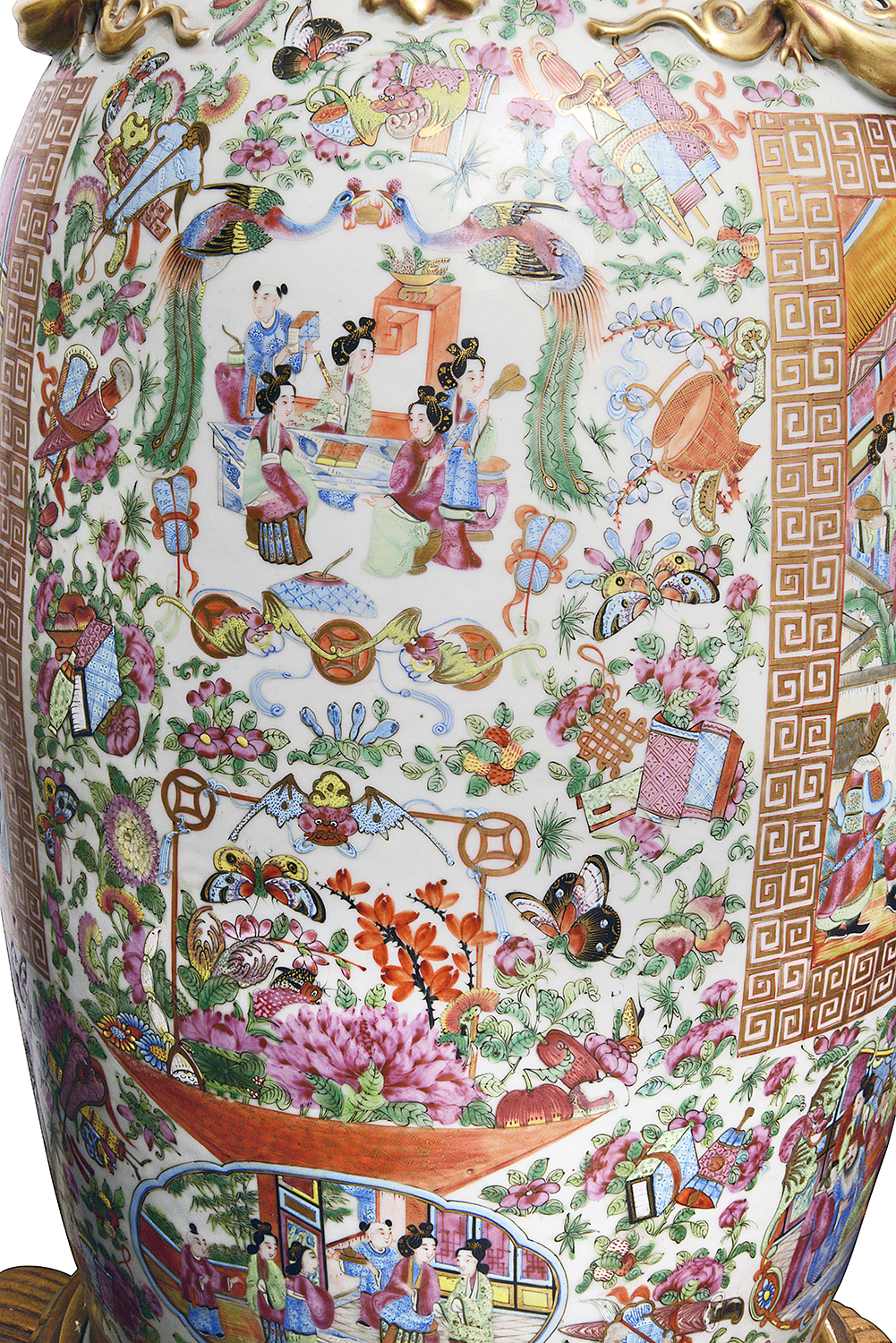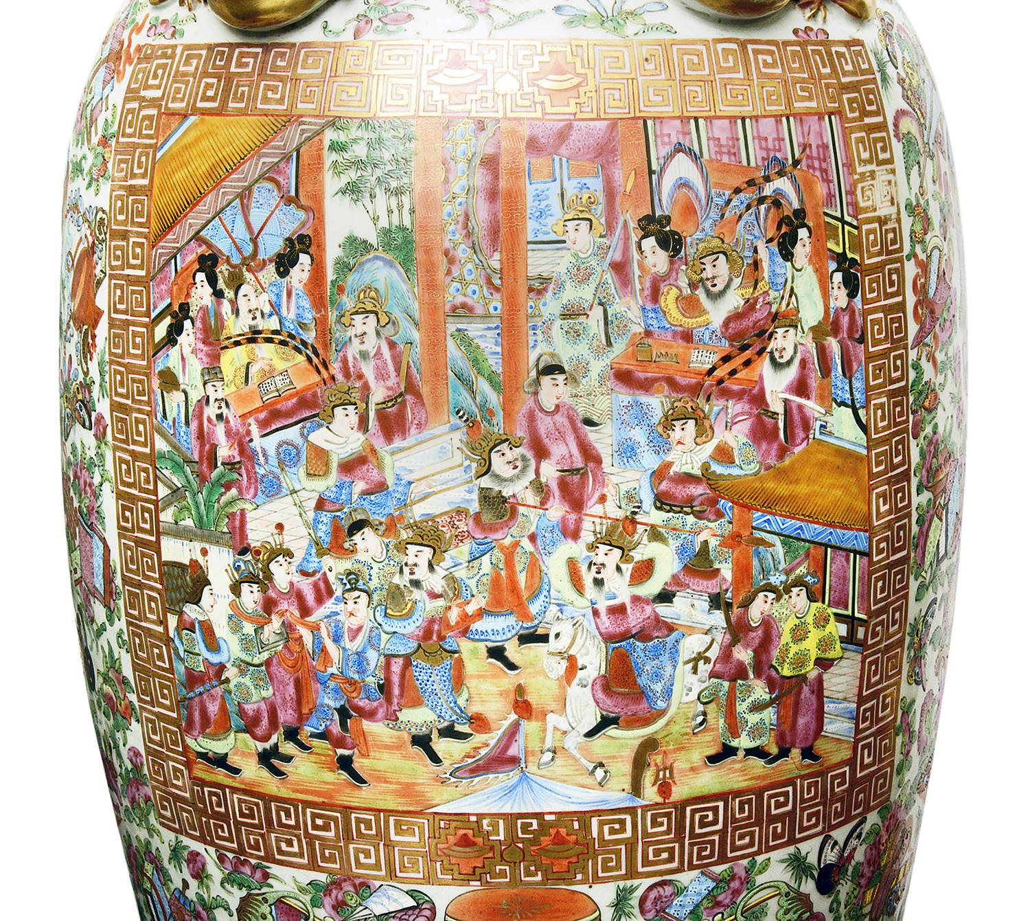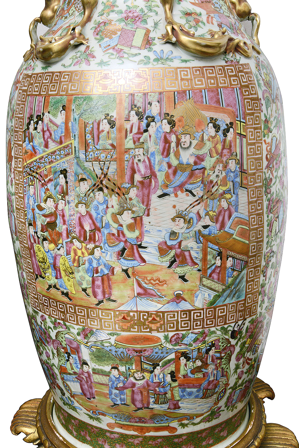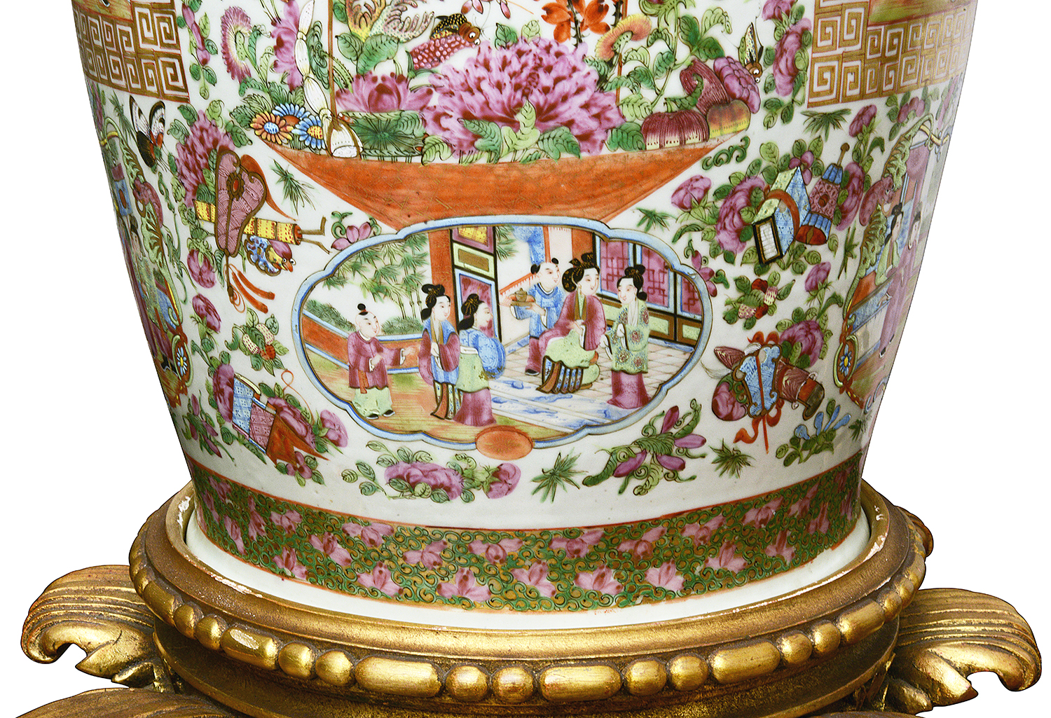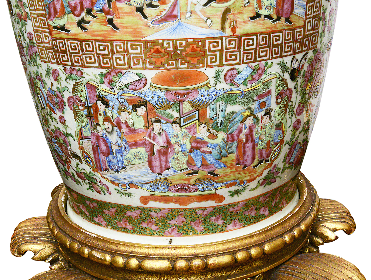 Each with classical green ground, inset hand painted panels depicting various male and female courtiers in the grounds of pagoda buildings. Mounted with gilded Foo dog handles and lizard mounts. Raised on hand carved classical gilt wood pedestals, circa 1880.