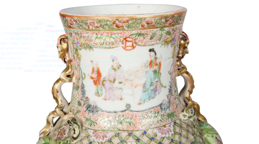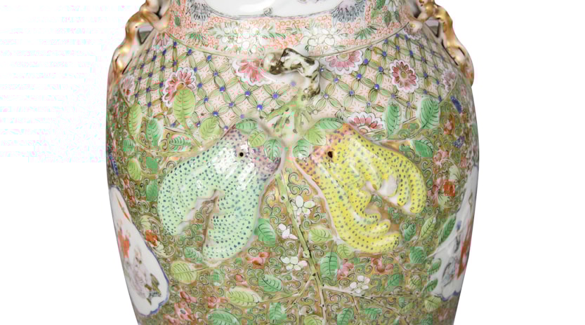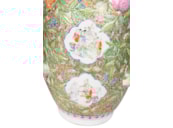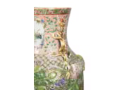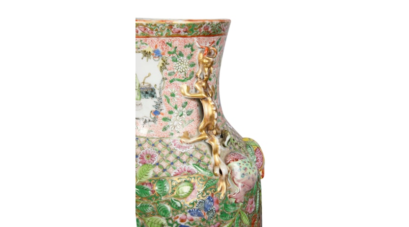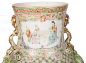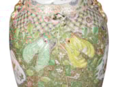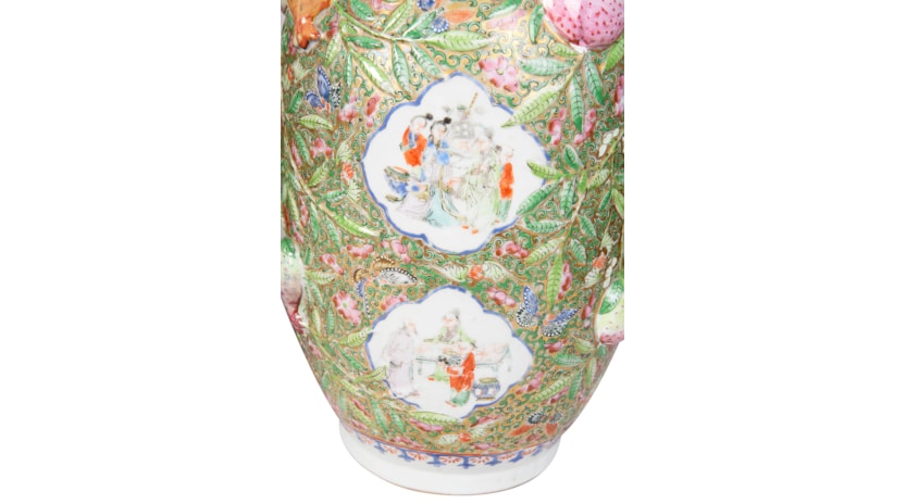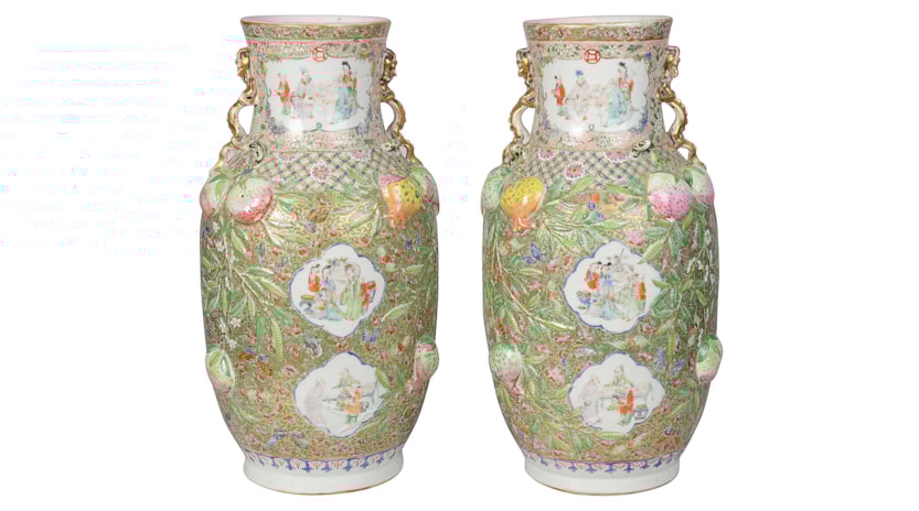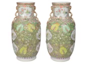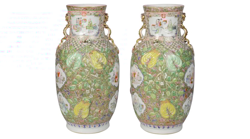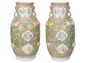 A very good quality rare and unusual pattern pair of Rose Medallion vases. Each with wonderful bold colouring with the classical green ground, gilded and pink high lights to the raised fruit. Inset hand painted panels of various chinese courtiers, women and children.