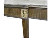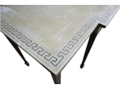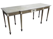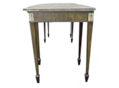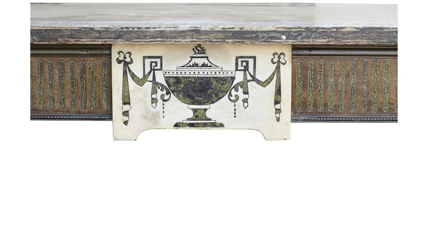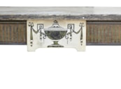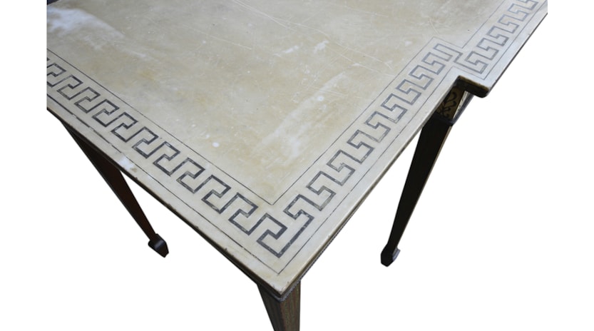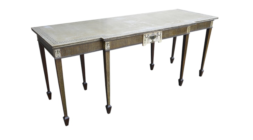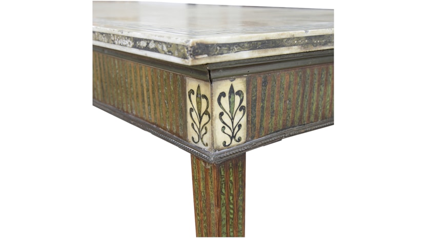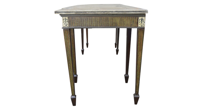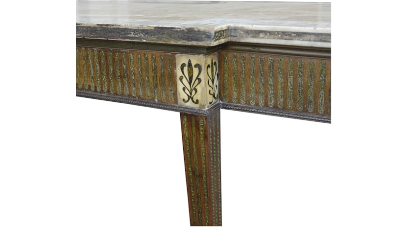 An impressive 19th Century classical influenced marble topped console table, having inlaid Greek Key pattern to the break fronted top. Inlaid faux Malachite fluting to the freeze, an urn to the central tablet and raised on square tapering inlaid legs terminating in spade feet.