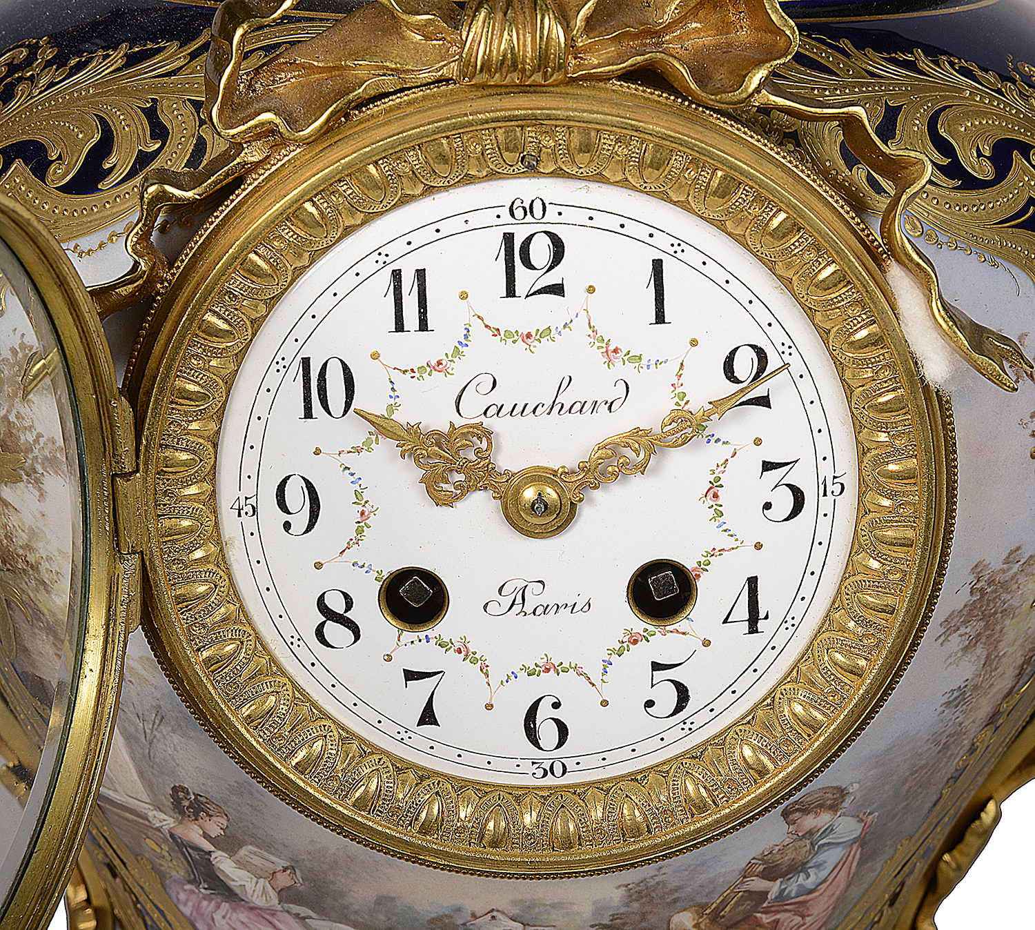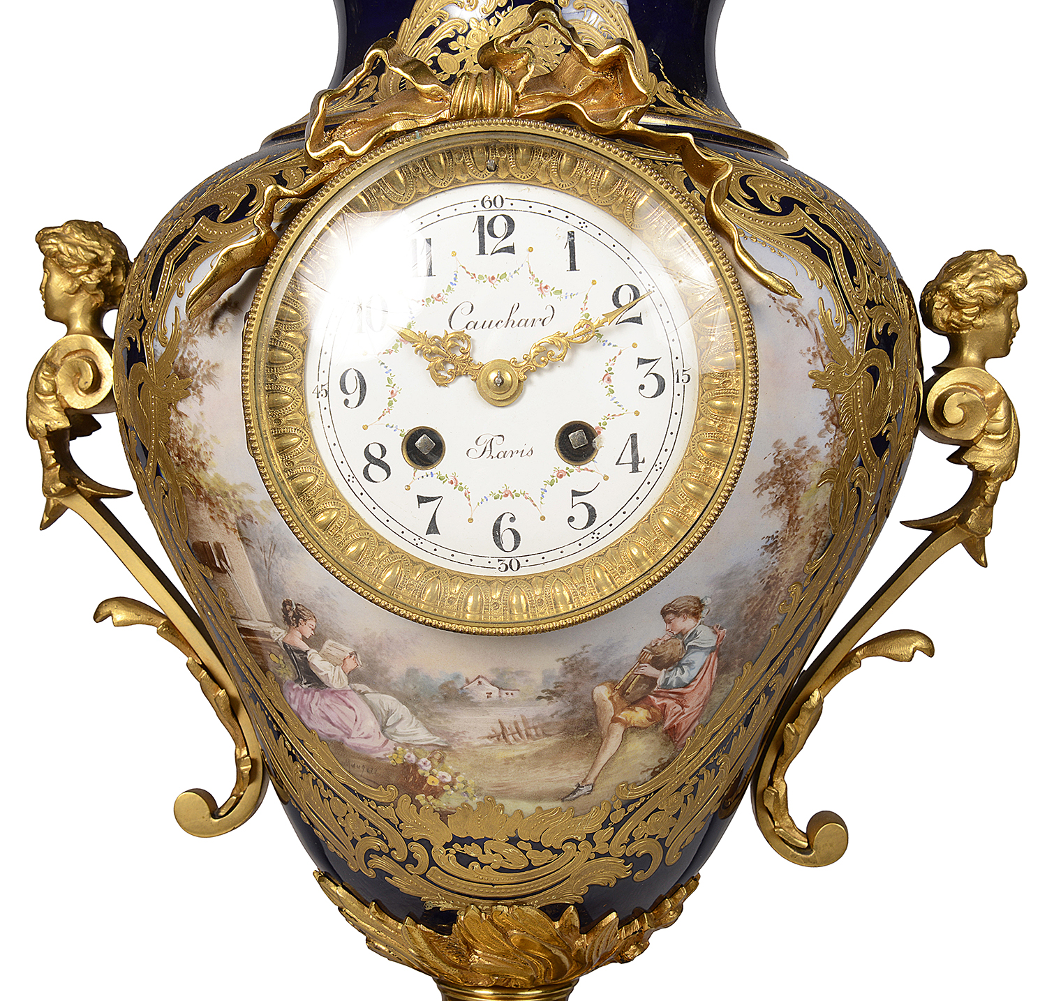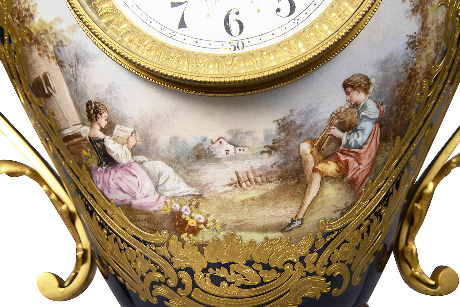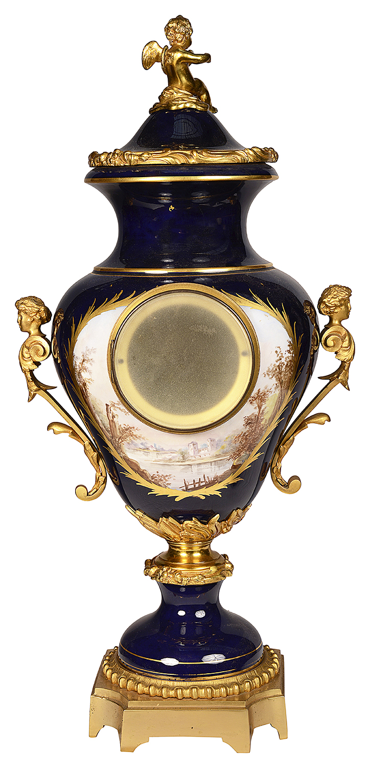 A very good quality late 19th Century French Sevres style porcelain lidded vase / clock. Having wonderful gilded ormolu mounts, a cherub finial and monopodia handles, an enamel faced eight day duration, hourly striking clock. Hand painted romantic scene to the front.