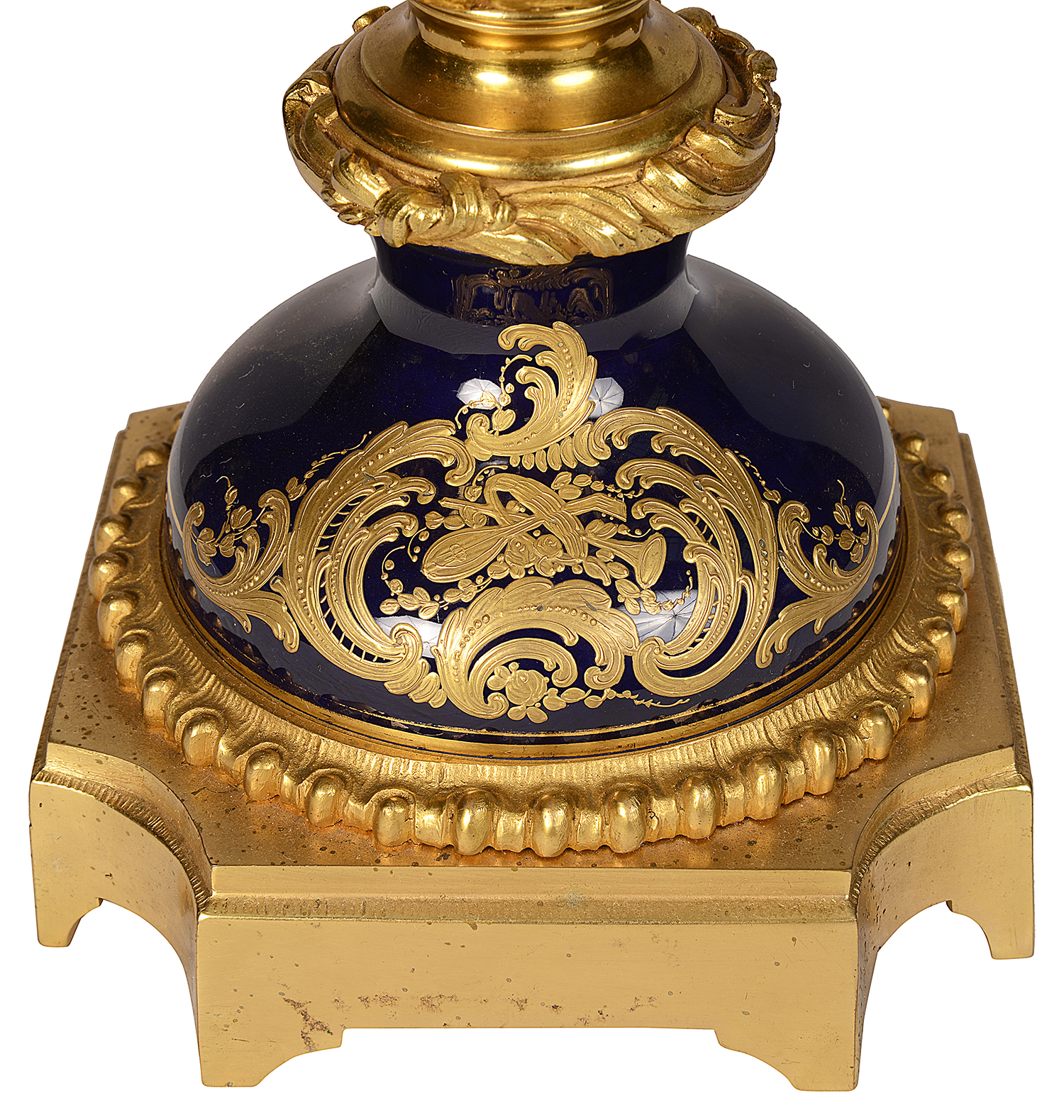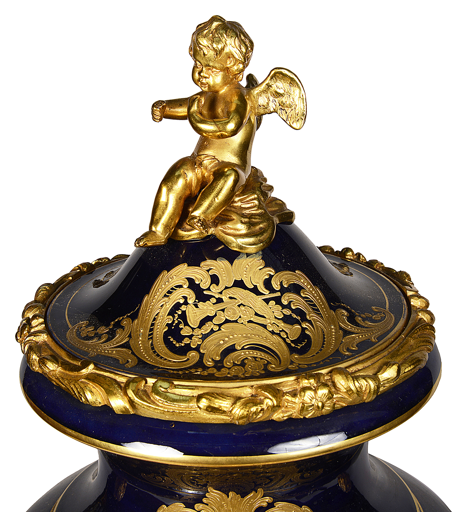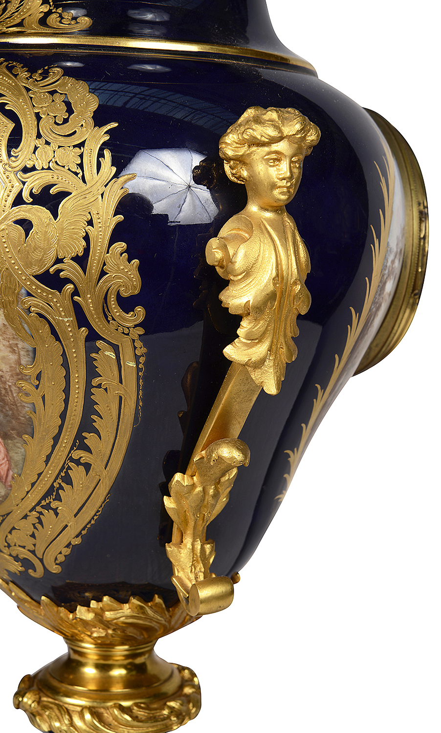 A very good quality late 19th Century French Sevres style porcelain lidded vase / clock. Having wonderful gilded ormolu mounts, a cherub finial and monopodia handles, an enamel faced eight day duration, hourly striking clock. Hand painted romantic scene to the front.