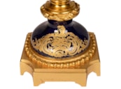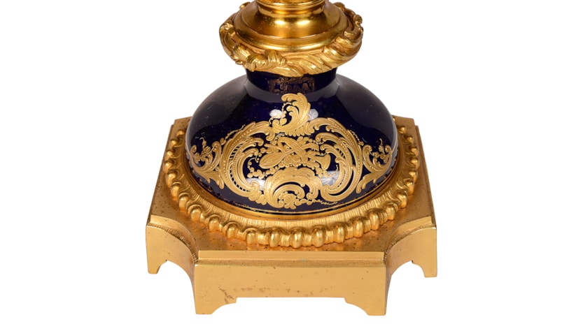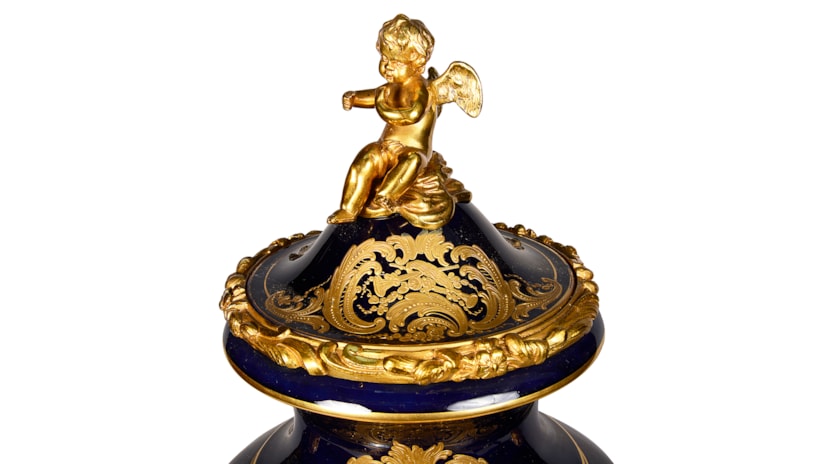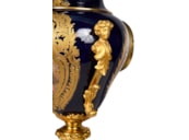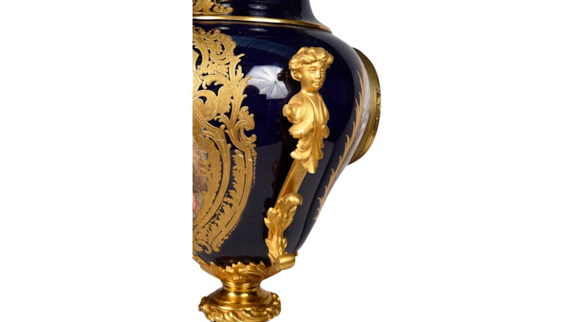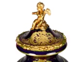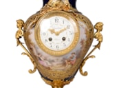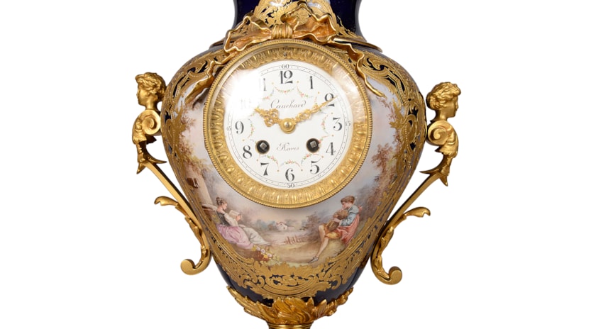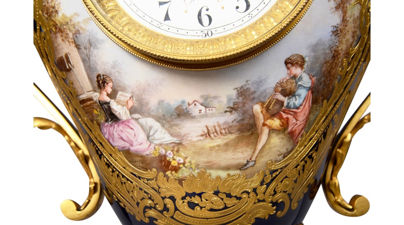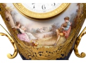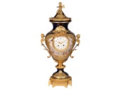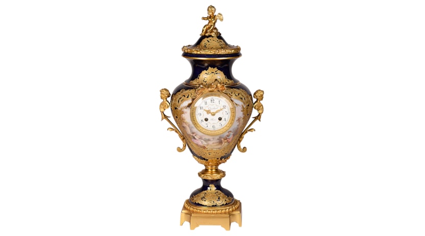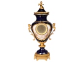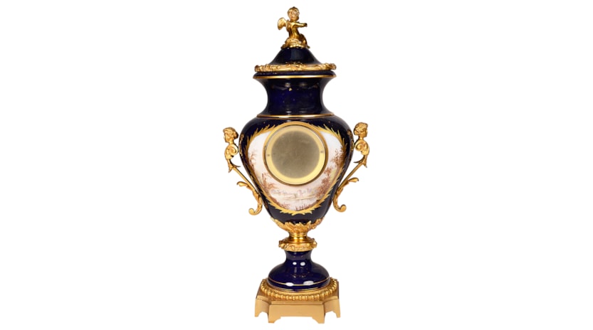 A very good quality late 19th Century French Sevres style porcelain lidded vase / clock. Having wonderful gilded ormolu mounts, a cherub finial and monopodia handles, an enamel faced eight day duration, hourly striking clock. Hand painted romantic scene to the front.