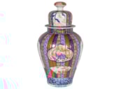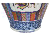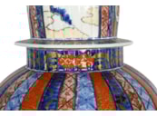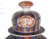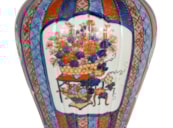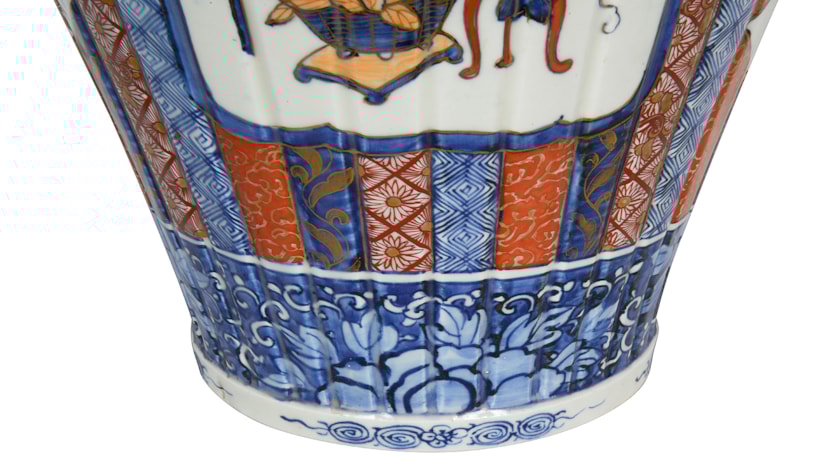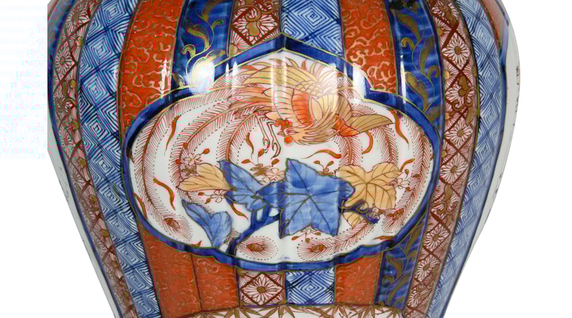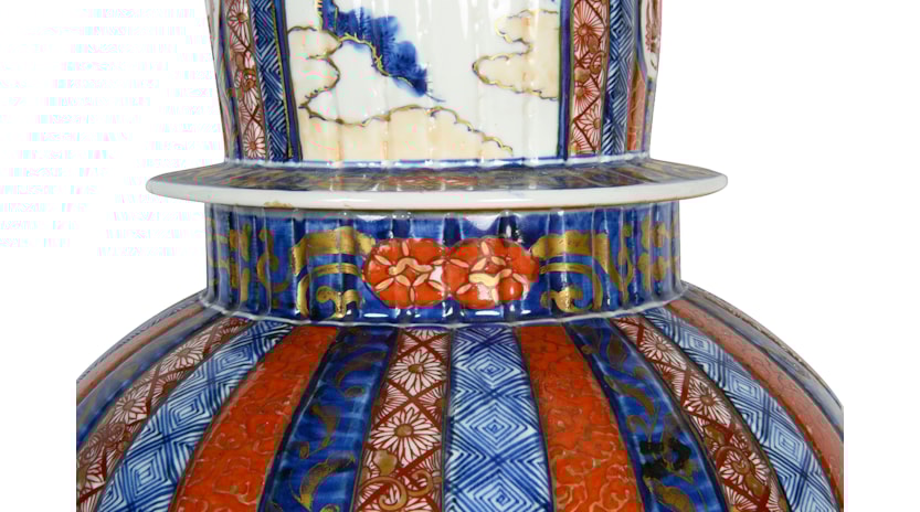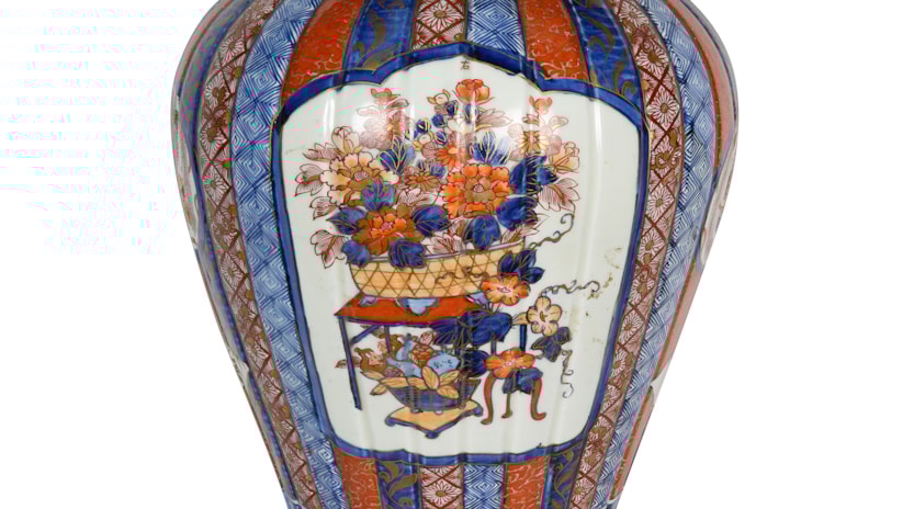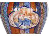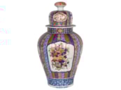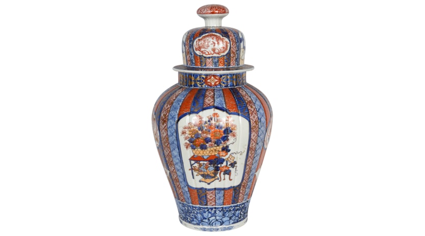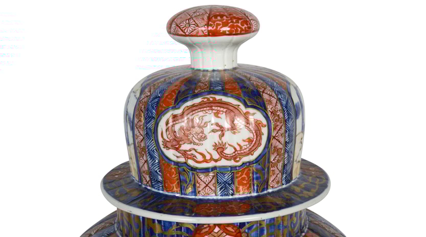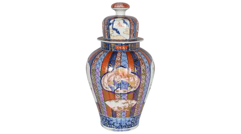 A very good quality late 19th Century Japanese lidded Imari vase, having wonderful bold colouring to the classical motif decoration, set in scolloped vertical bands with inset hand painted panels depicting exotic flowers on a table, mythical dragons and birds.