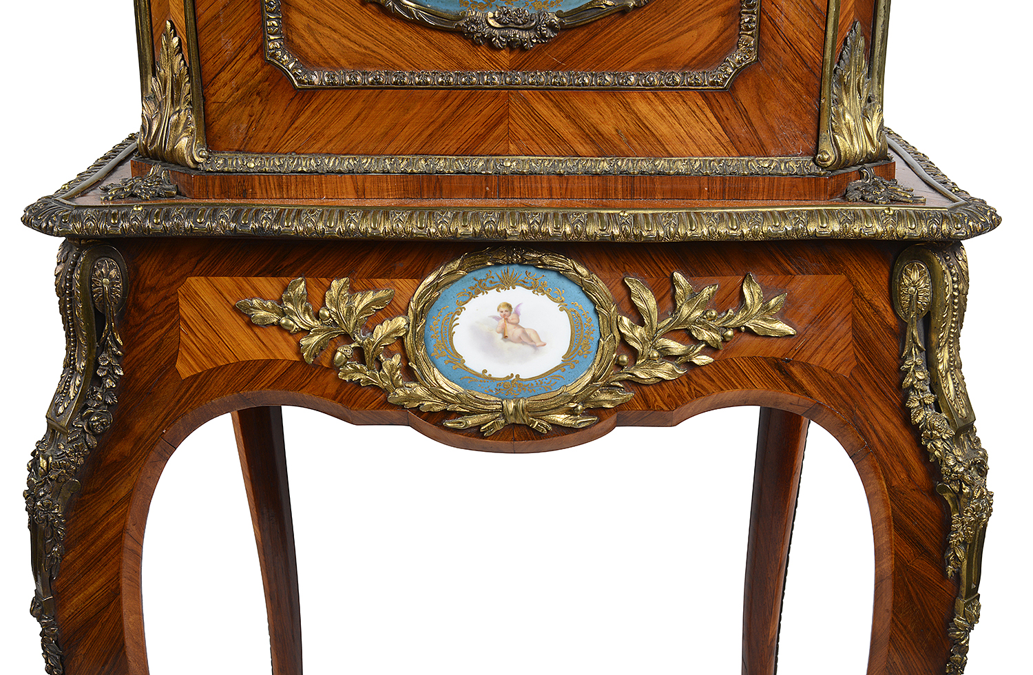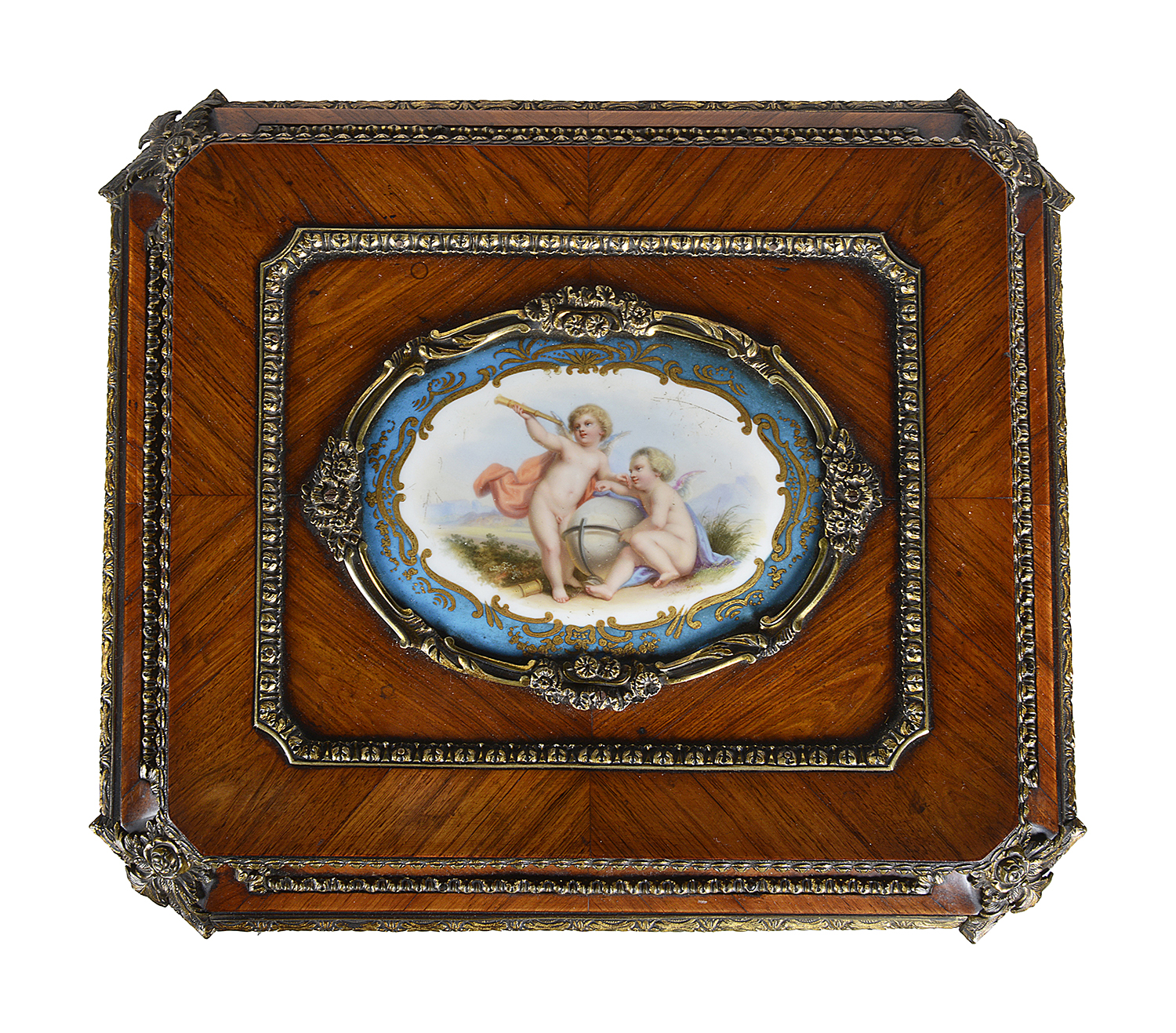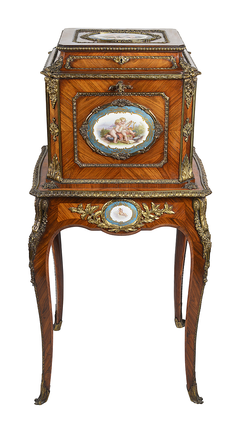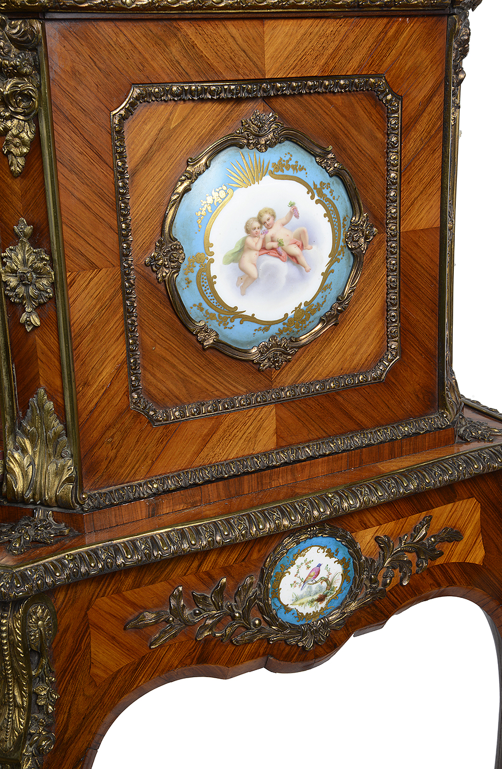 The quarter veneered box superstructure mounted with five oval Sevres style porcelain plaques painted with a trio of putti and four pairs of putti, variously allegorical of viniculture, geography, astronomy, literature, music and fire making, each plaque set within a shaped C- and S-scroll, floral, foliate and rocaille panel mount, the superstructure comprised of a hinged top enclosing a velvet lined interior, above a cavetto leaf mounted panelled frieze, with canted floral clasped angles, over a re-entrant panel mounted hinged fall front enclosing two pigeon holes, two short mahogany lined tulipwood veneered drawers and one shelf, on a stand with a shaped apron mounted with four oval Sevres style painted porcelain plaques, each within a ribbon tied entwined twin oak leaf branch and oak leaf wreath mount, on keeled cabriole legs each headed by a floral swagged, paterae embedded scrolled corbel, beaded and acanthus clasped mount, with guilloche cast chutes terminating in scrolled foliate sabots, approximately: 54cm wide x 49cm deep x 110cm high, (21in wide x 19in deep x 43in high)