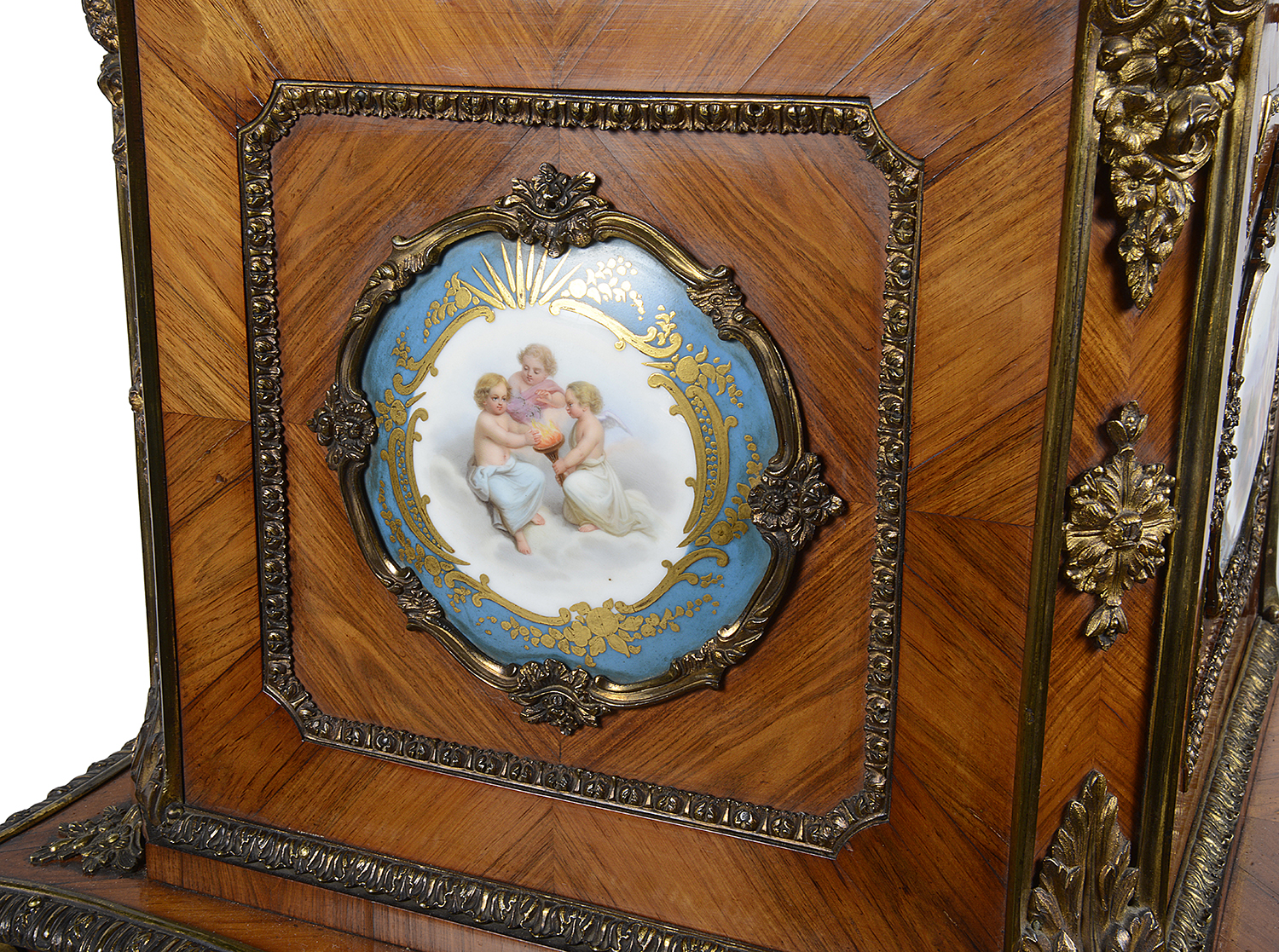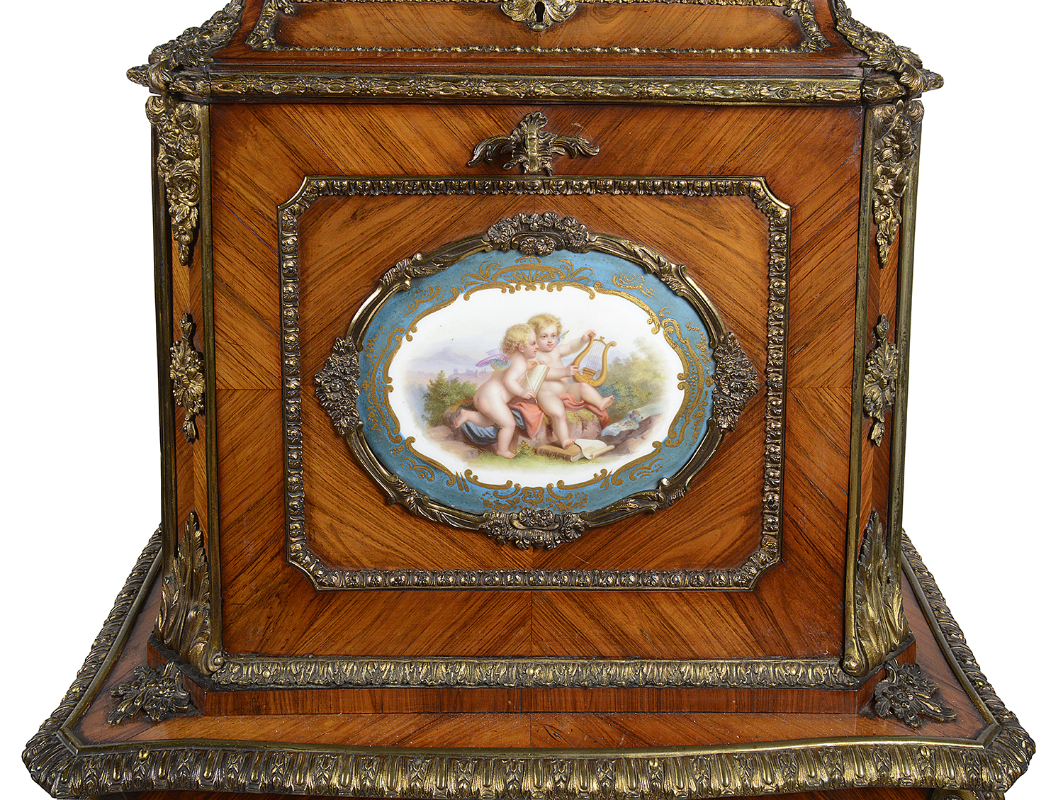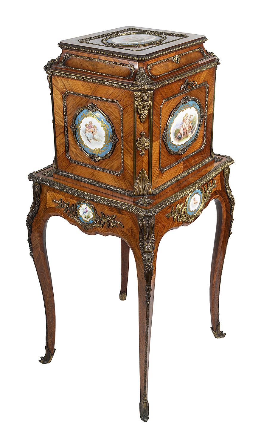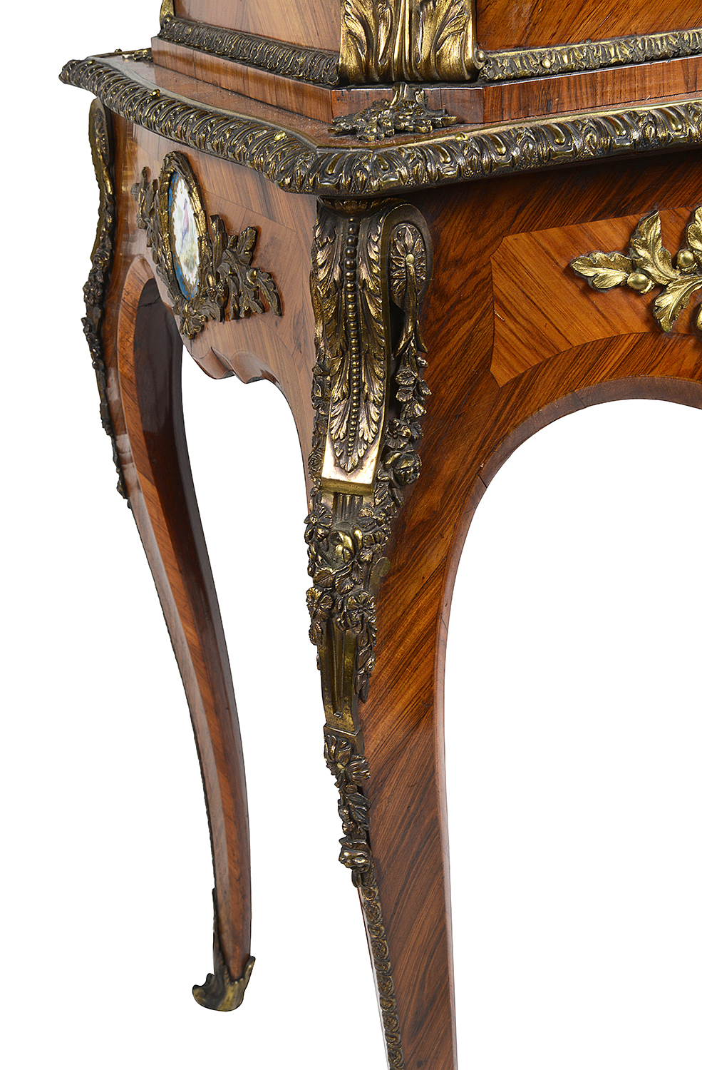 The quarter veneered box superstructure mounted with five oval Sevres style porcelain plaques painted with a trio of putti and four pairs of putti, variously allegorical of viniculture, geography, astronomy, literature, music and fire making, each plaque set within a shaped C- and S-scroll, floral, foliate and rocaille panel mount, the superstructure comprised of a hinged top enclosing a velvet lined interior, above a cavetto leaf mounted panelled frieze, with canted floral clasped angles, over a re-entrant panel mounted hinged fall front enclosing two pigeon holes, two short mahogany lined tulipwood veneered drawers and one shelf, on a stand with a shaped apron mounted with four oval Sevres style painted porcelain plaques, each within a ribbon tied entwined twin oak leaf branch and oak leaf wreath mount, on keeled cabriole legs each headed by a floral swagged, paterae embedded scrolled corbel, beaded and acanthus clasped mount, with guilloche cast chutes terminating in scrolled foliate sabots, approximately: 54cm wide x 49cm deep x 110cm high, (21in wide x 19in deep x 43in high)