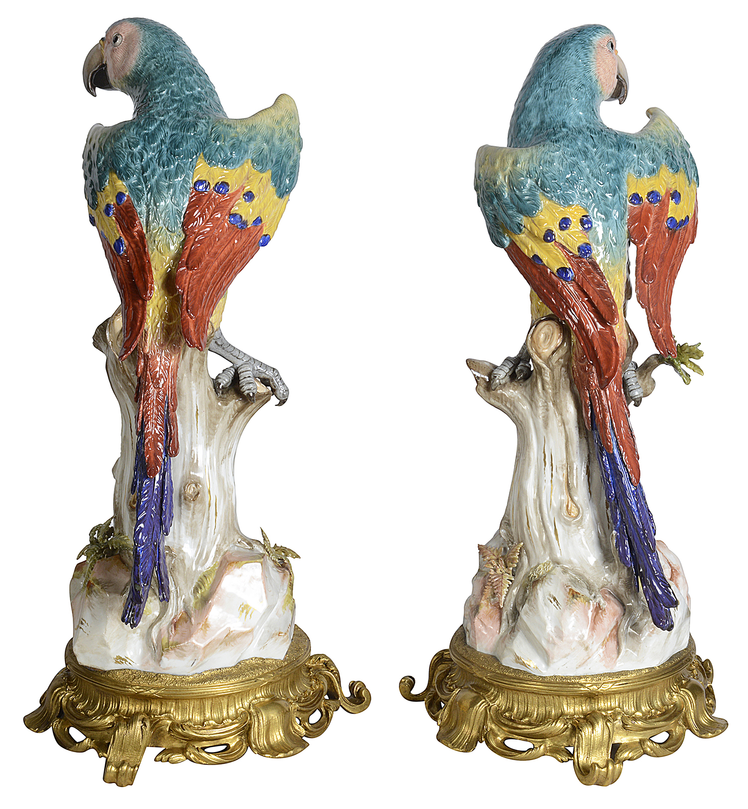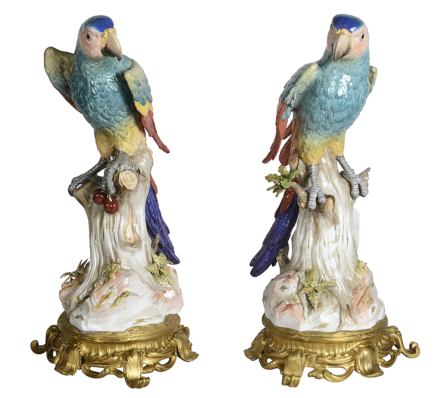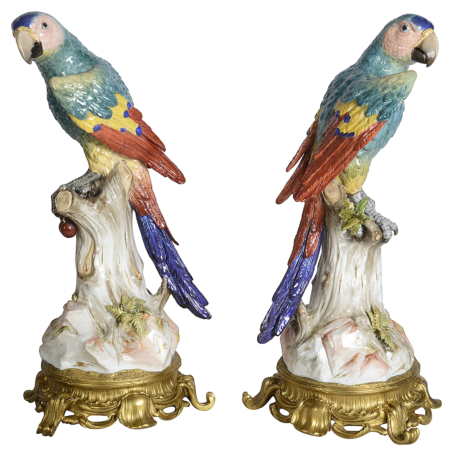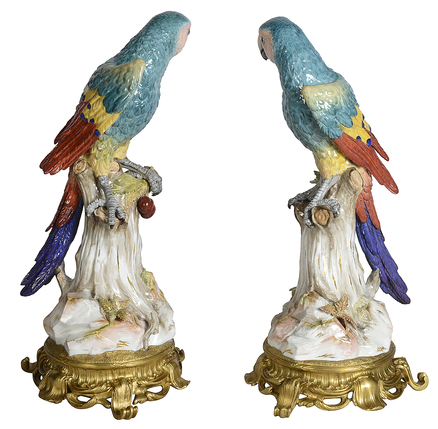 Important pair of 19th Century, ormolu mounted Meissen Parrots. 49cm