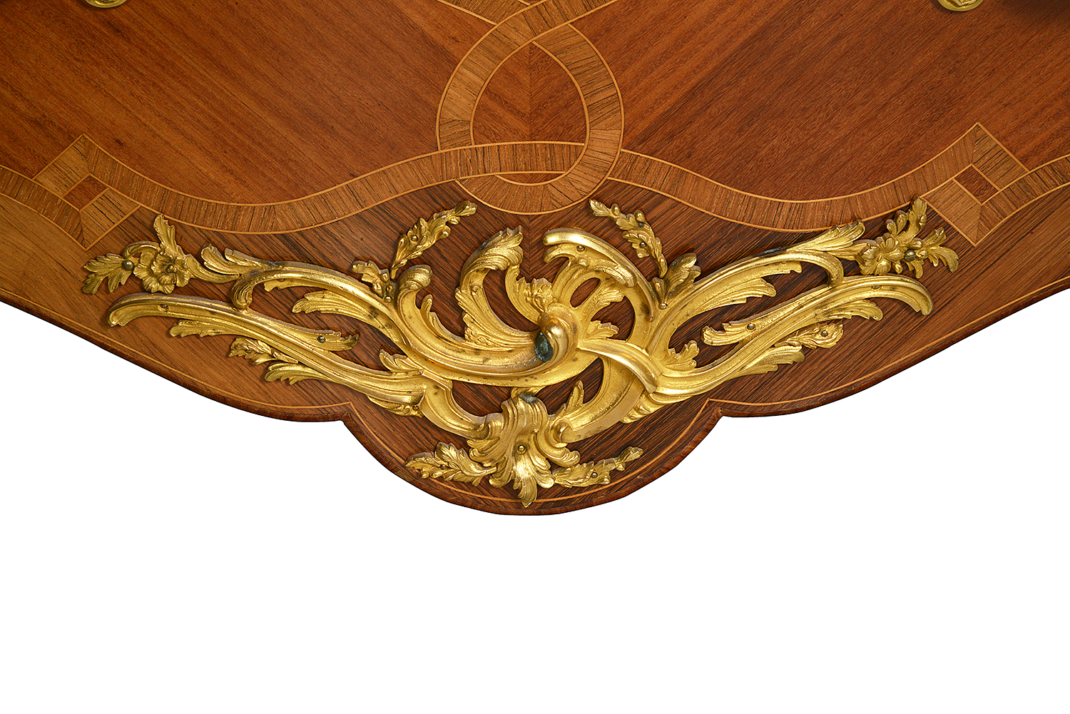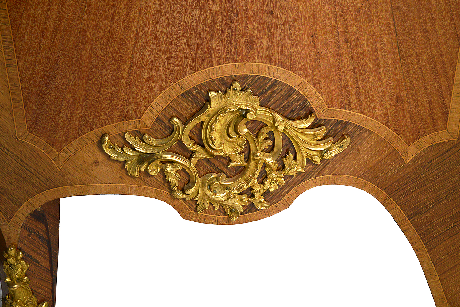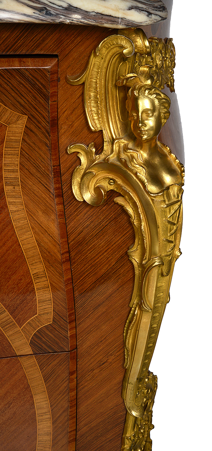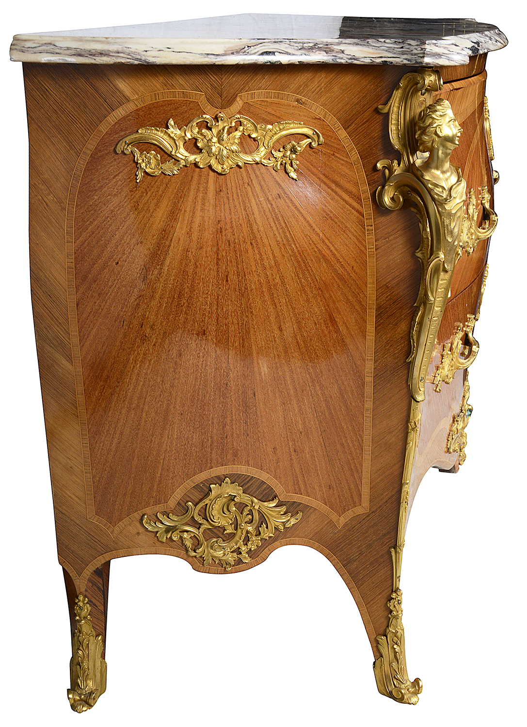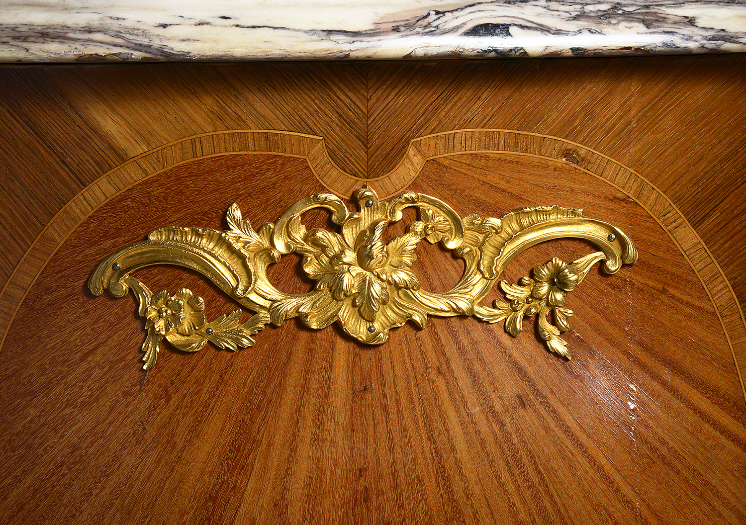 A fine quality late 19th Century French Louis XVI style, bombe fronted, marble top commode. Having wonderful rococo influenced gilded ormolu mounts and handles, monopodia supports to the corners. Parquetry inlaid inset panel to the centre, with scrolling cross banding to the front and sides. Raised on elegant scrolling outswept ormolu mounted feet.