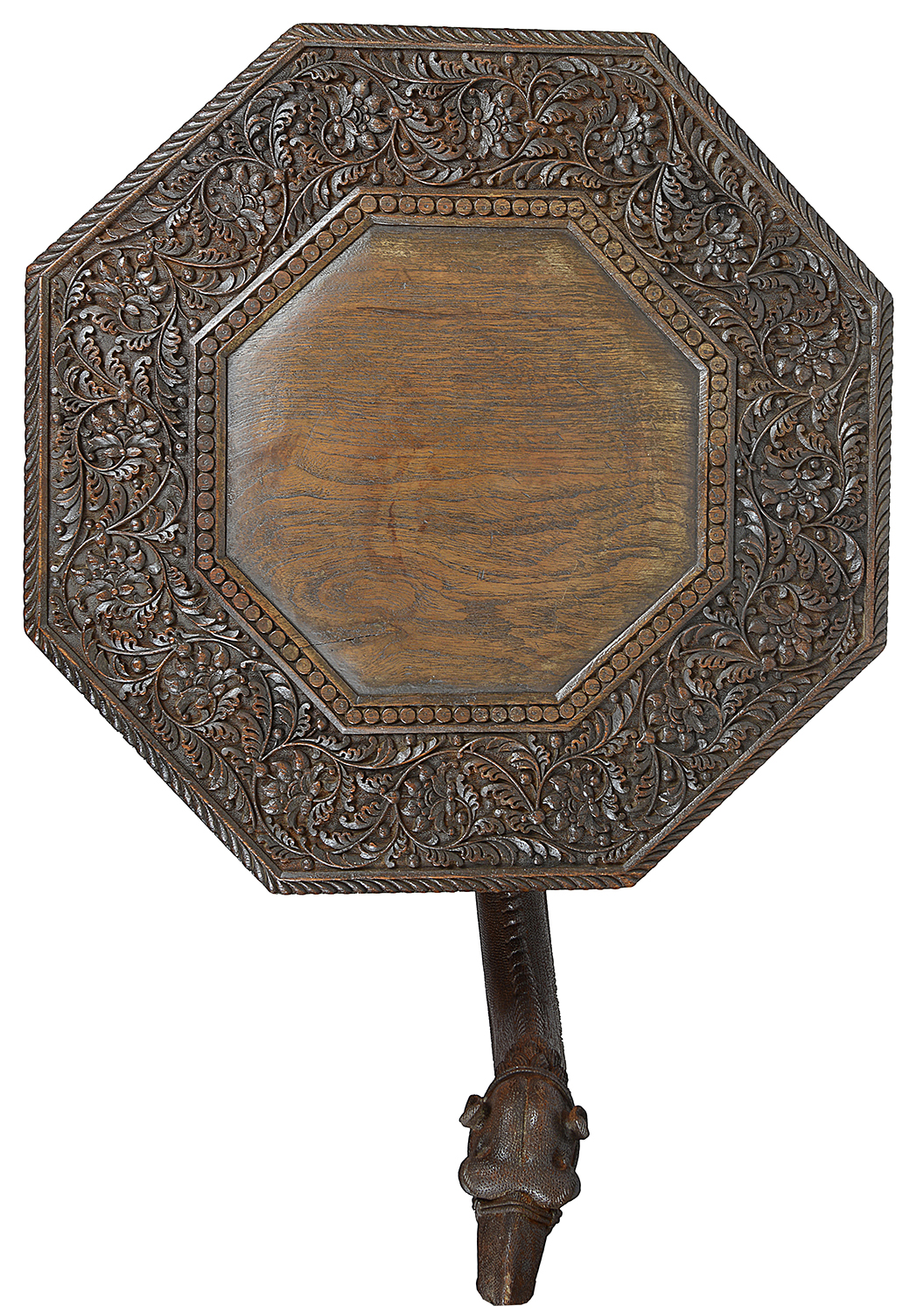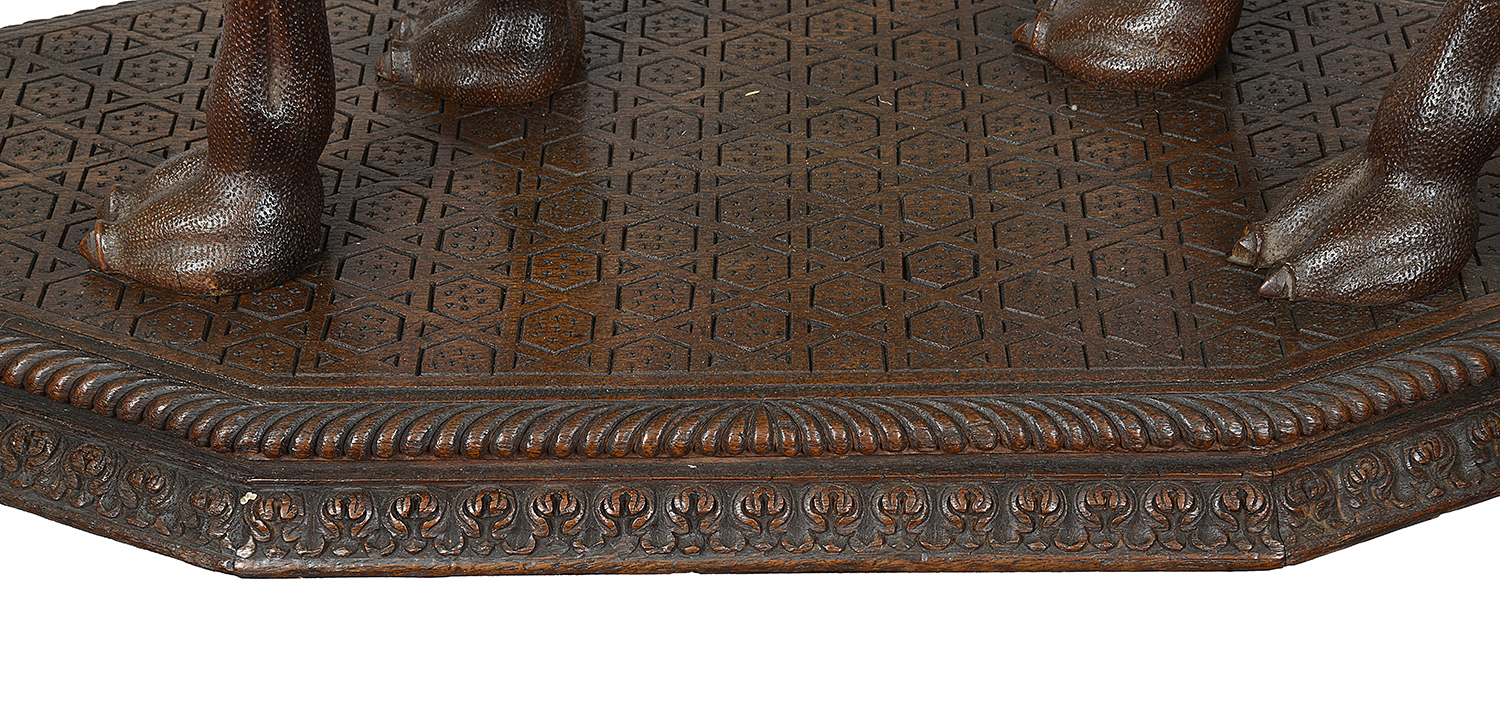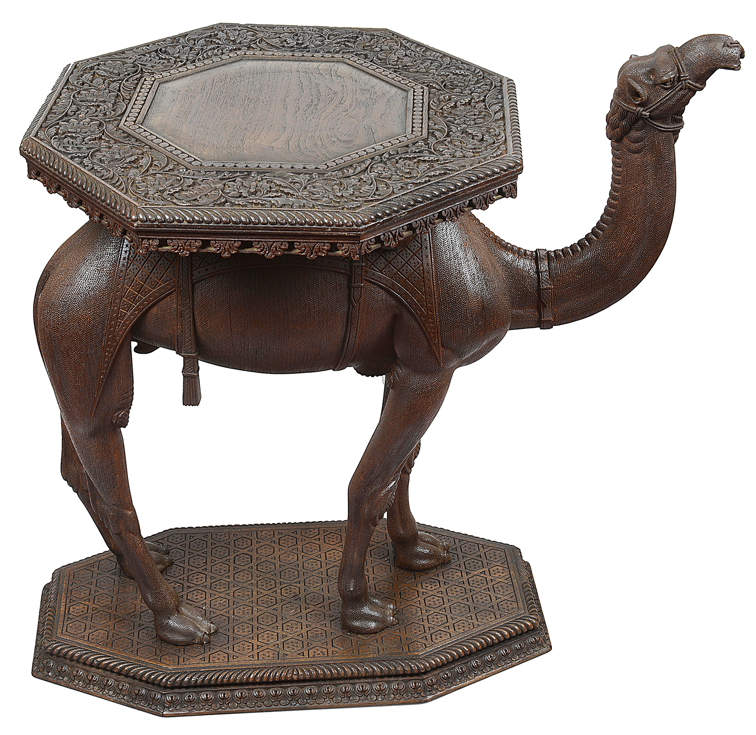 A rare pair of fine quality Anglo Indian hand carved Teak side tables in the form of camels. Each having octagonal tops with finely carved scrolling foliate decoration.