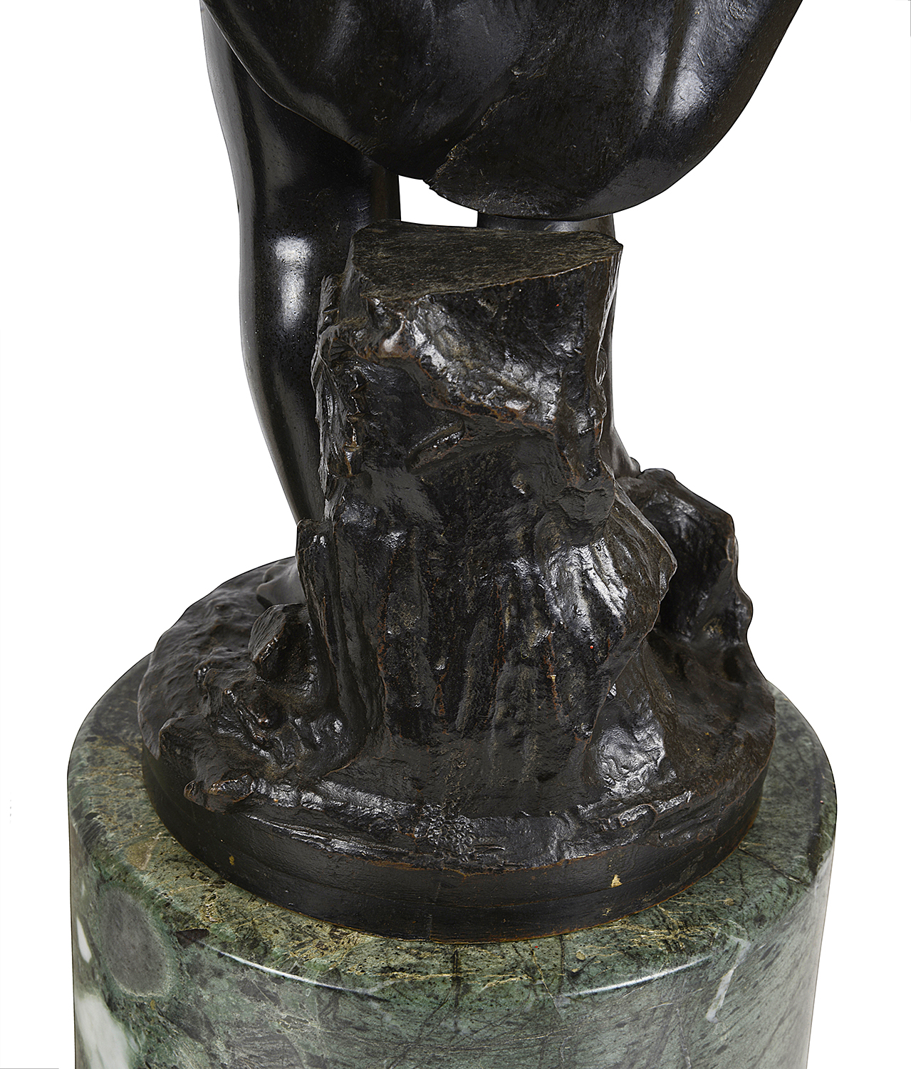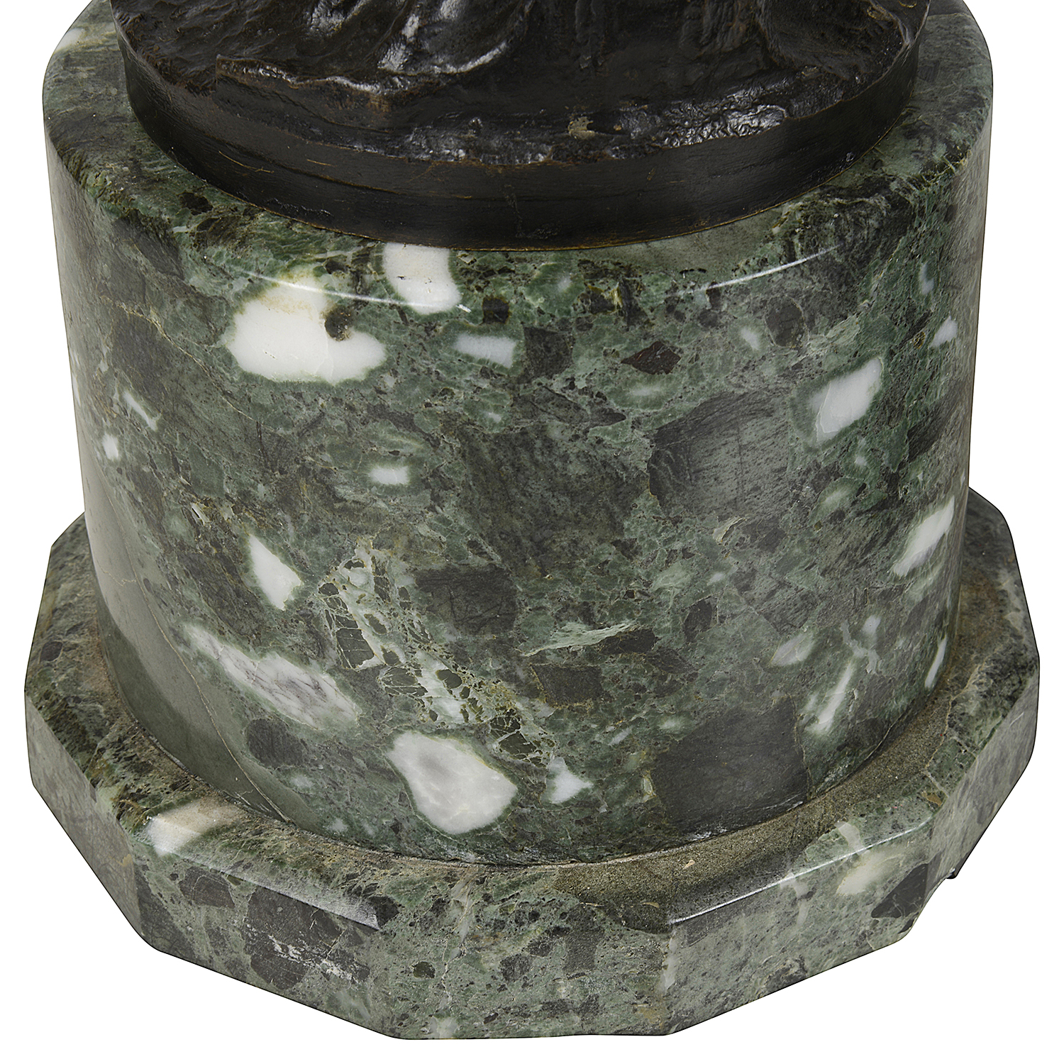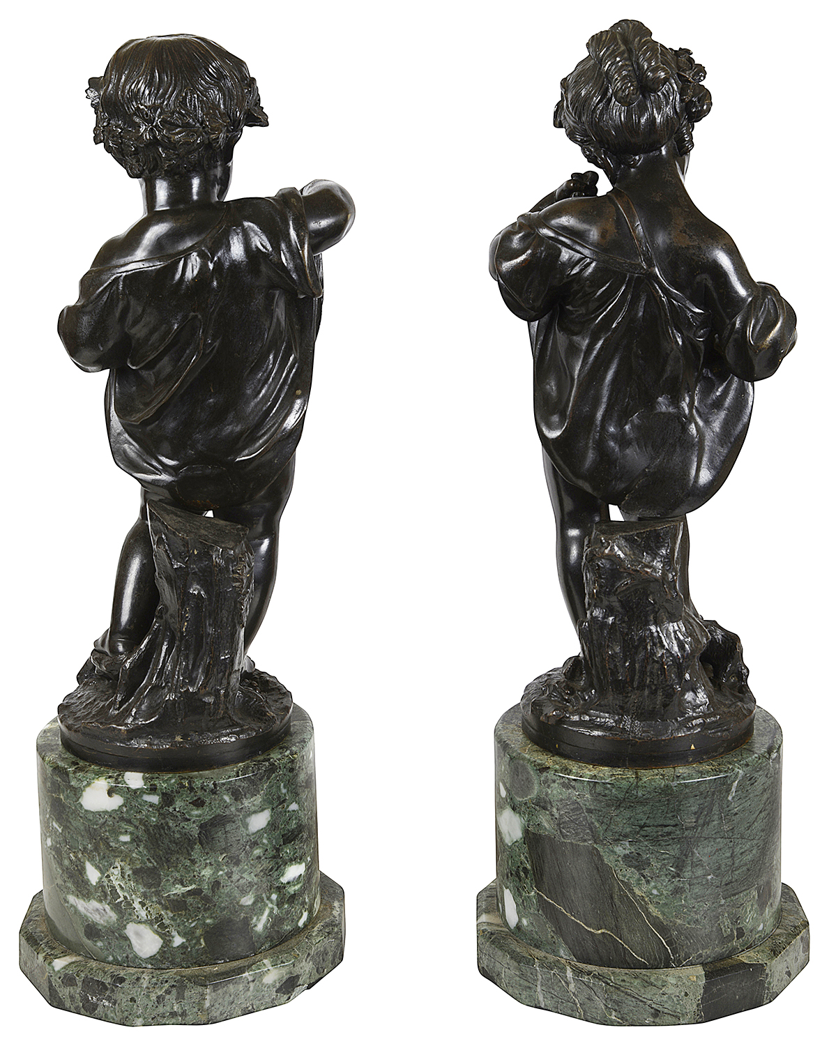 A very impressive pair of 19th Century French patinated bronze putti, each gathering up grapes and raised on variegated green marble plinths, circa 1880.
