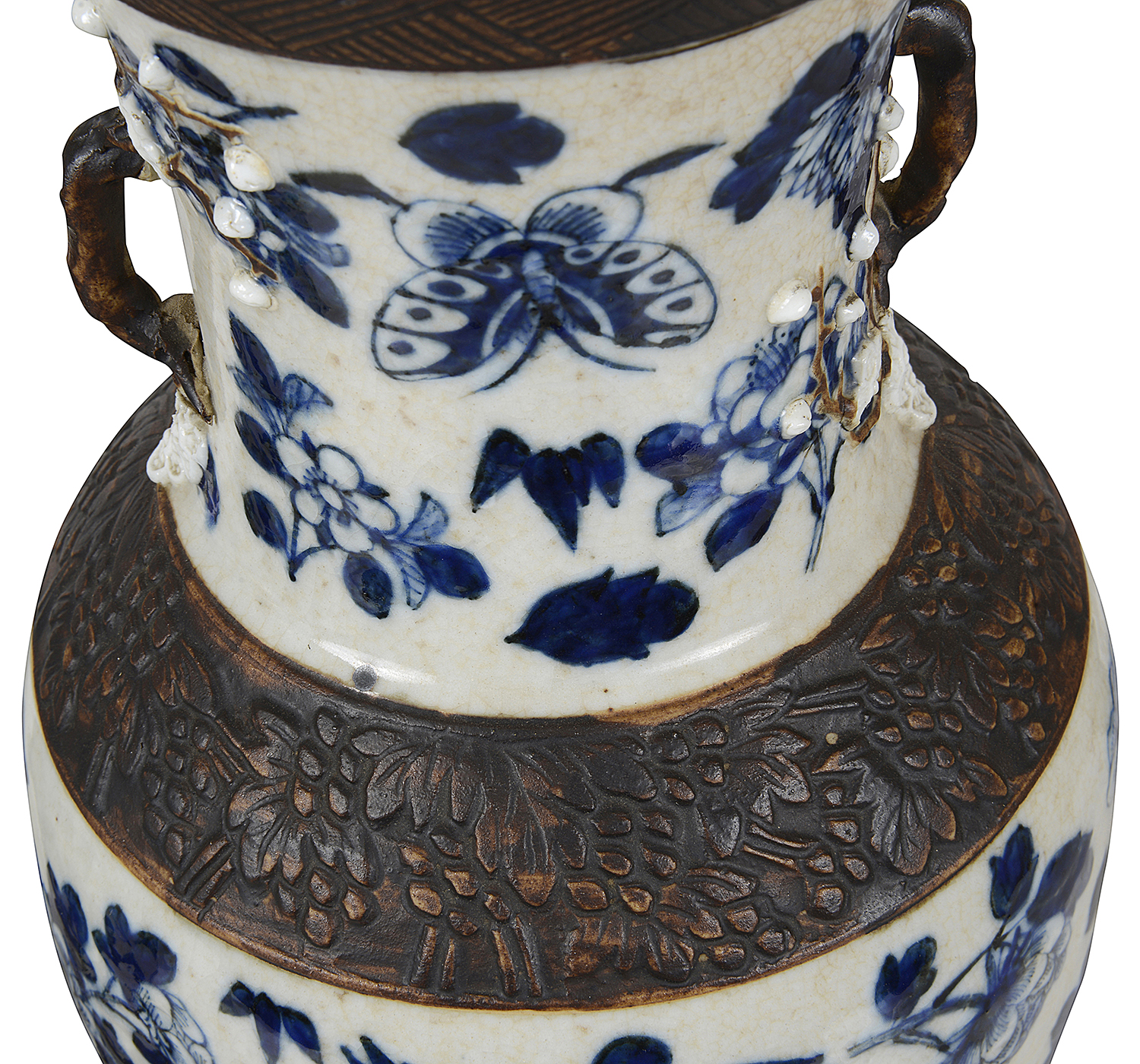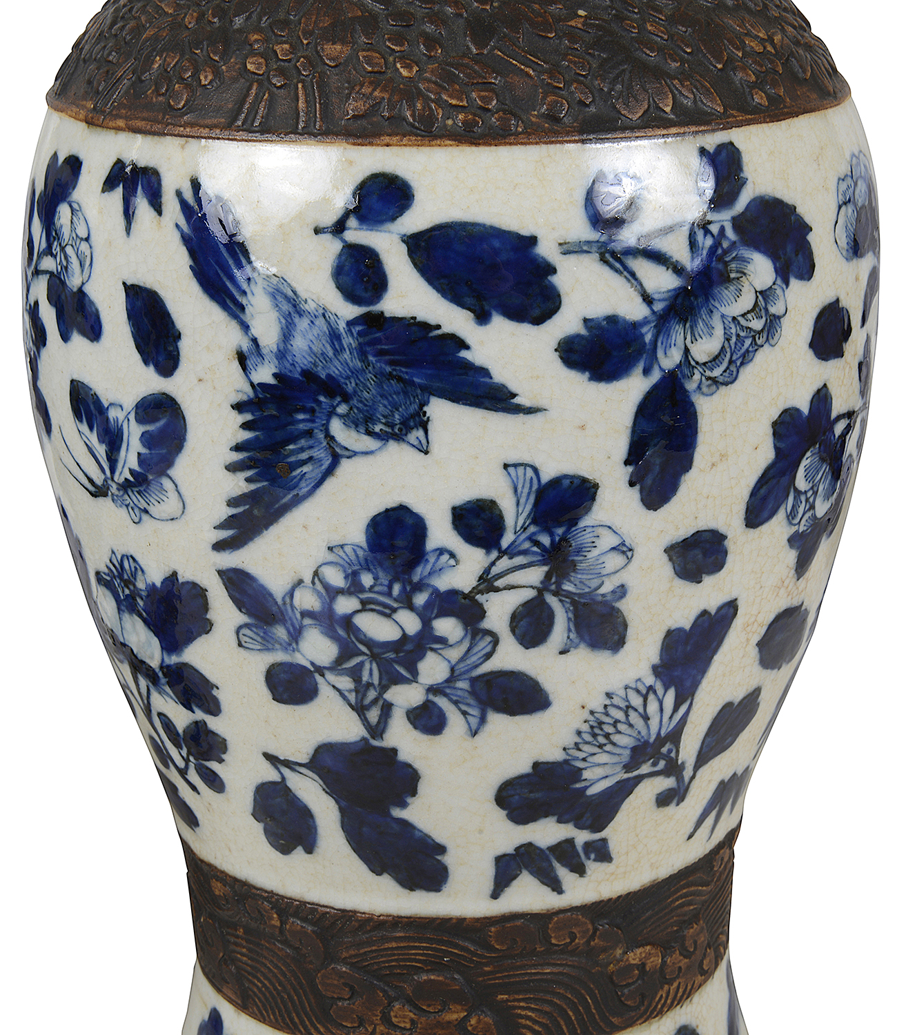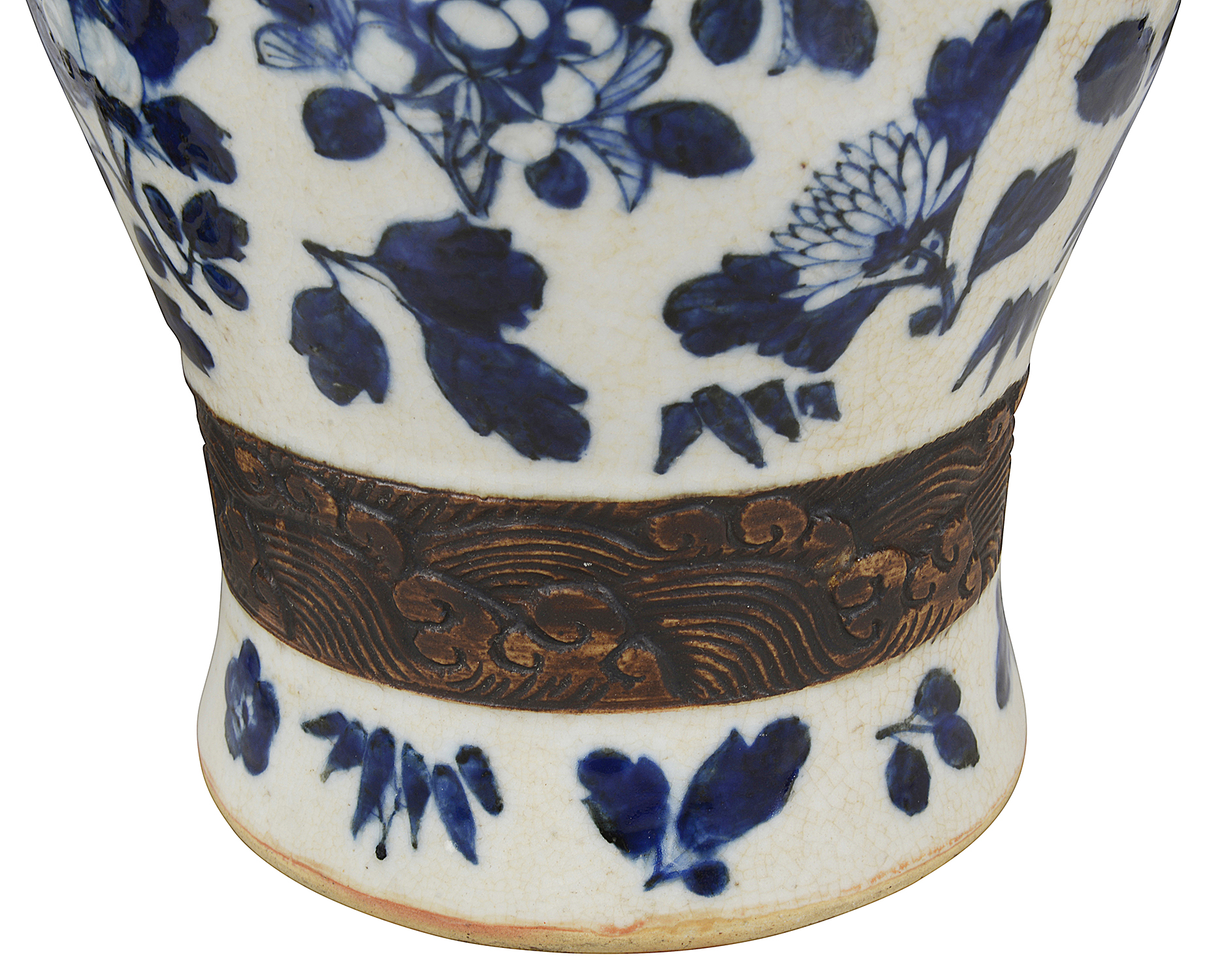 A good quality pair of late 19th Century Chinese Blue and White crackleware vases / lamps.