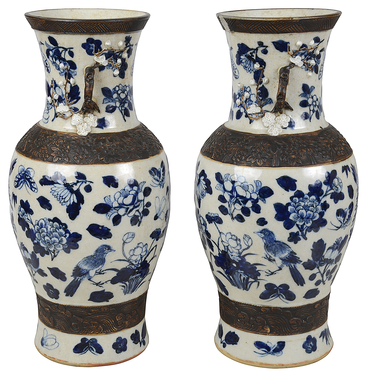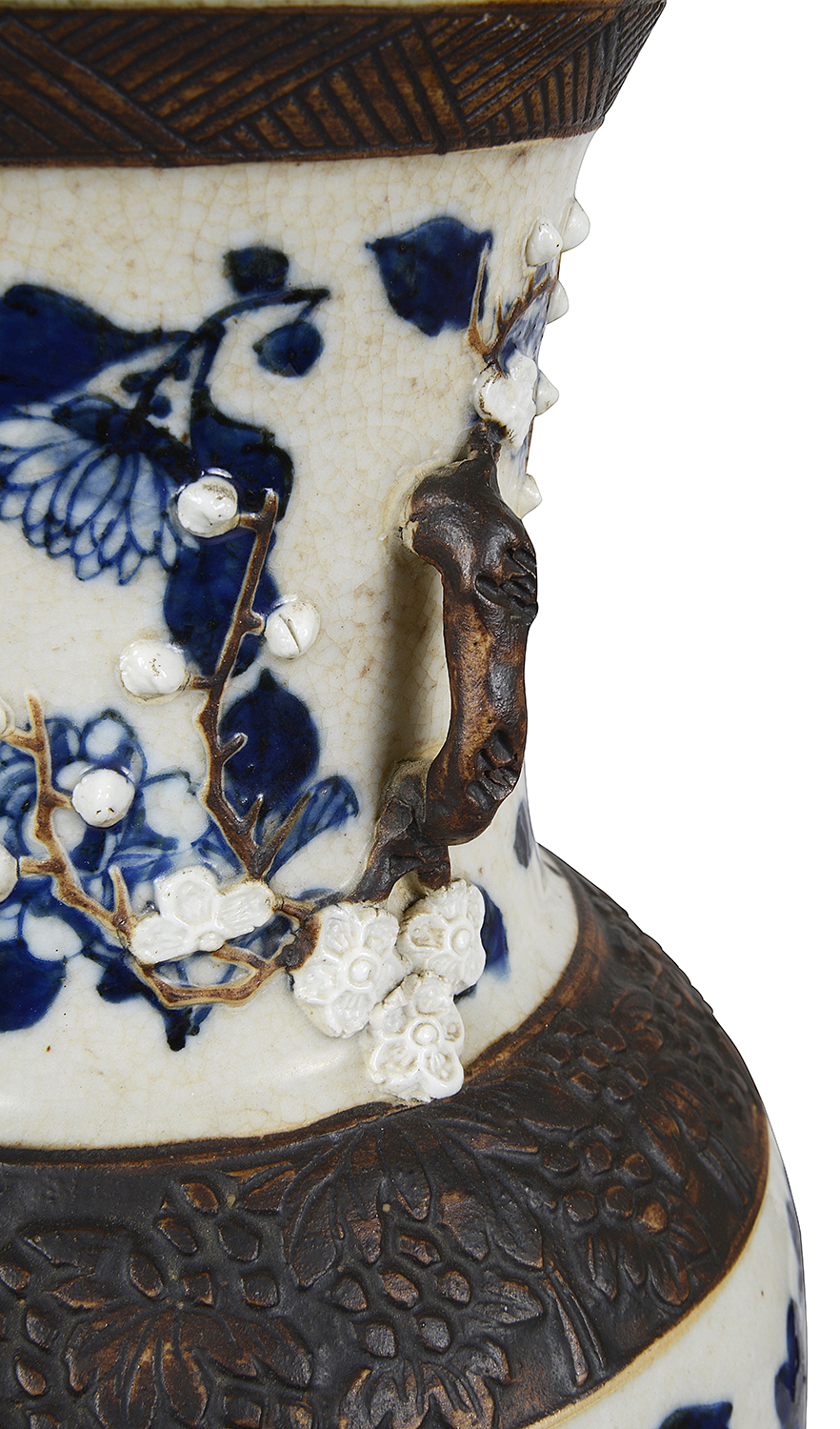 Scenes of birds, flowers and raised white porcelain blossom to the necks.