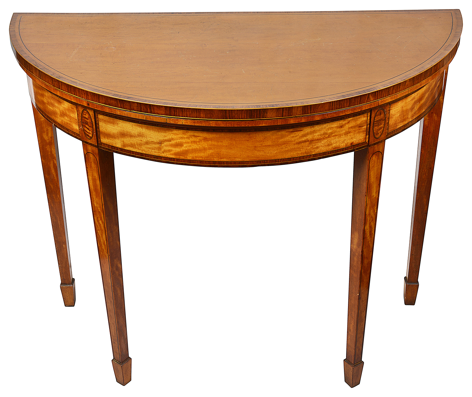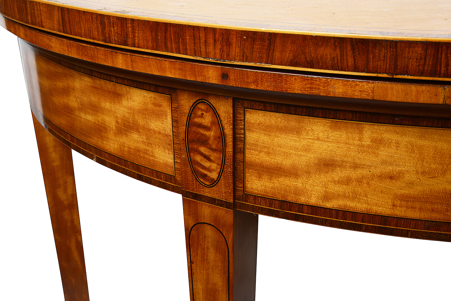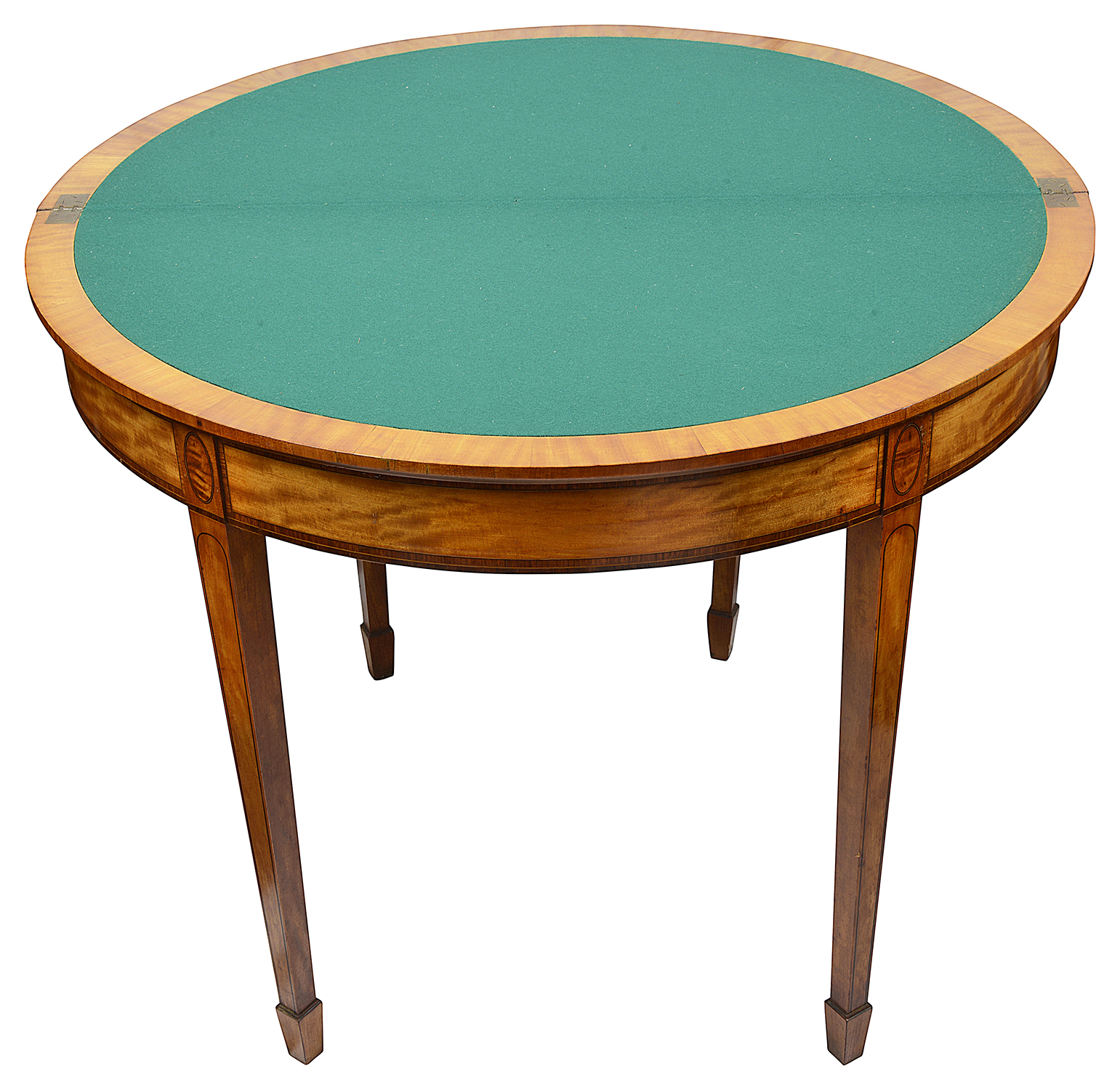 An elegant Georgian style Satinwood half round folding card table, having rosewood cross banding to the top and frieze. Raised on square tapering legs, terminating in spade feet. The top unfolds, supported by the two hinged back legs, revealing a baize covered card playing surface.