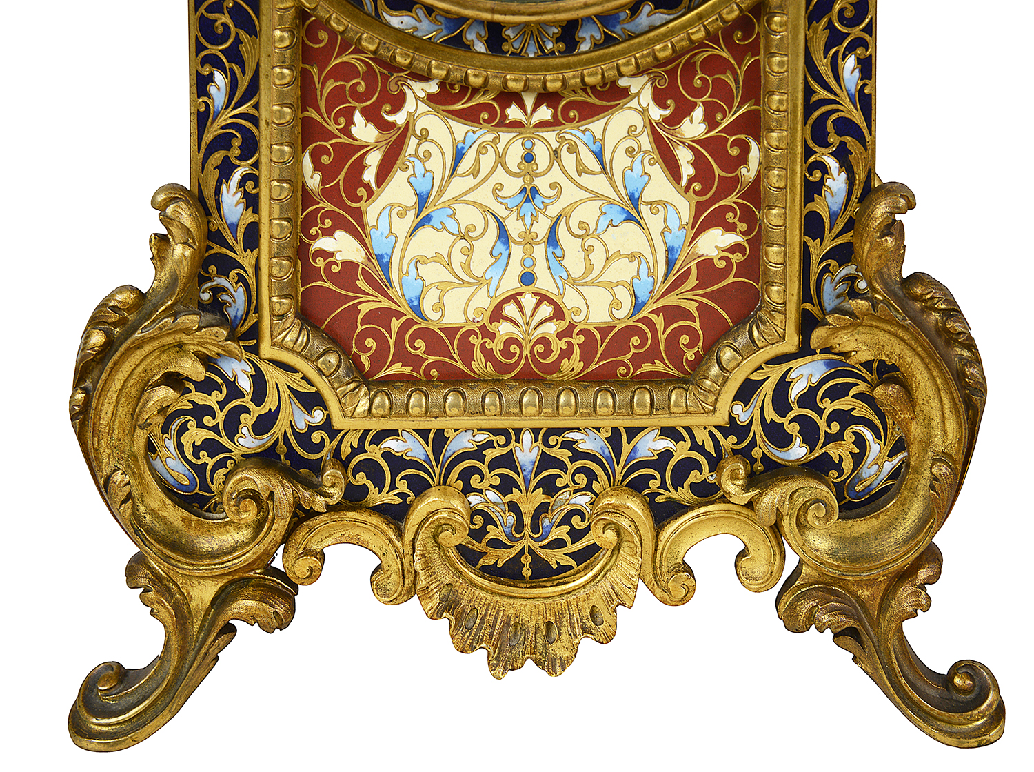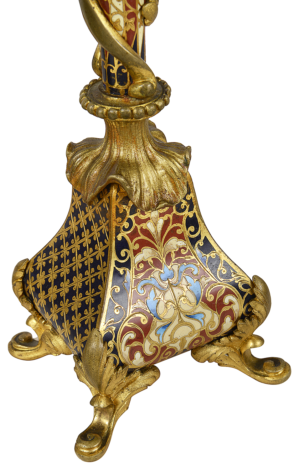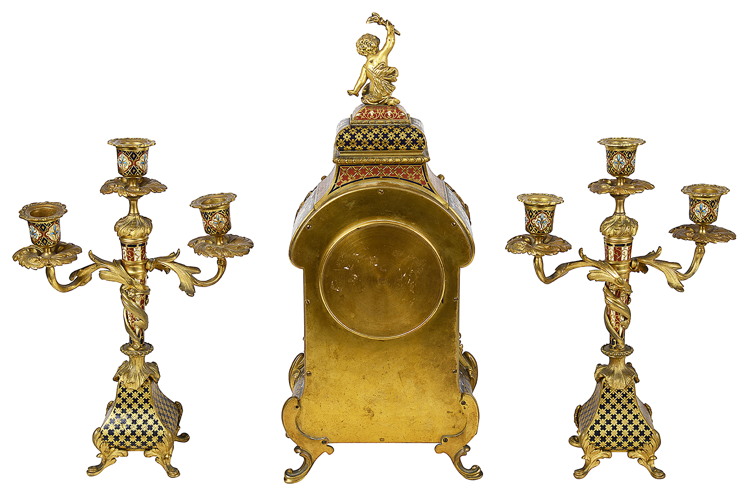 A very good quality late 19th Century French gilded ormolu and champleve enamel clock set. The matching three brach candelabra with scrolling foliate rococo style decoration and bold colouring enamel.