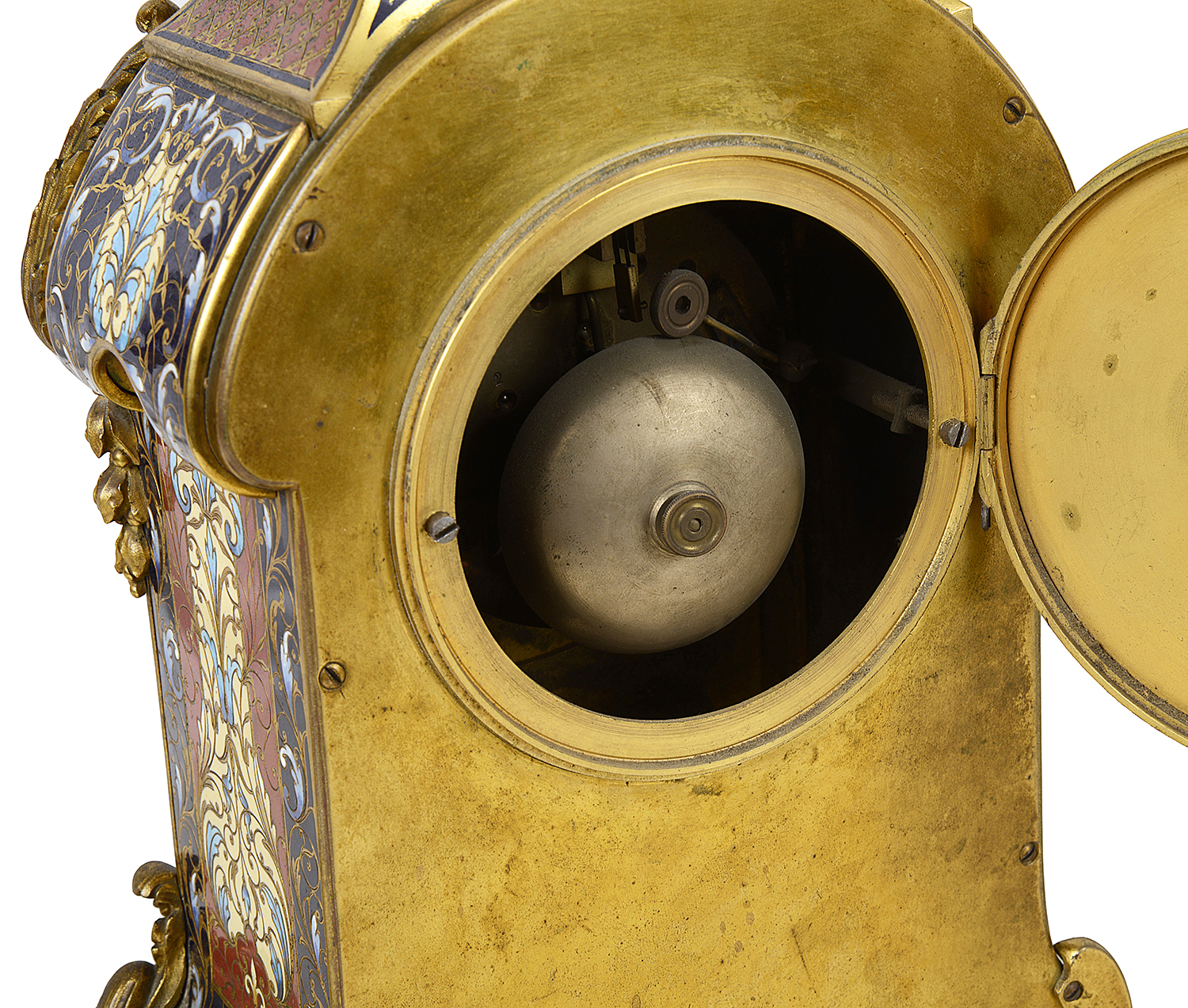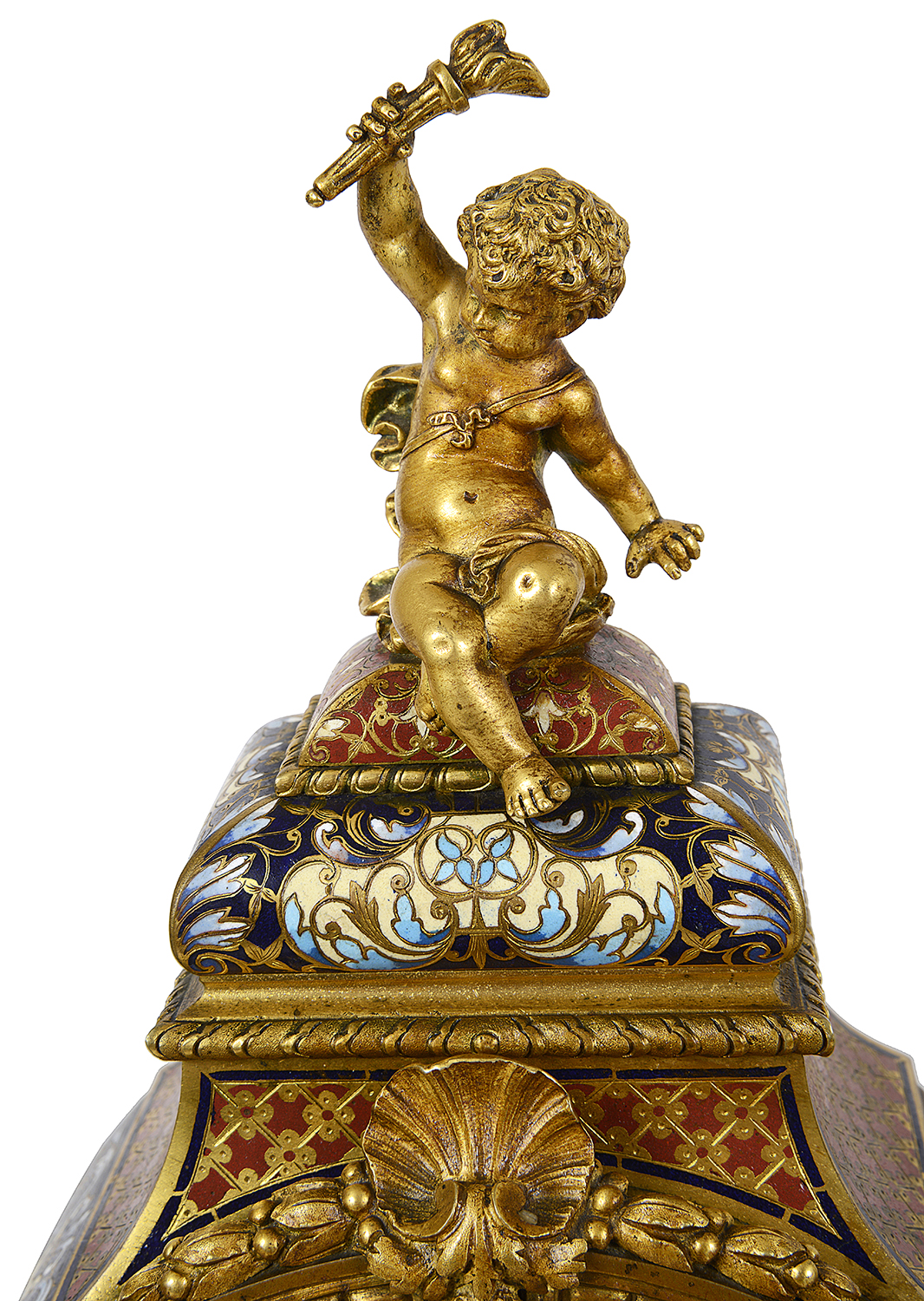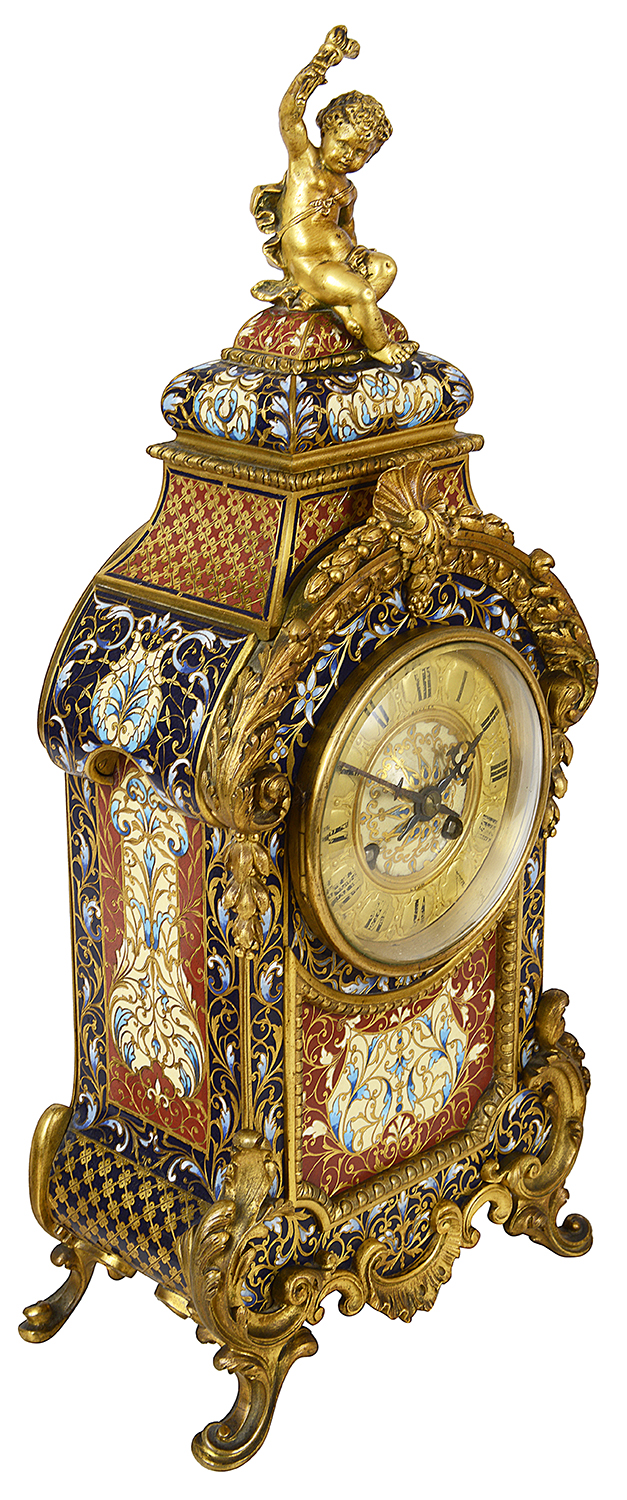 The clock having a putti seated above holding a flame torch, scrolling foliate and shell mounts, the gilded clock face with roman numerals, an eight day duration movement, strikes on the hour and half hour. The case having these wonderful bold colouring to the enamel and raised on out swept ormolu feet.