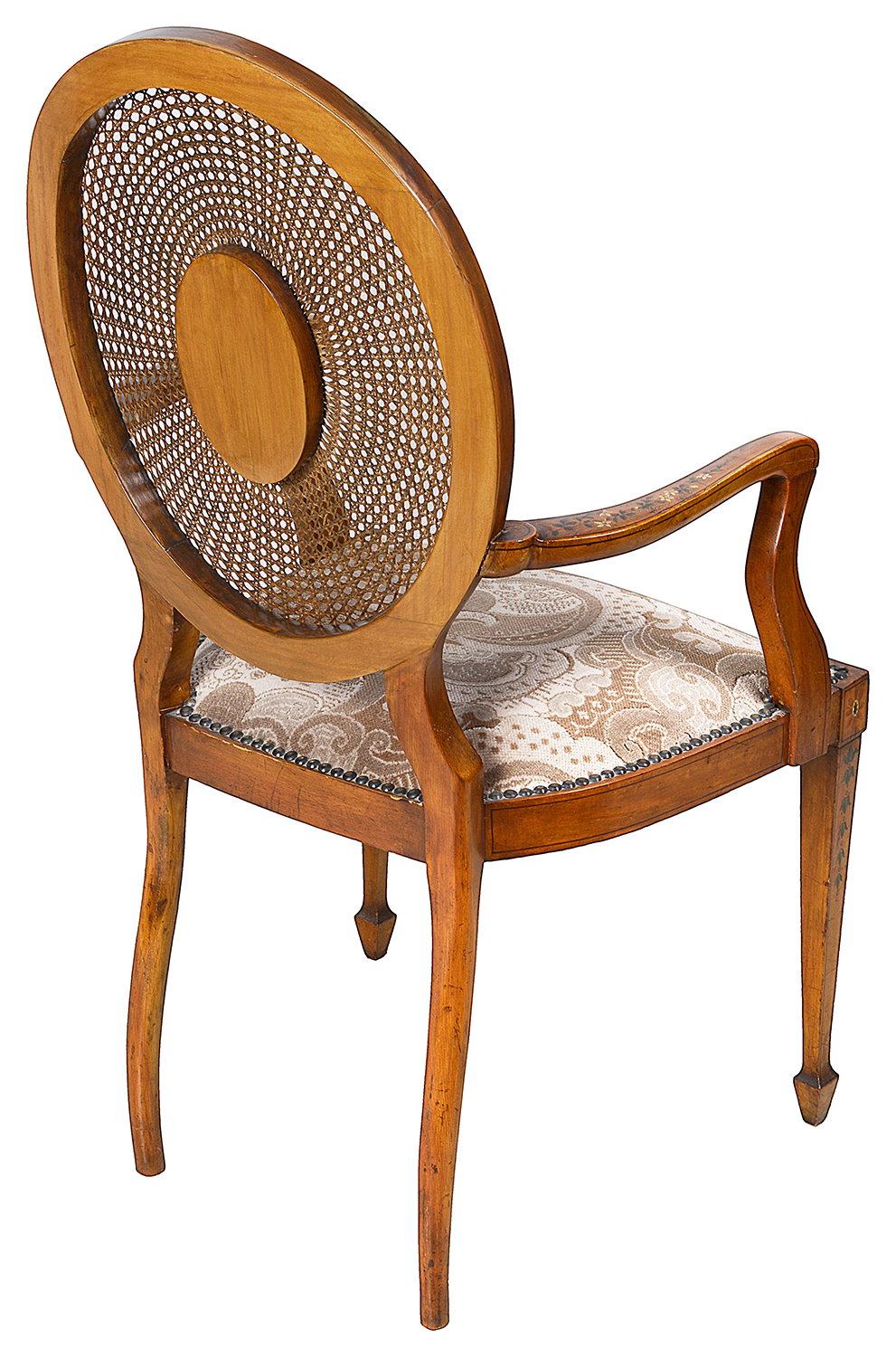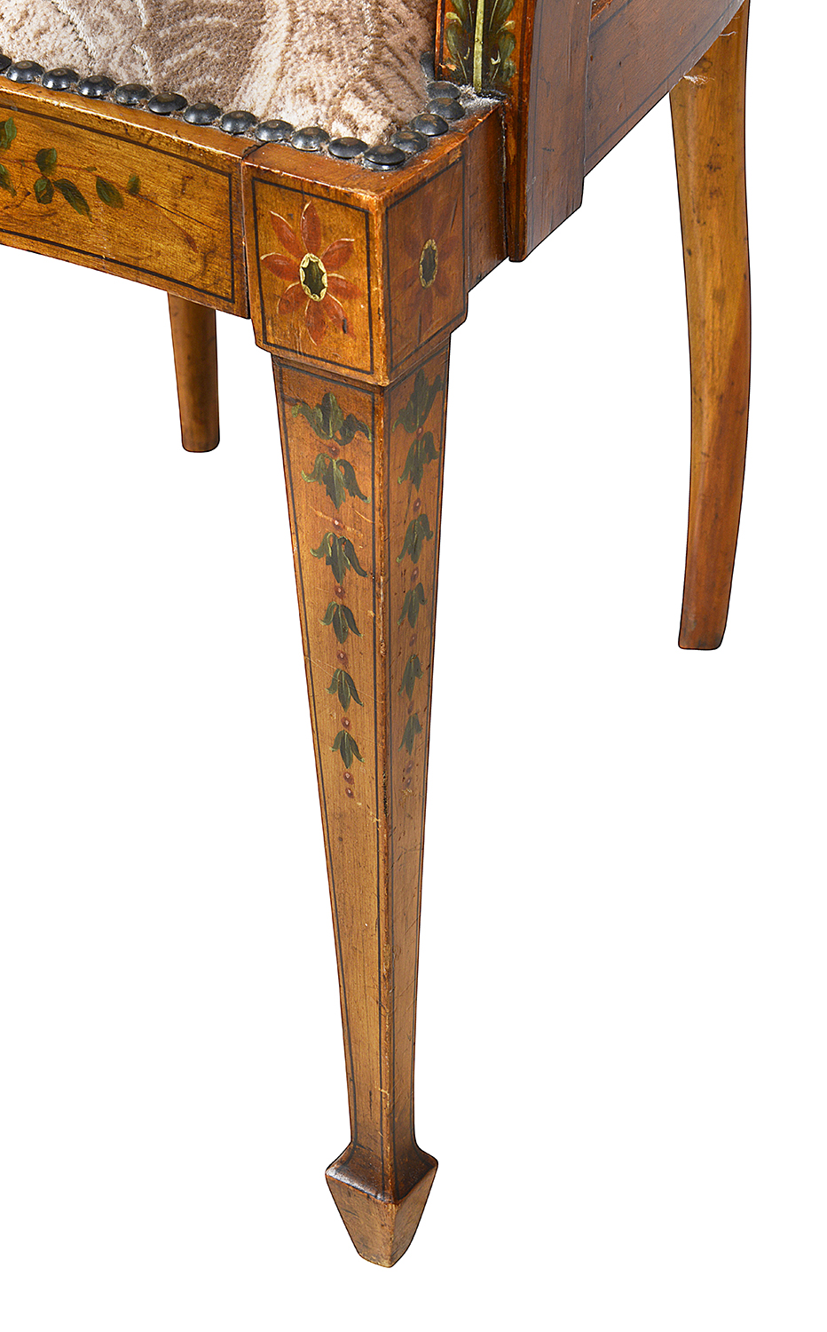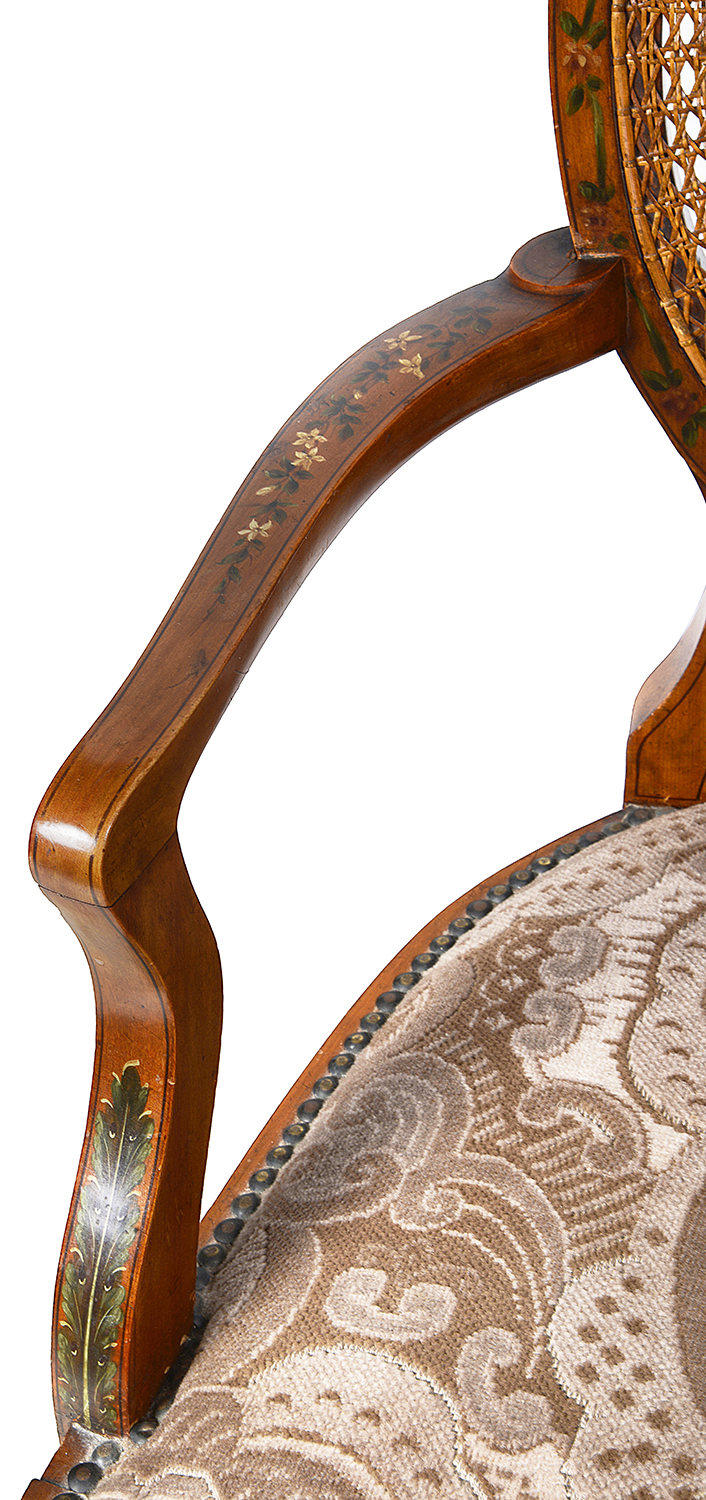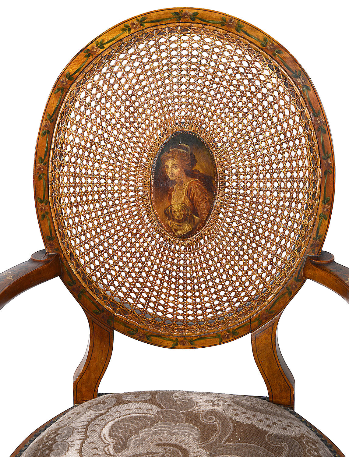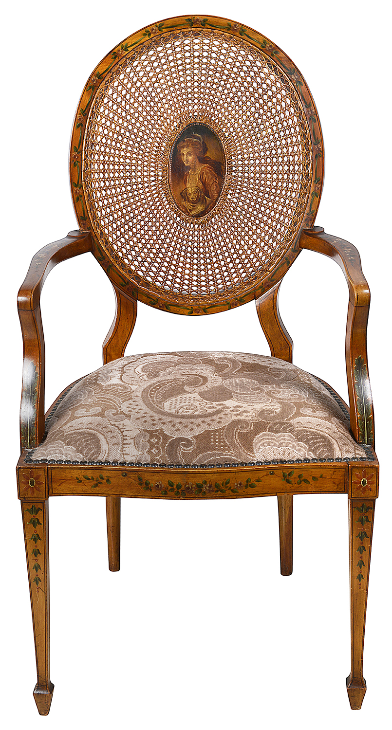 A very good quality Edwardian Satinwood Sheraton revival arm chair, having cane to the oval back rest, hand painted floral decoration to the show wood, a portrait painted to the centre. A stuff over upholstered seat and raised on elegant square tapering legs.