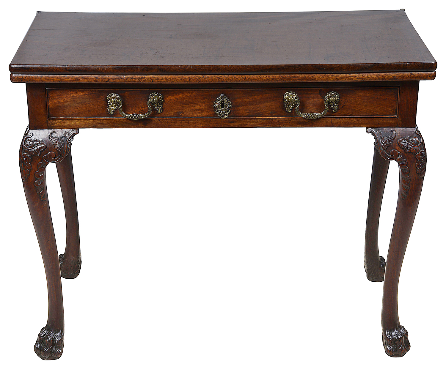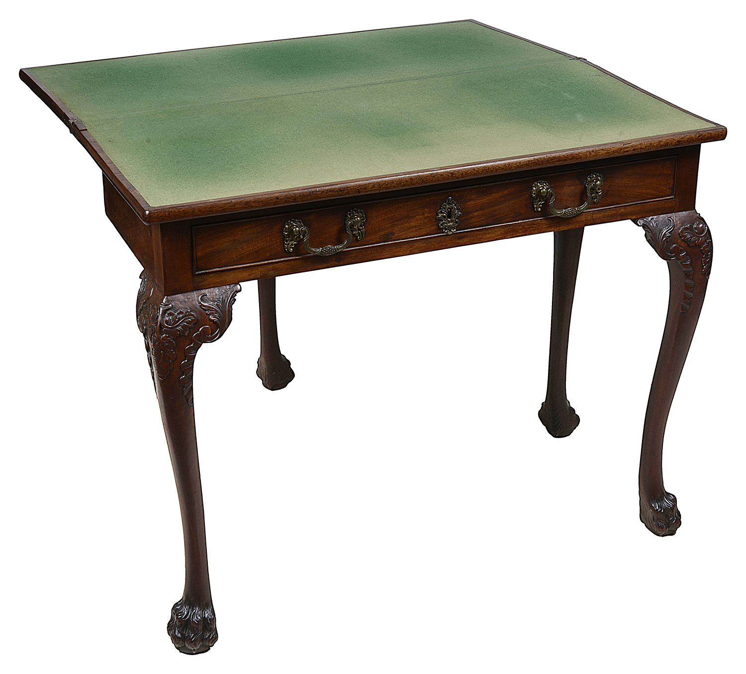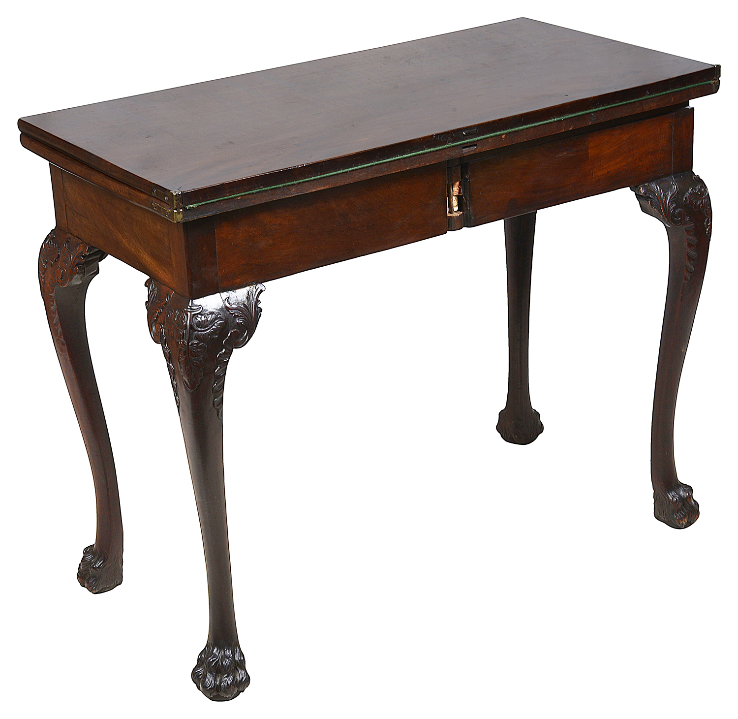 A very good quality 18th Century George II Mahogany folding card table, the top hinging open to reveal the baize covered card playing surface. A single frieze Oak lined drawer. Raised on beautifully hand carved cabriole legs with scrolling foliate decoration, terminating in wonderful hairy paw feet.