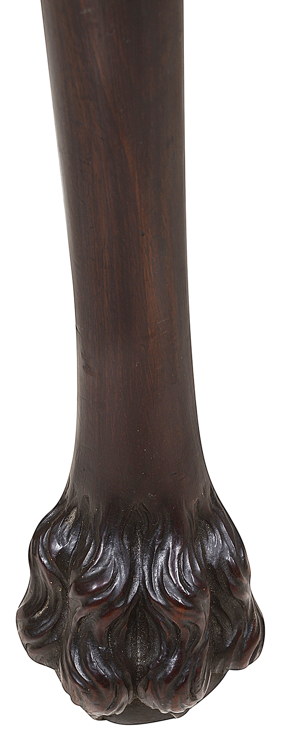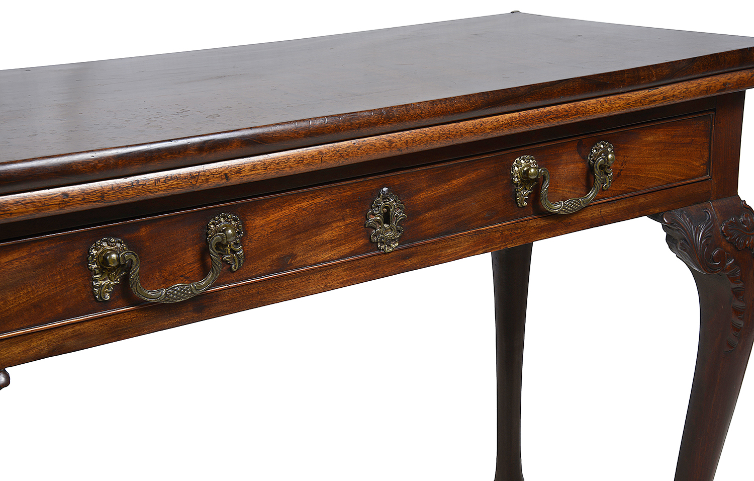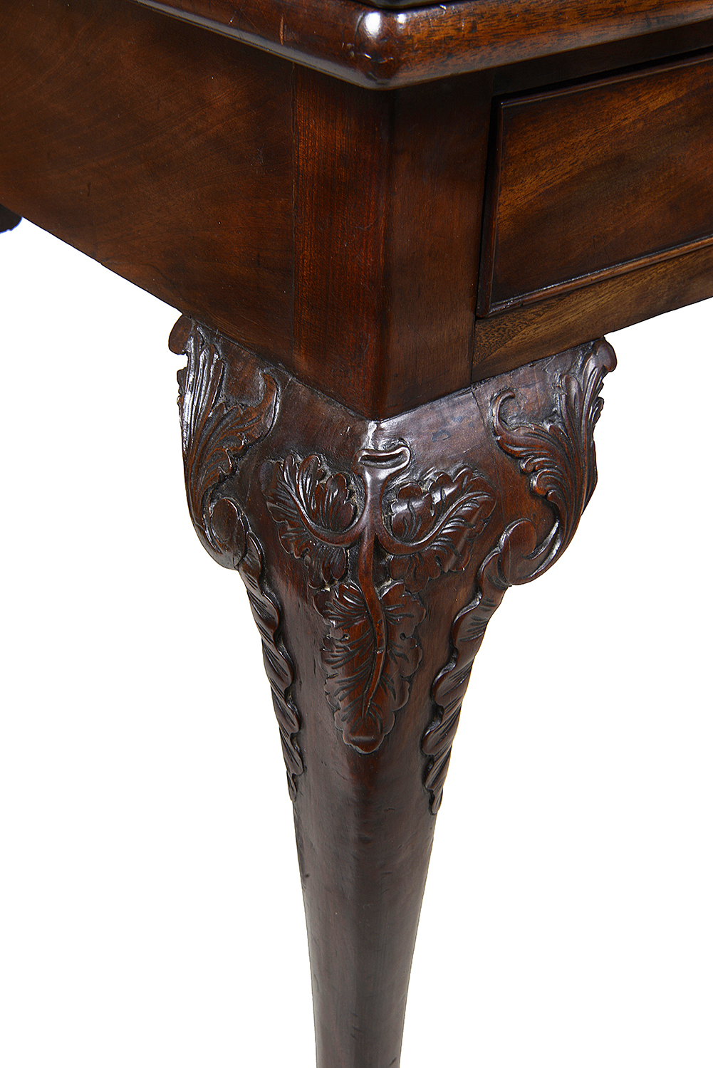 A very good quality 18th Century George II Mahogany folding card table, the top hinging open to reveal the baize covered card playing surface. A single frieze Oak lined drawer. Raised on beautifully hand carved cabriole legs with scrolling foliate decoration, terminating in wonderful hairy paw feet.