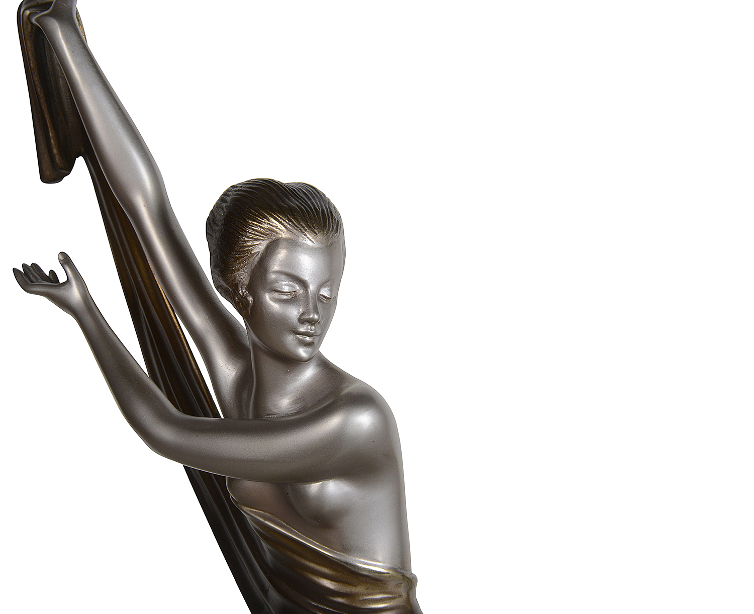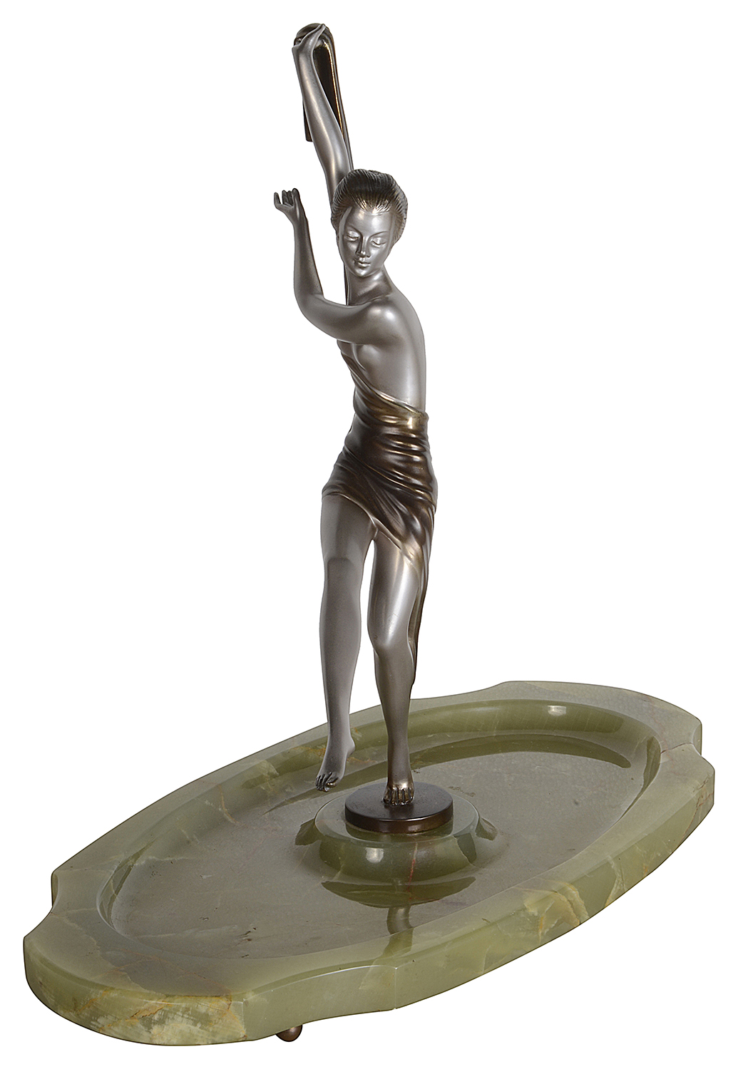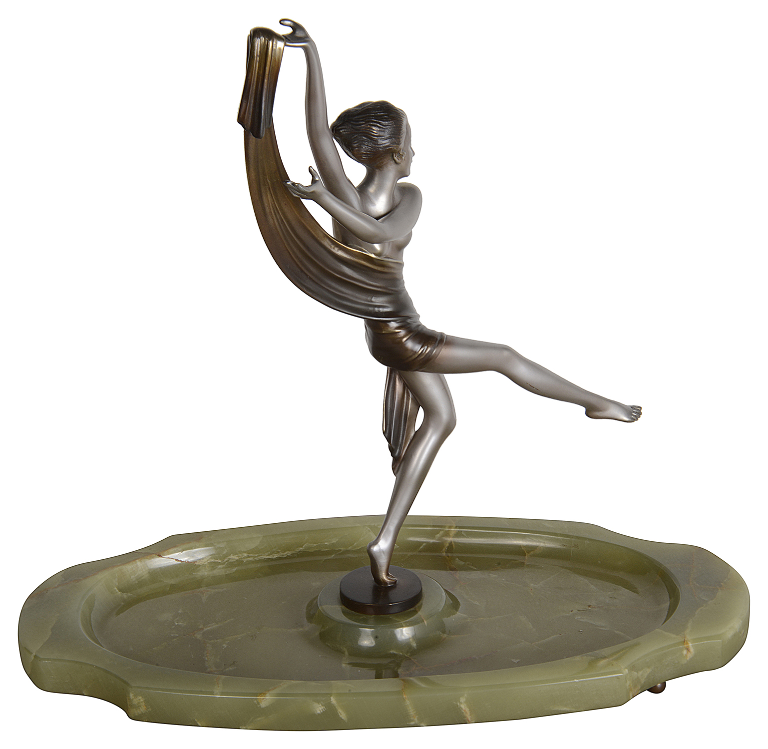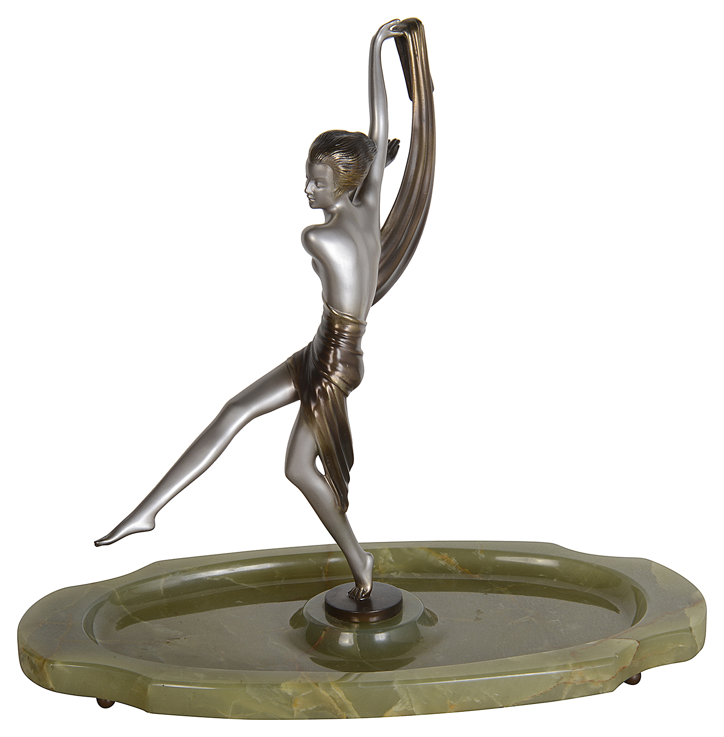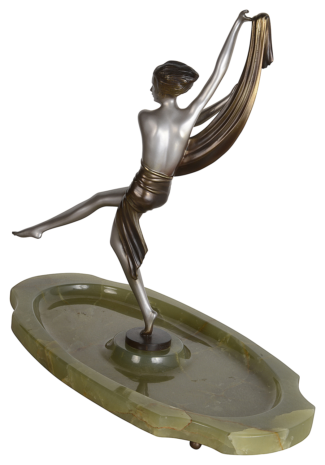A fabulous early 20th Century Art Deco cold painted bronze figure of a young woman holding an energetic pose lifting her shawl which is wrapped around her midriff. The bronze figure with excellent colour and very fine hand chased surface detail, raised on a green onyx base and signed Lorenzl