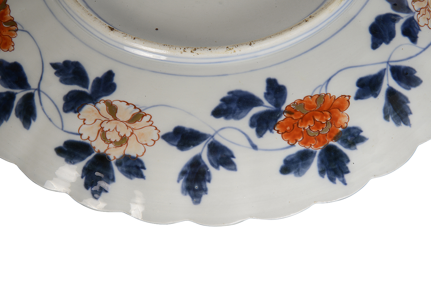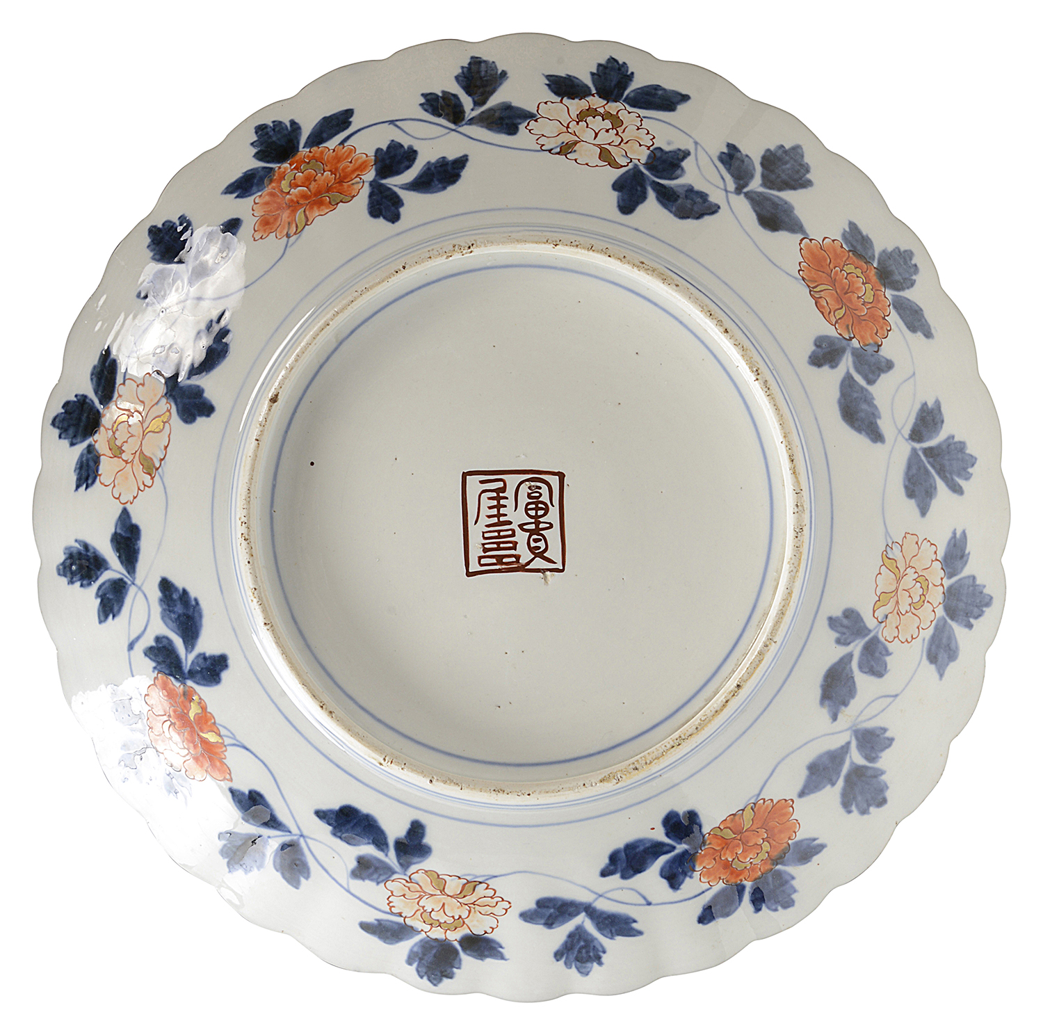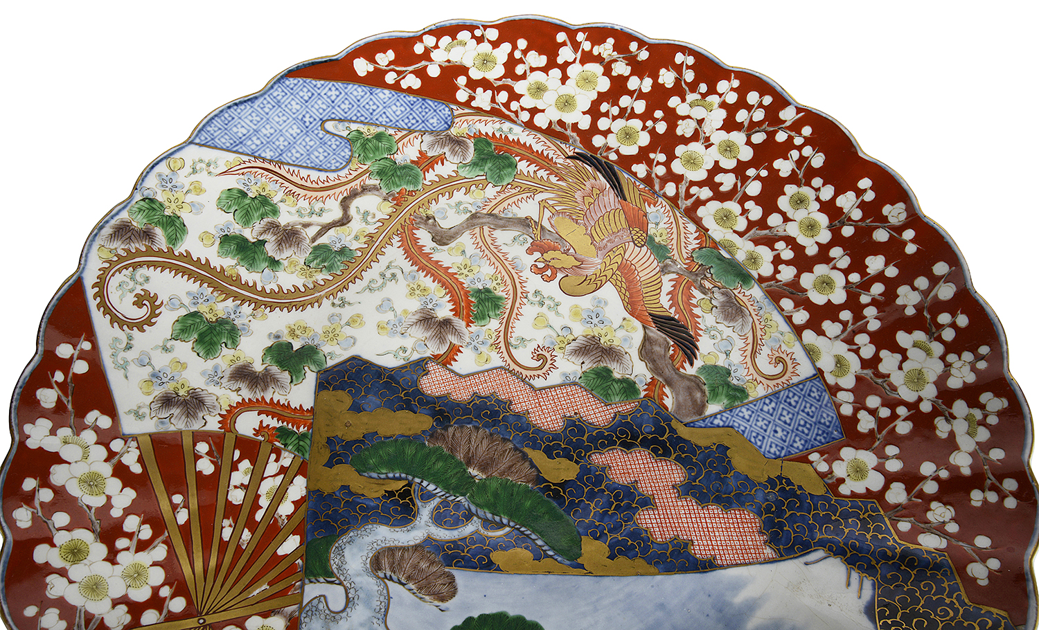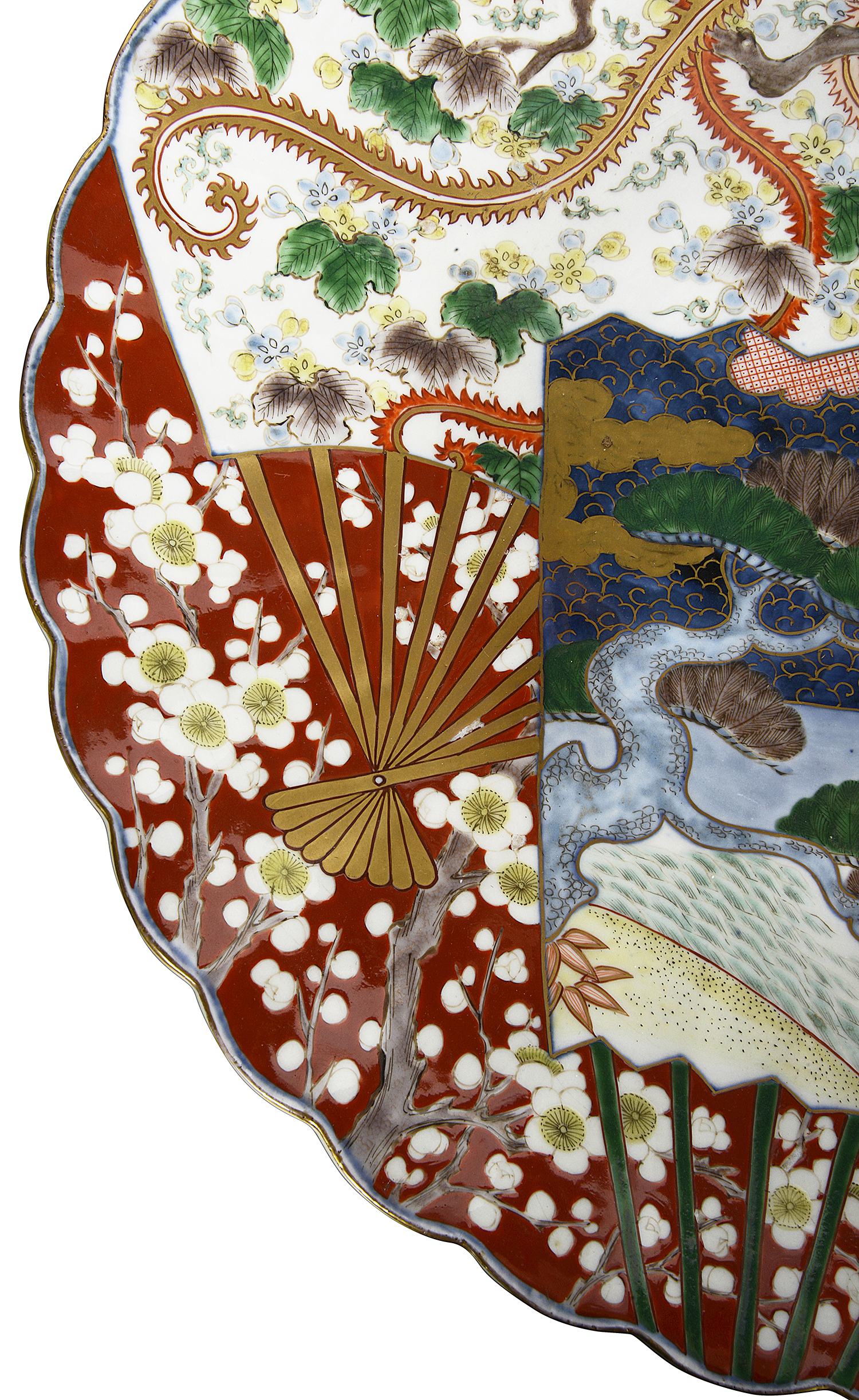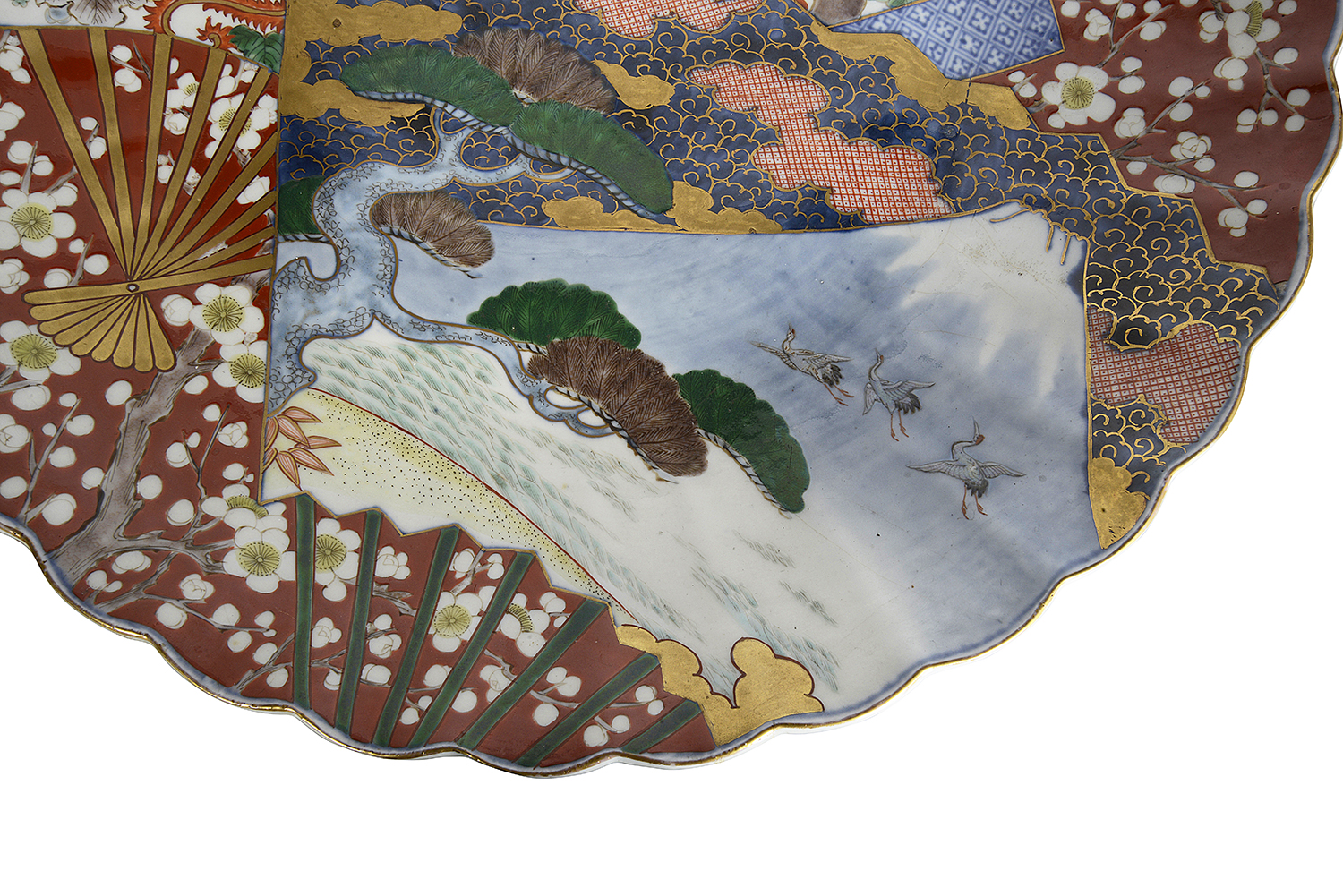A very decoration late 19th Century, Meiji period Japanese Imari porcelain charger, depicting Prunus blossom to the ground, two fans one with a mythical bird the other with Cranes in flight.