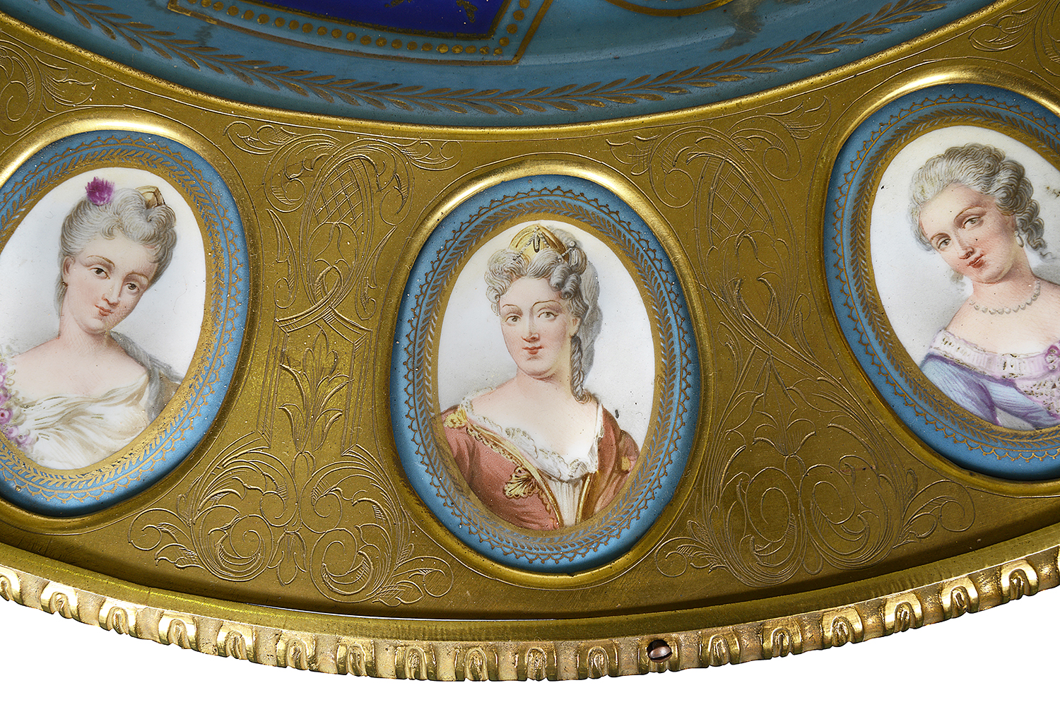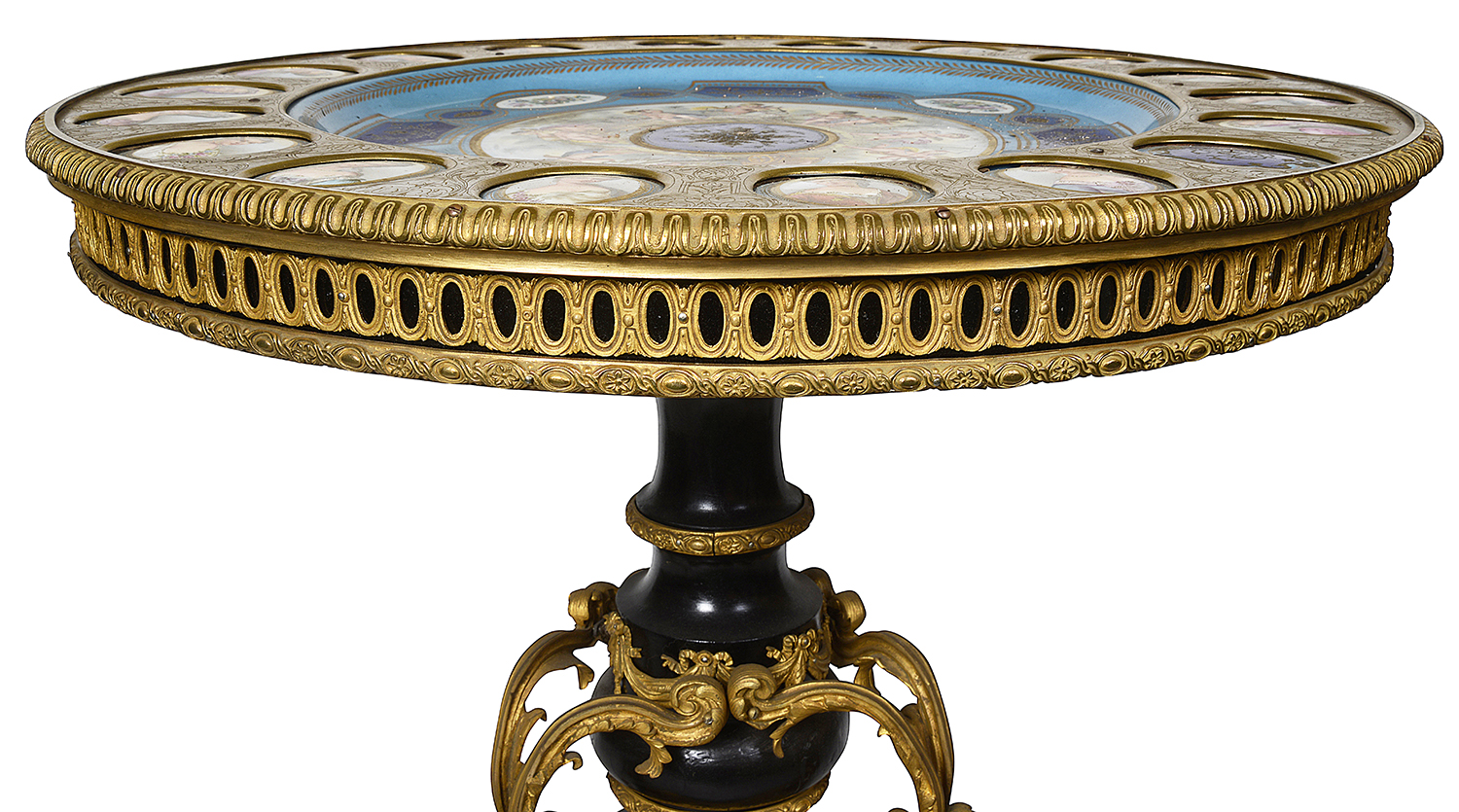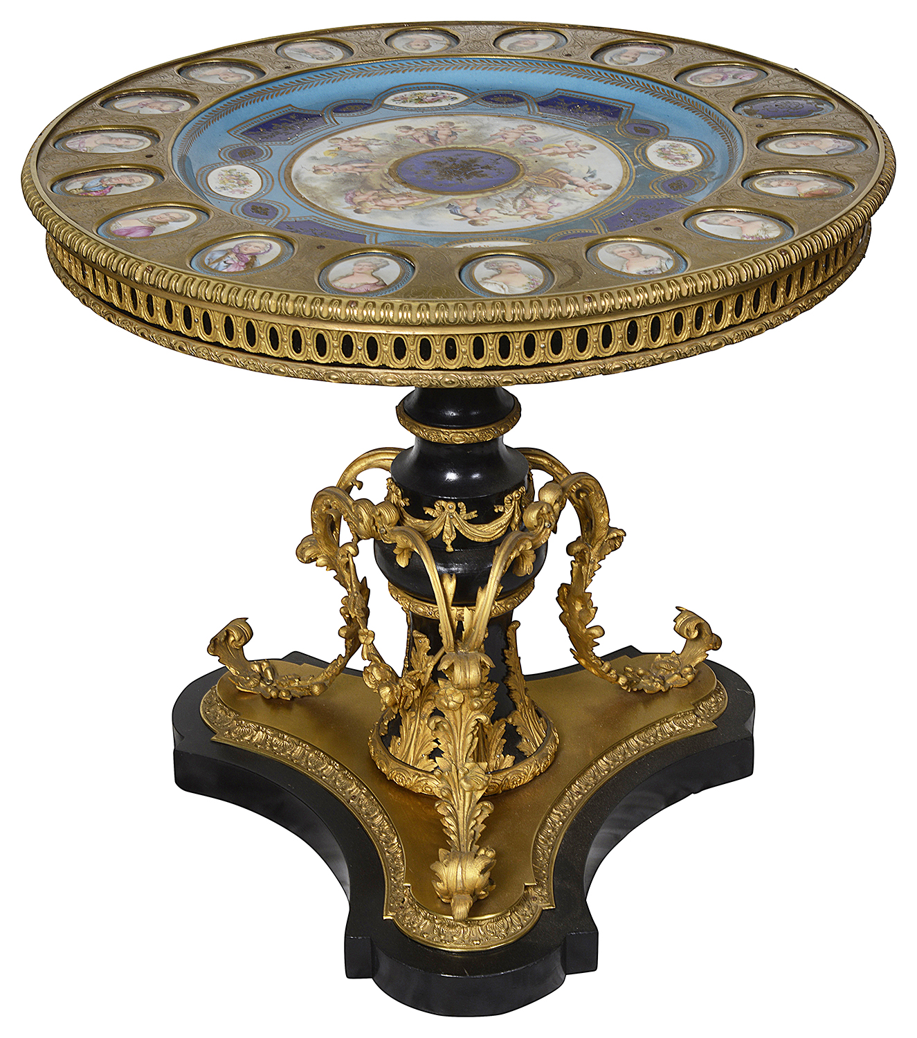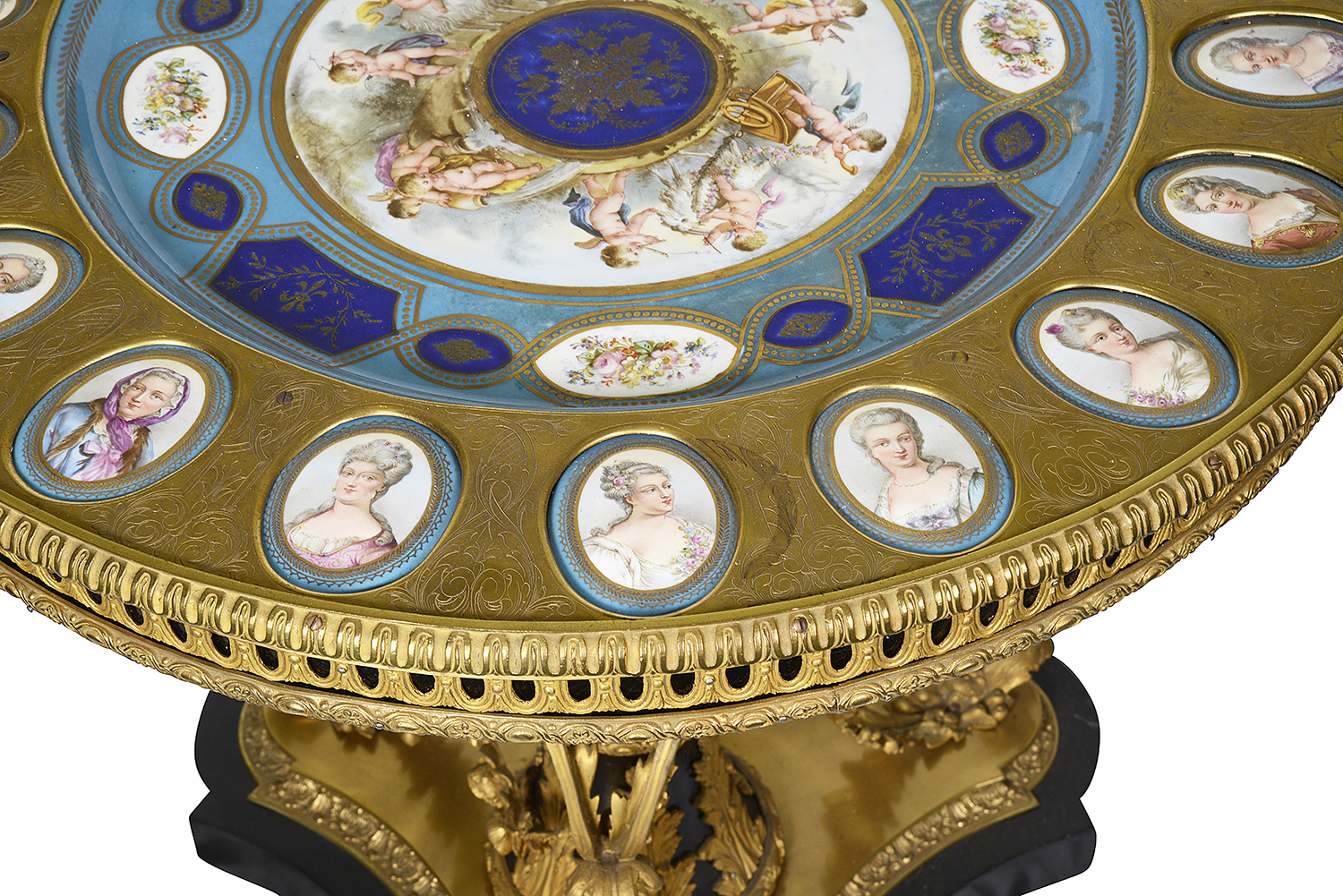 A fine quality French 19th Century ebonized, gilded ormolu mounted centre table with porcelain plaques depicting court beauties and the Bourbon coat-of-arms, the ebonised baluster support flanked by acanthus-cast scrolled volutes joined by foliate swags, on a triform base.