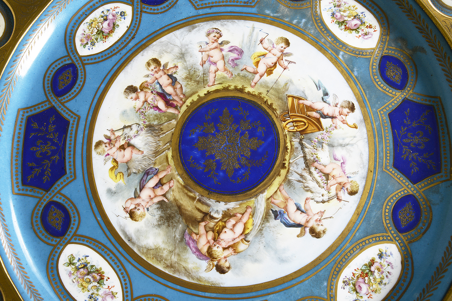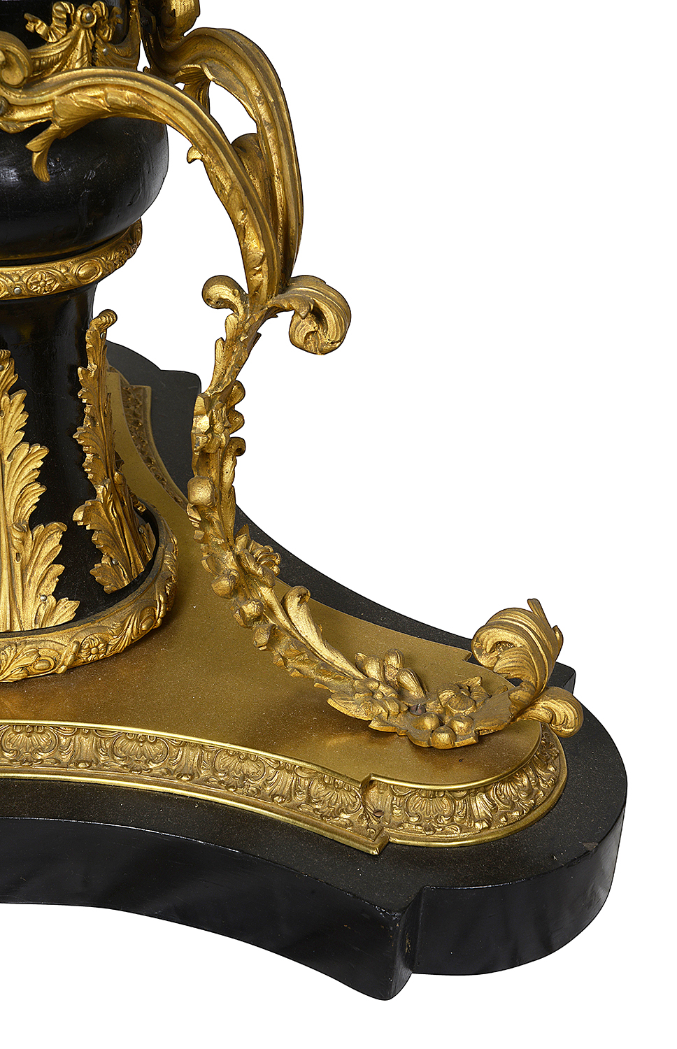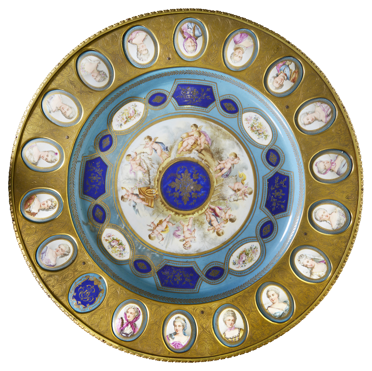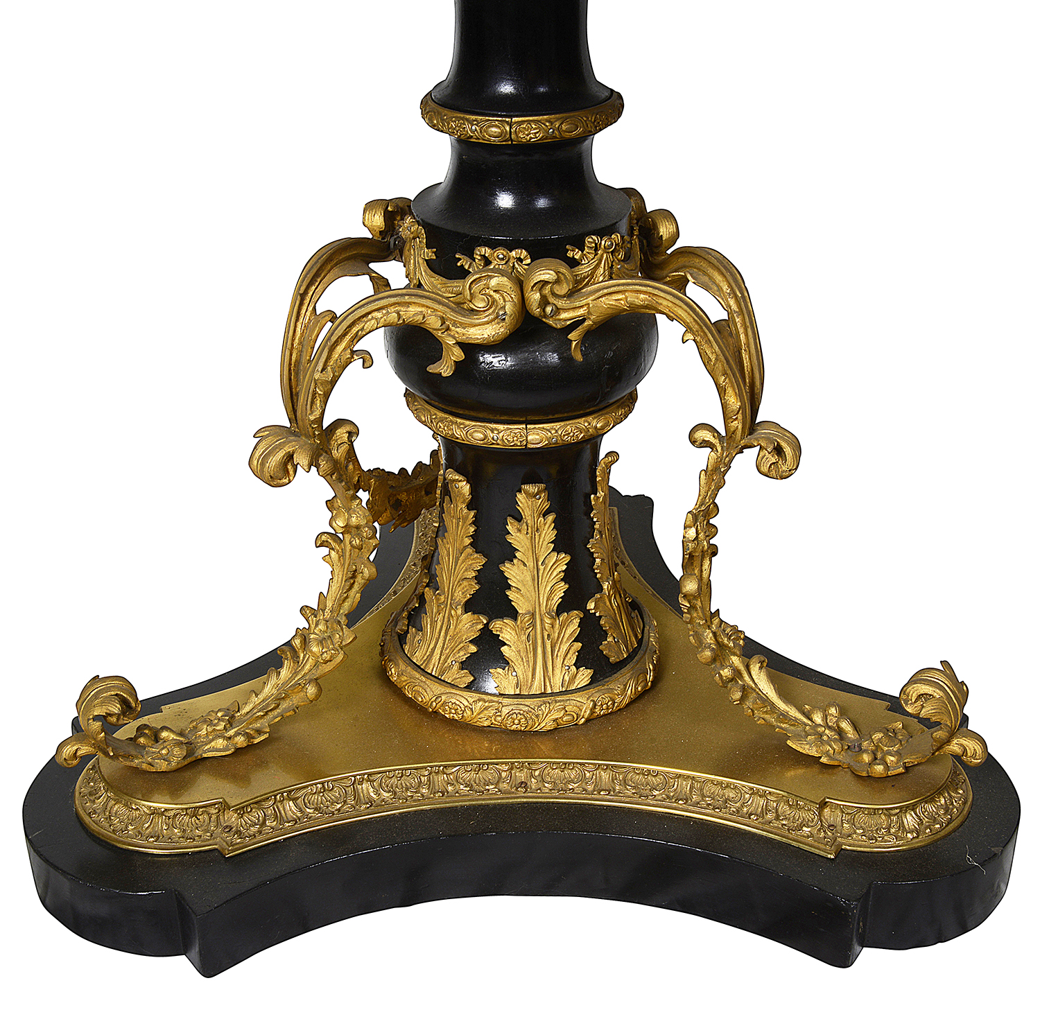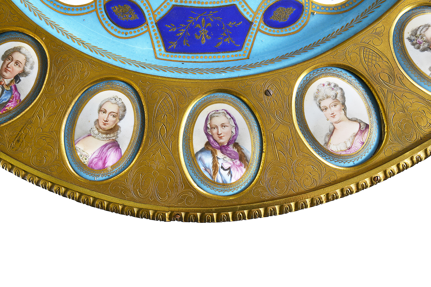 A fine quality French 19th Century ebonized, gilded ormolu mounted centre table with porcelain plaques depicting court beauties and the Bourbon coat-of-arms, the ebonised baluster support flanked by acanthus-cast scrolled volutes joined by foliate swags, on a triform base.
