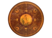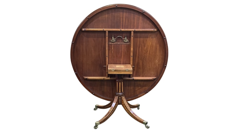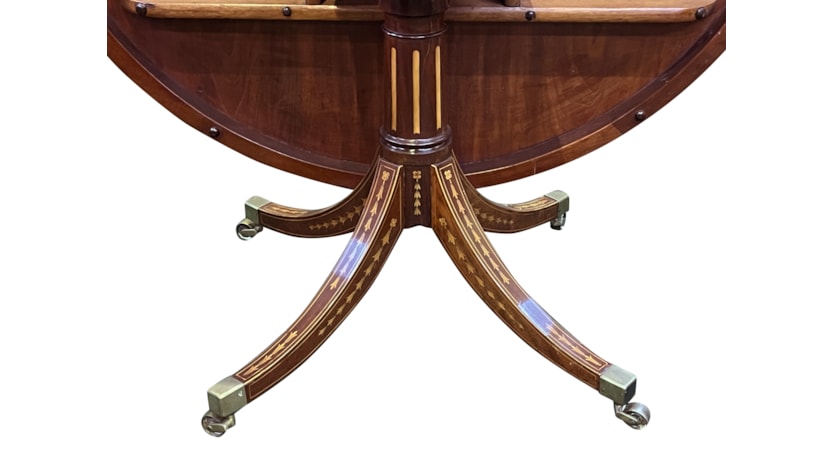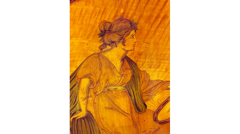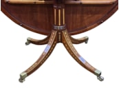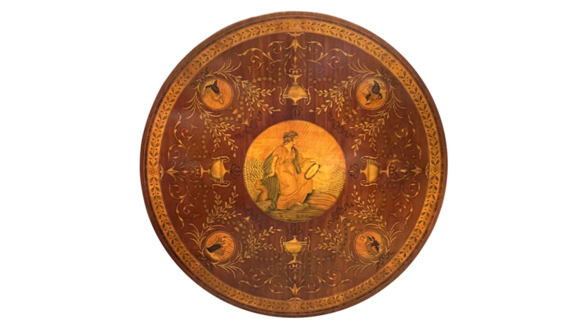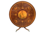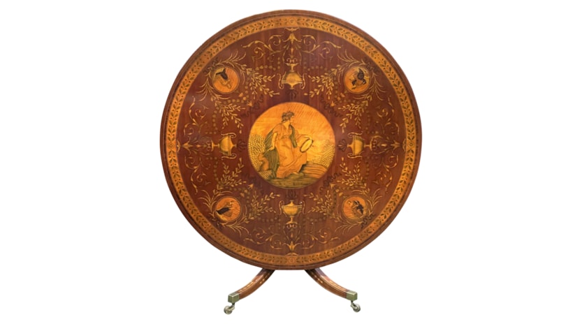 A fine quality Regency period Mahogany centre table with Satinwood cross banding and wonderful marquetry inlaid decoration to the centre. Depicting seated classical female figures playing various musical instruments, four classical urns united by scrolling folate and ribbon decoration. The elegant four splay base with Satinwood inlaid, terminating in the original brass castors, circa 1820.