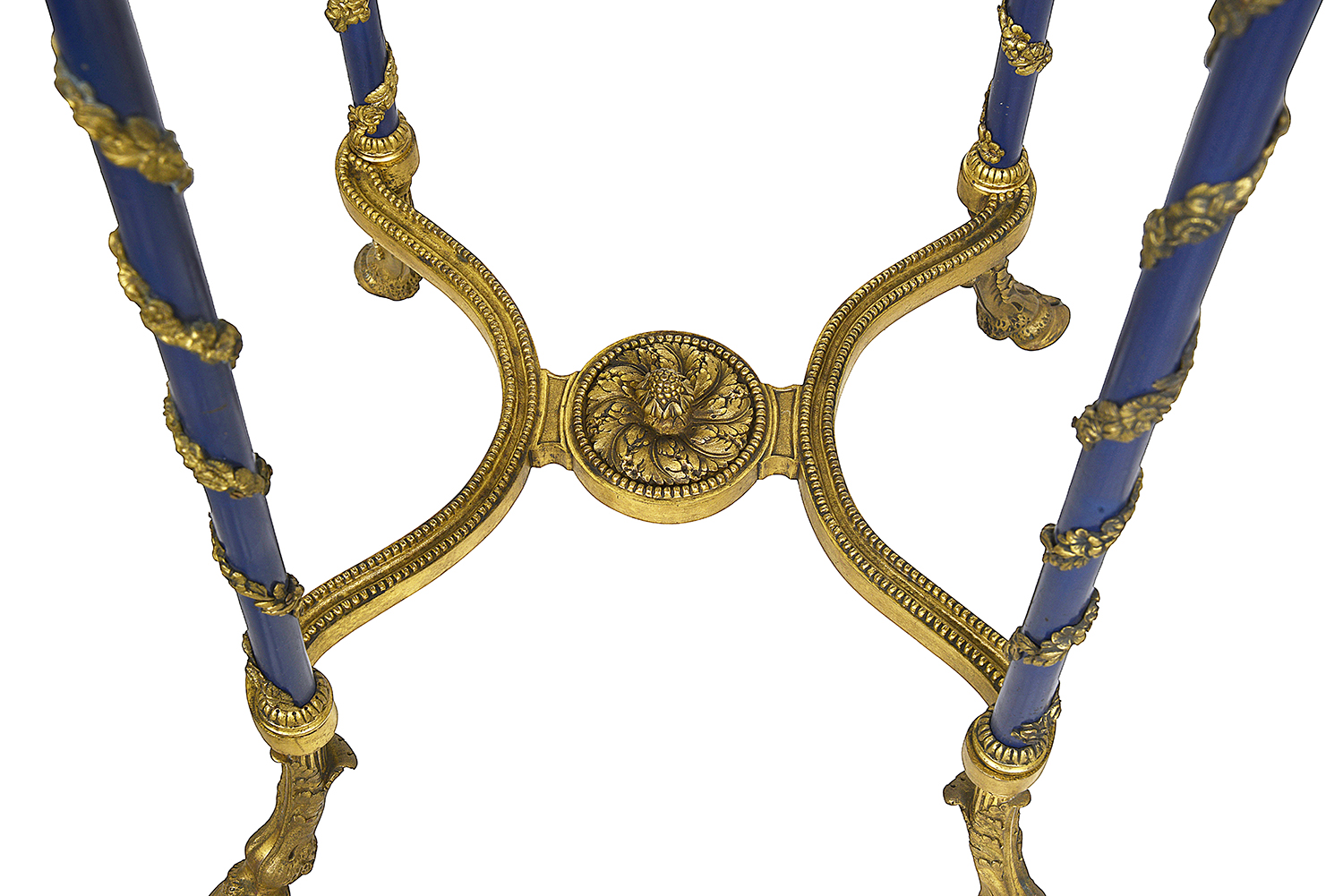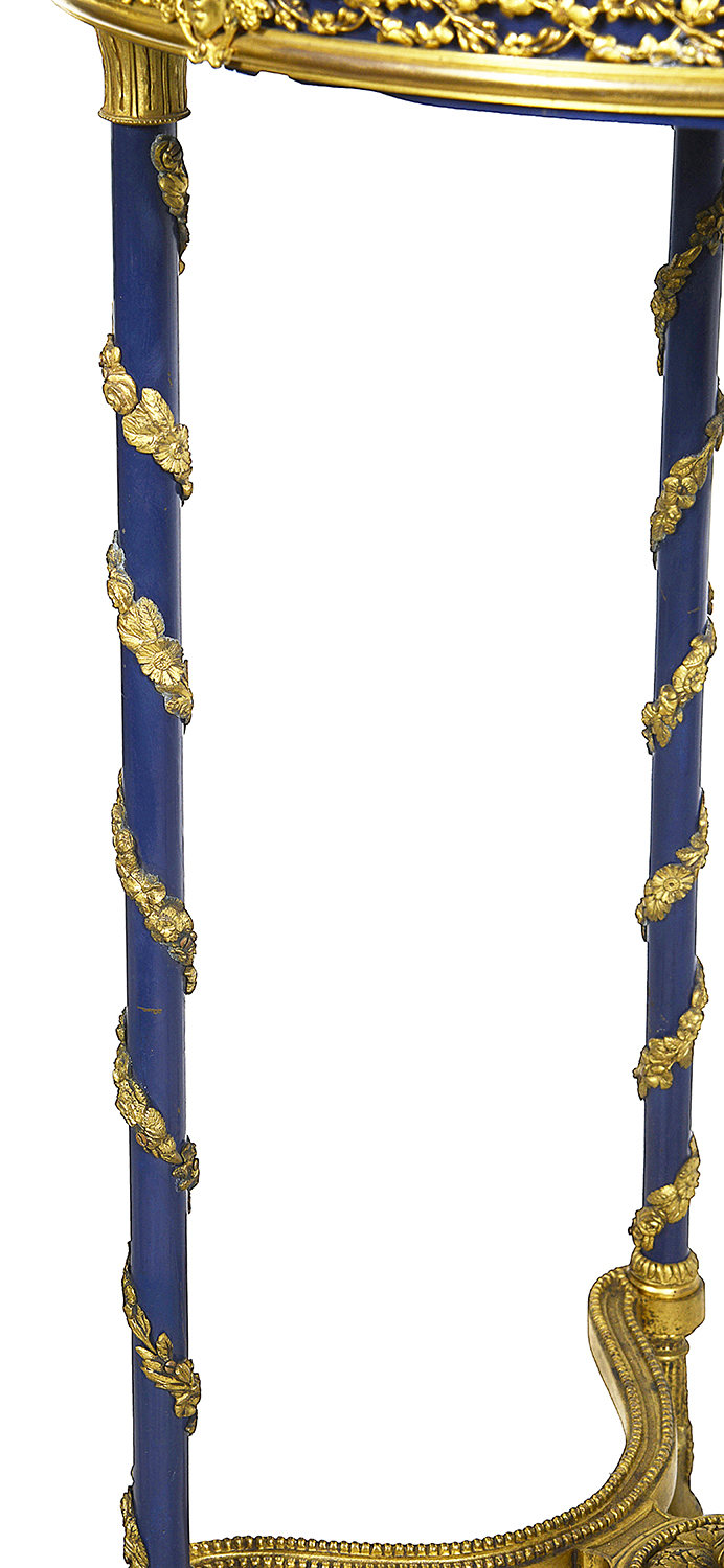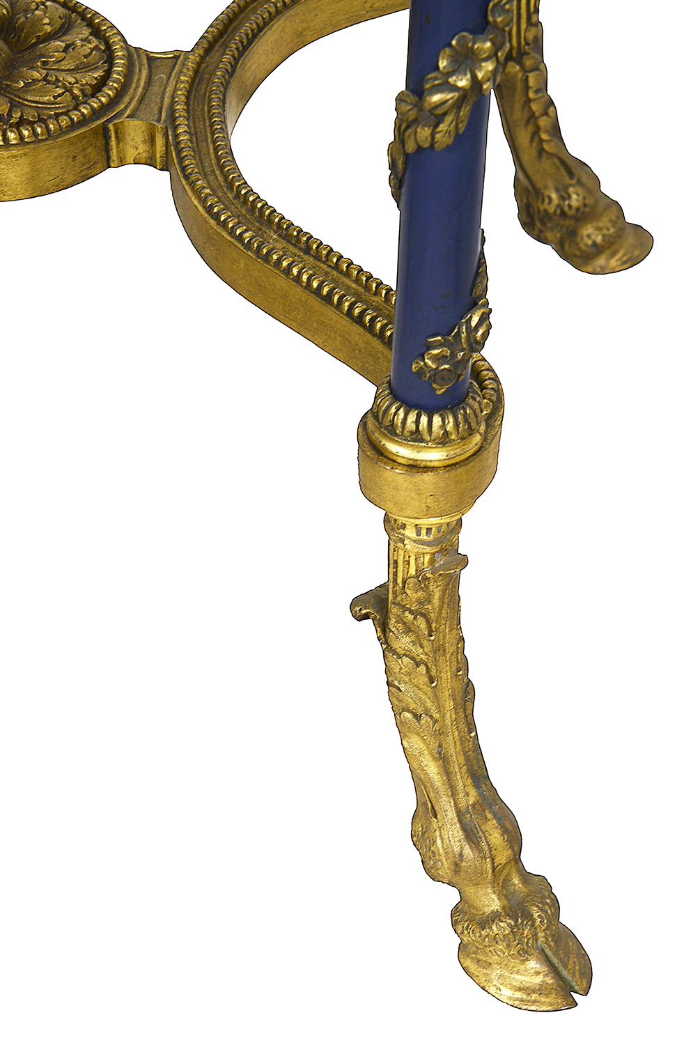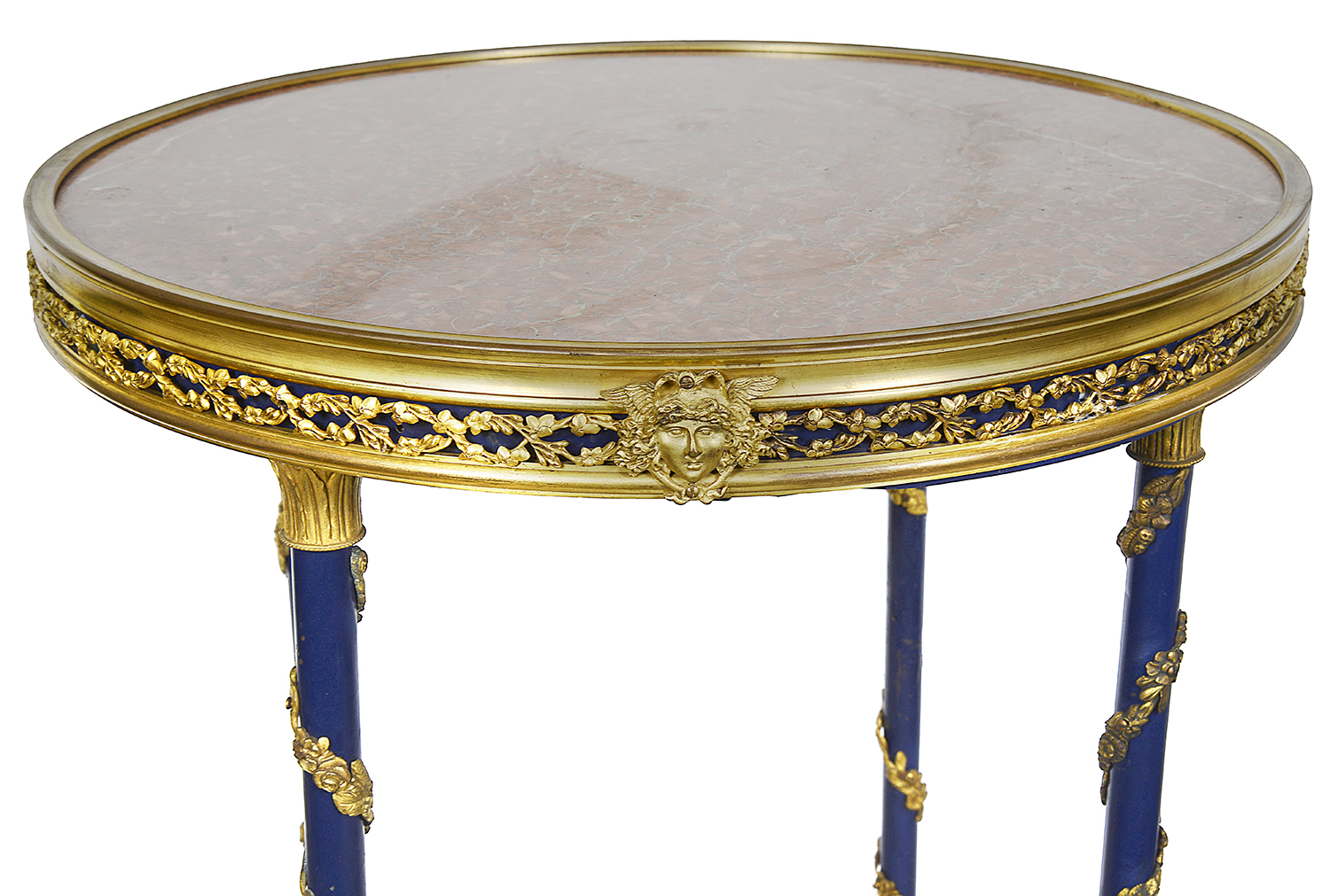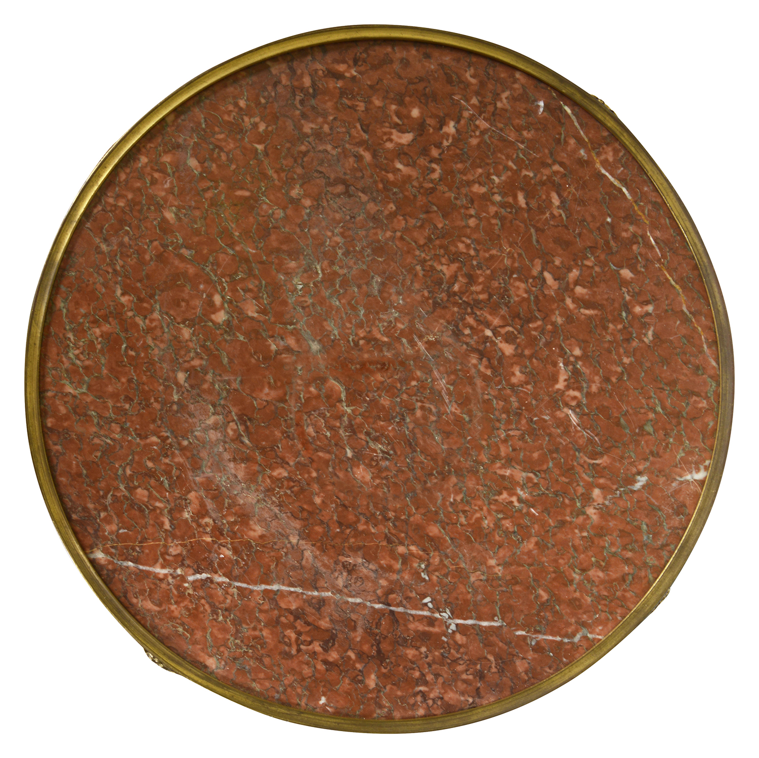 A very good quality late 19th Century French Rouge marble topped, ormolu mounted Gueridon, having round tapering legs with scrolling foliate ormolu wrapped around, terminating in hoof shaped feet. In the manner of Weisweller.