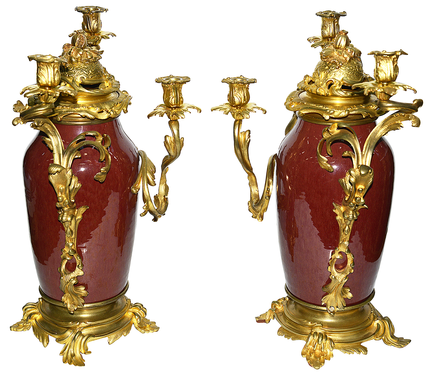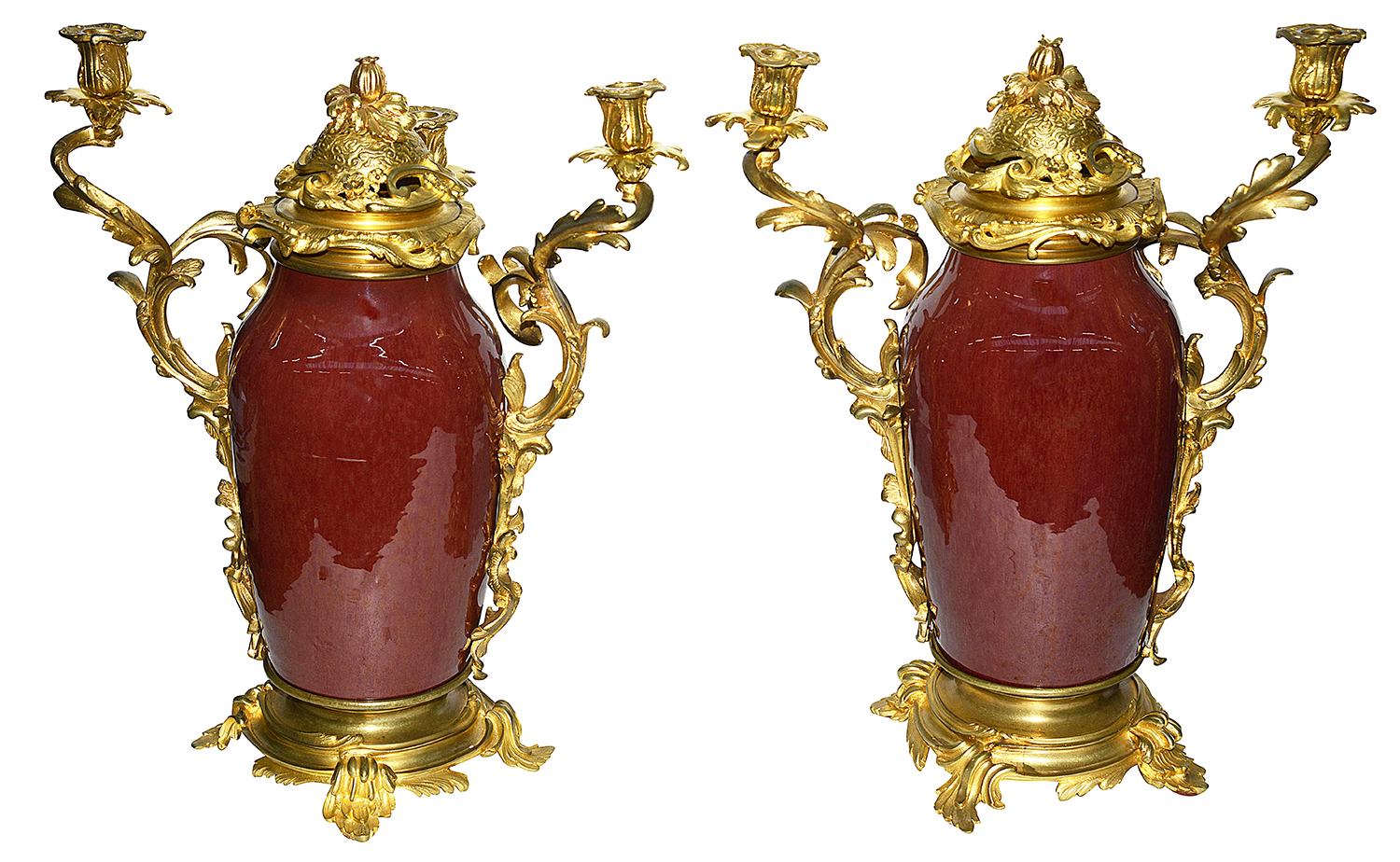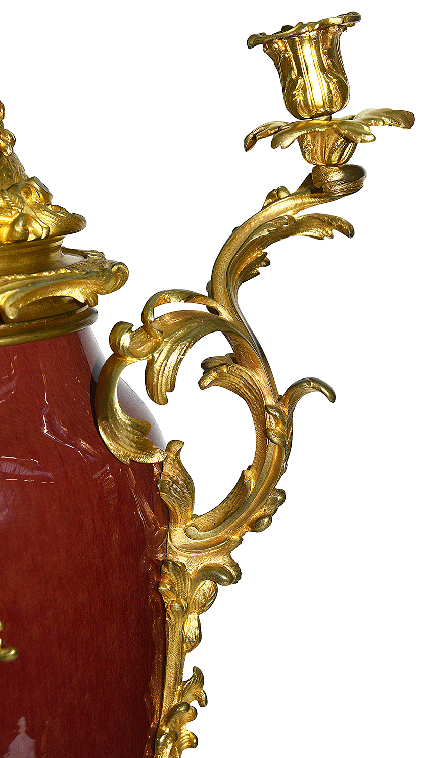 A very impressive and decorative pair of 19th century Chinese Sang Du Bouf lidded vases each with wonderful gilded ormolu Rococo style scrolling foliate candelabra mounts.