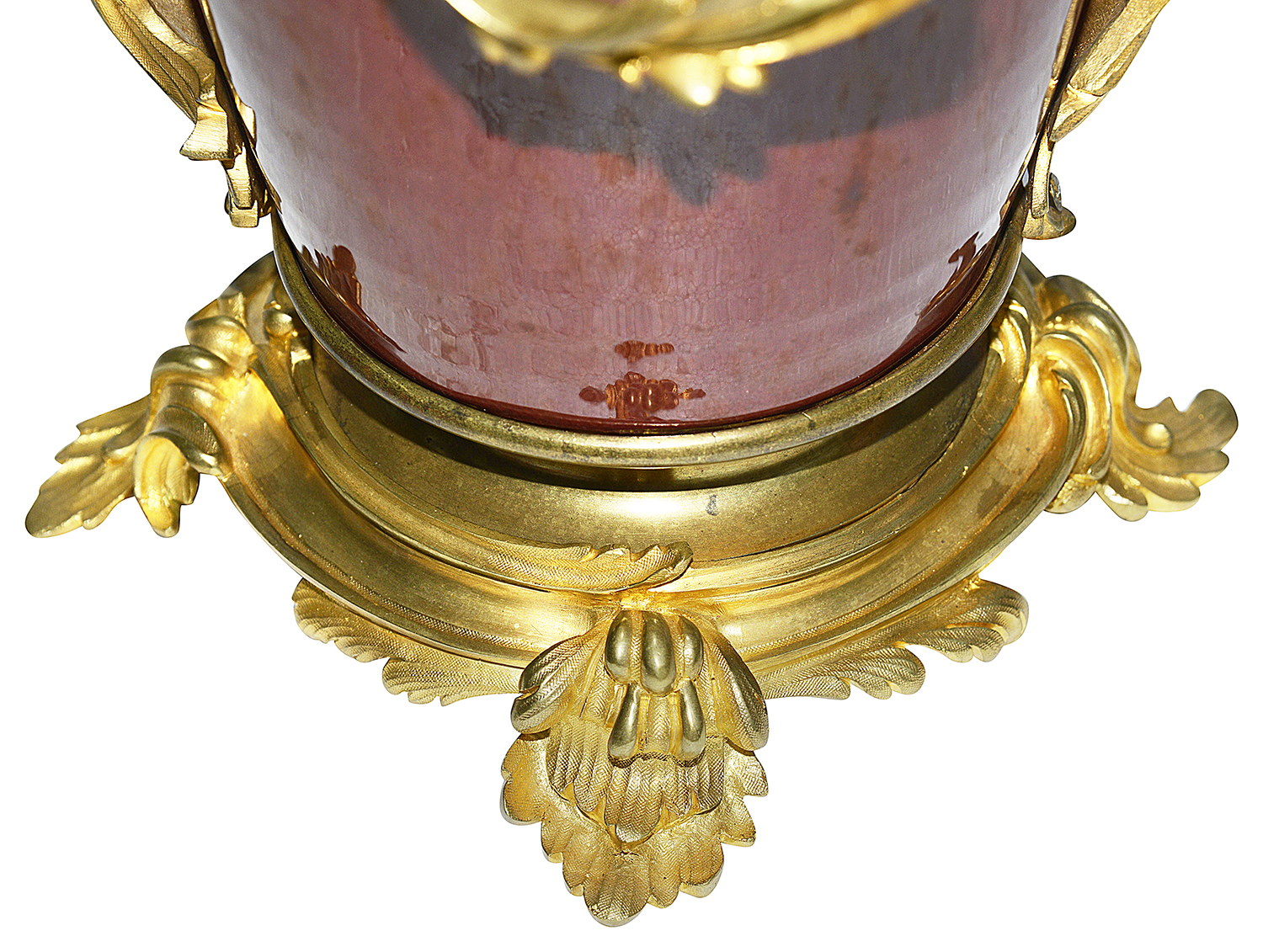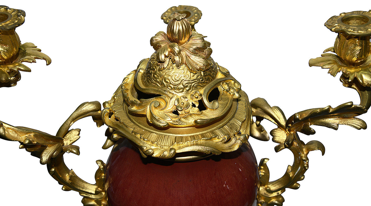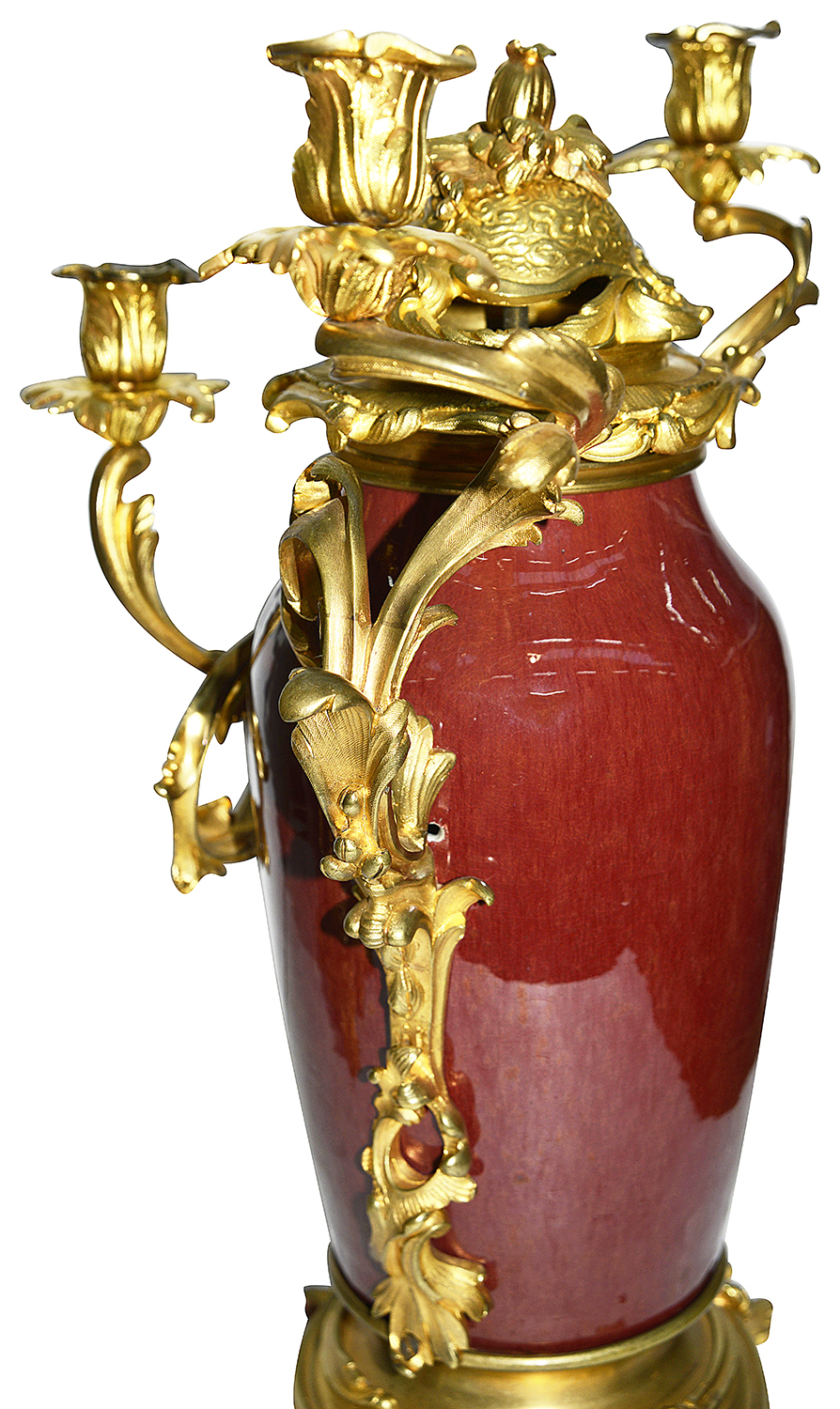 A very impressive and decorative pair of 19th century Chinese Sang Du Bouf lidded vases each with wonderful gilded ormolu Rococo style scrolling foliate candelabra mounts.