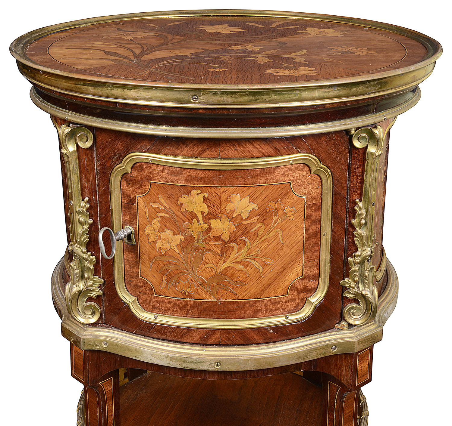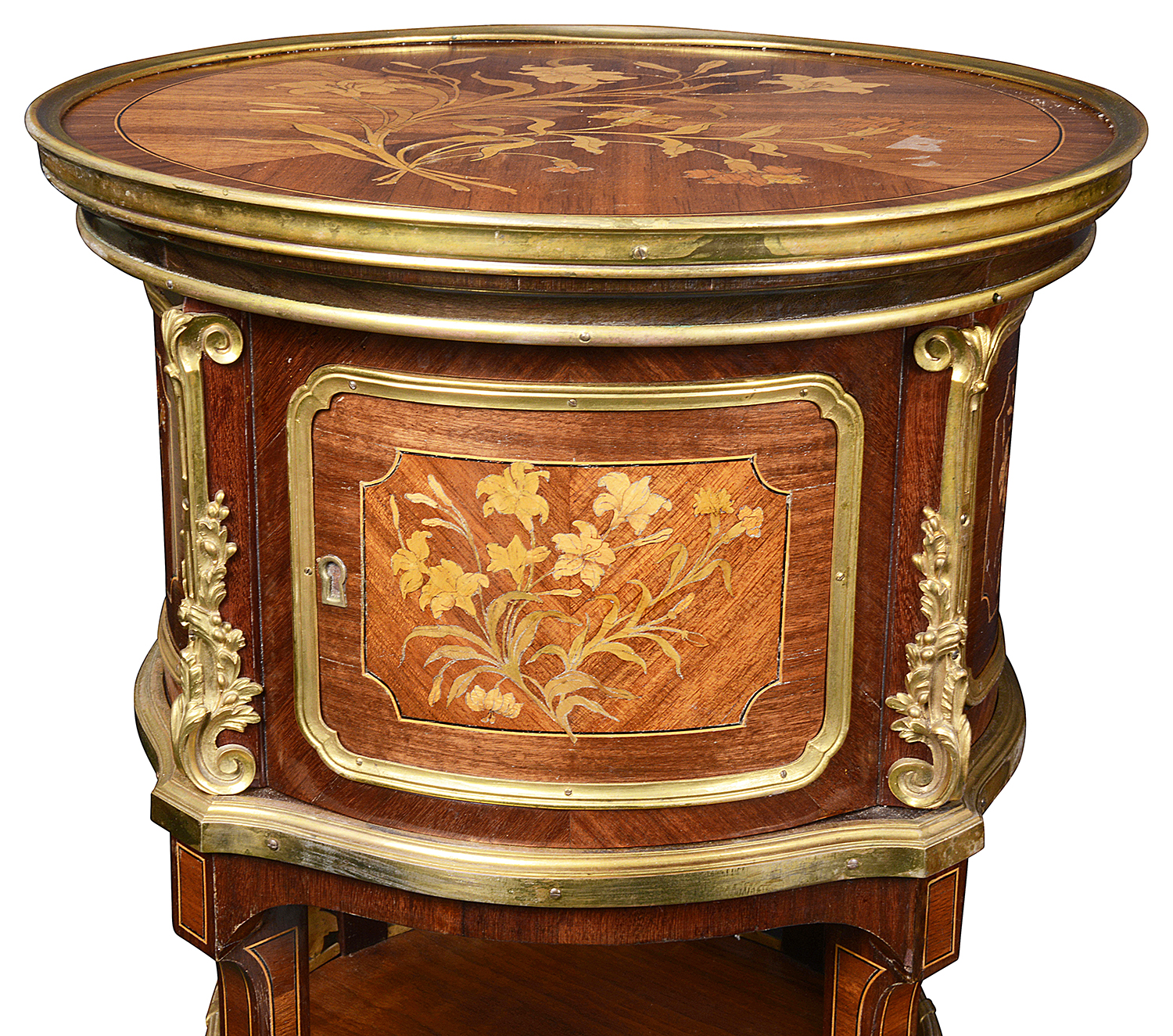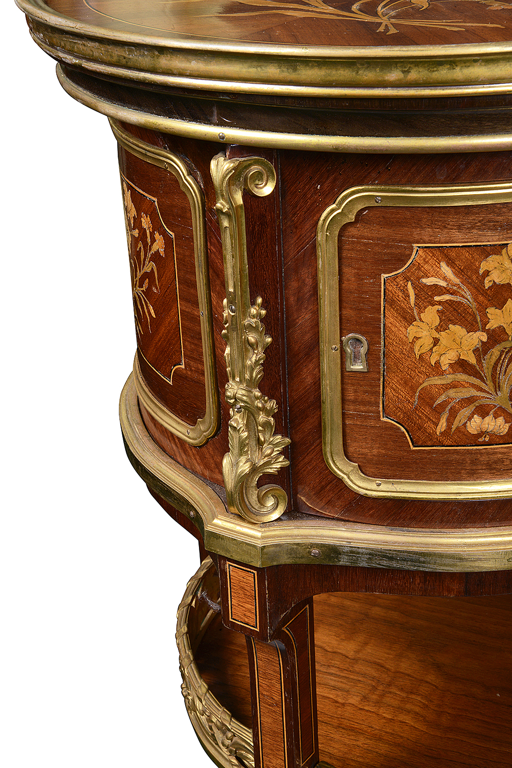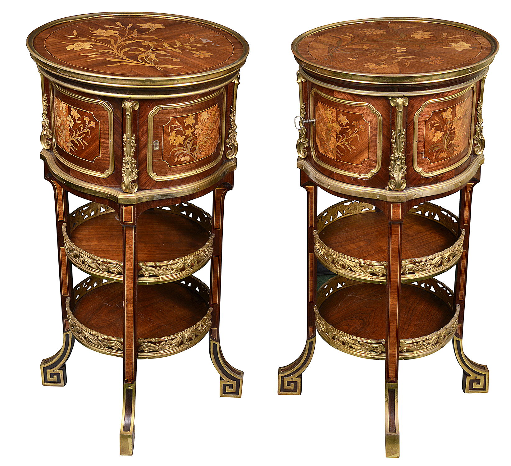A rare matched pair of 19th Century French circular Louis XVI style side cabinet / tables. Each with wonderful floral marquetry inlay to the tops and sides. Hinged doors to each opening to reveal compartments within. Beautiful scrolling gilded ormolu mounts and moulding, pierced galleries to the under tiers, raised on elegant outswept legs.
