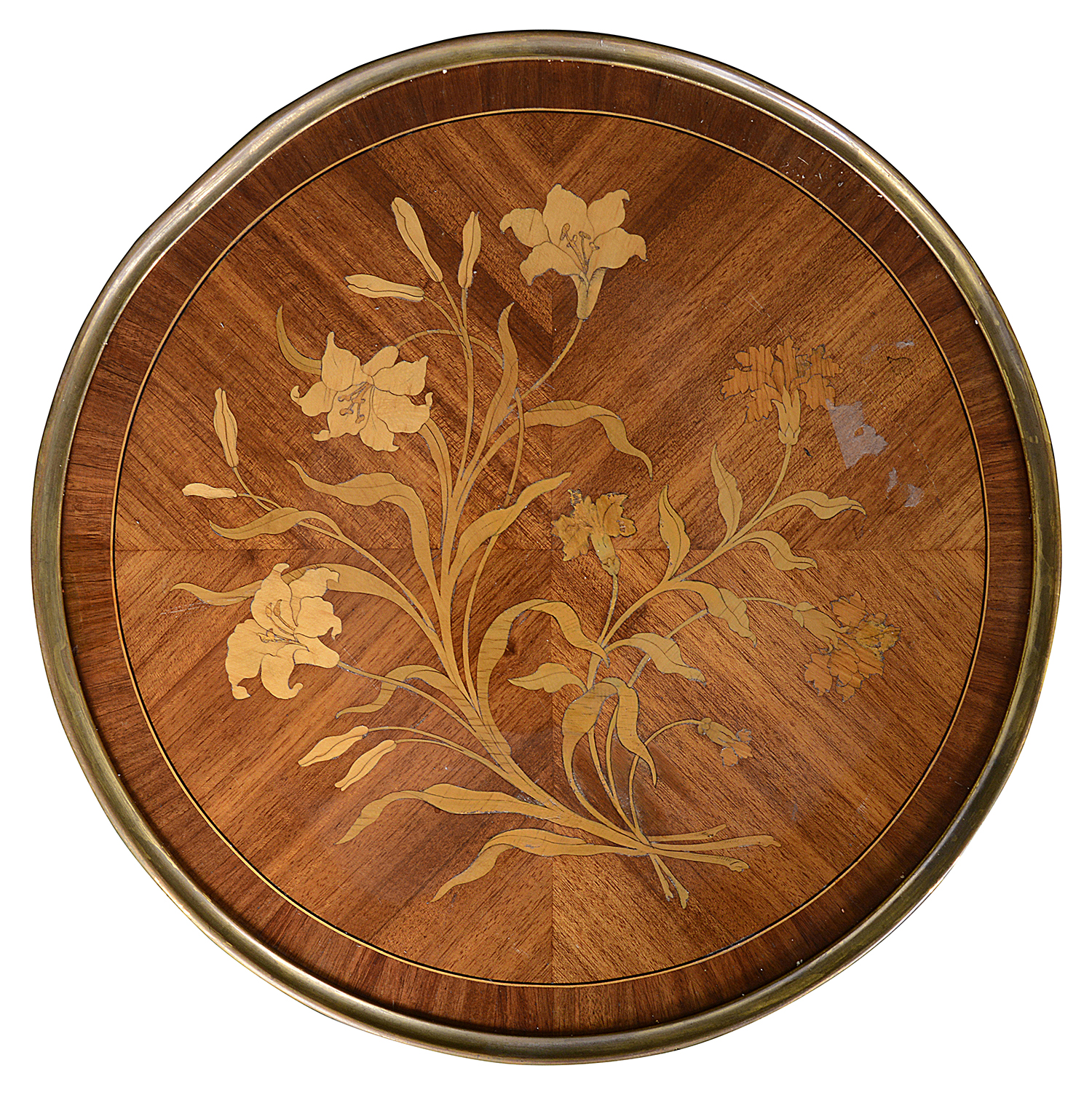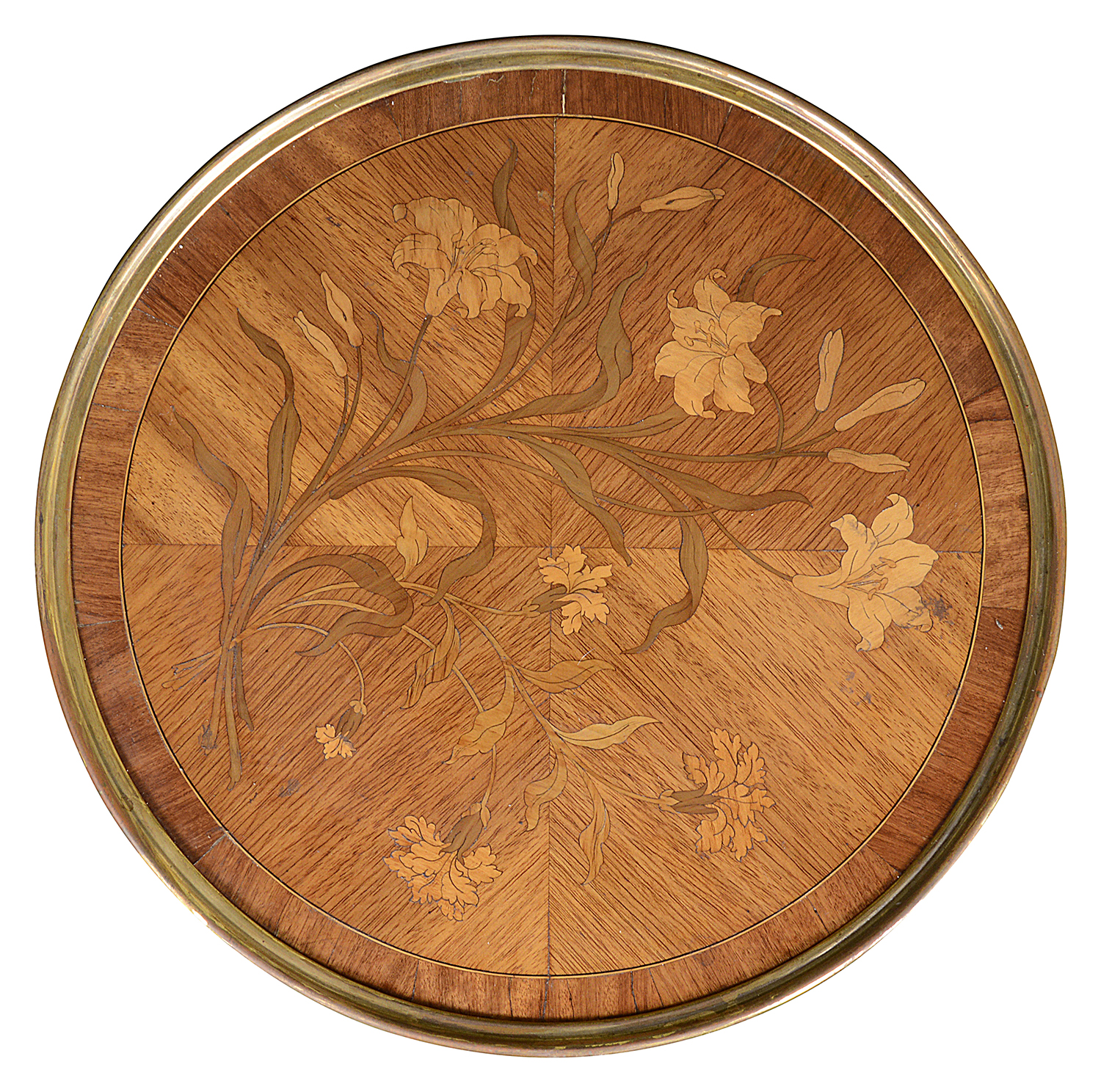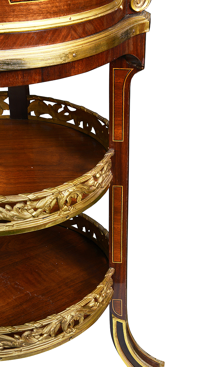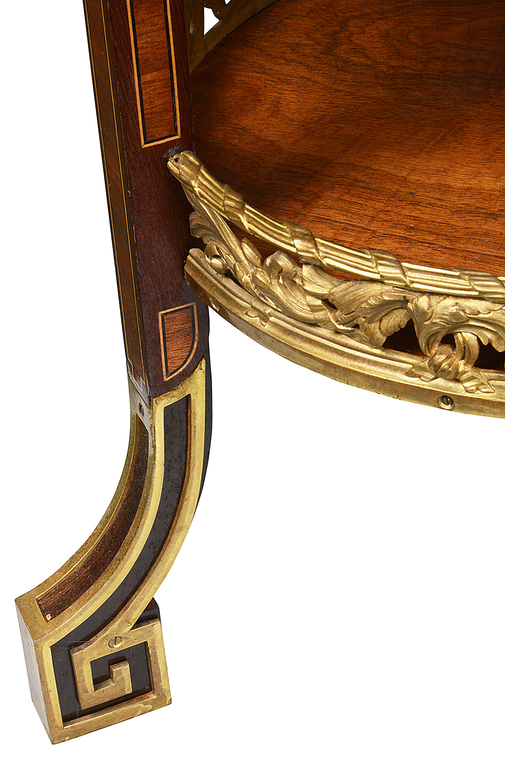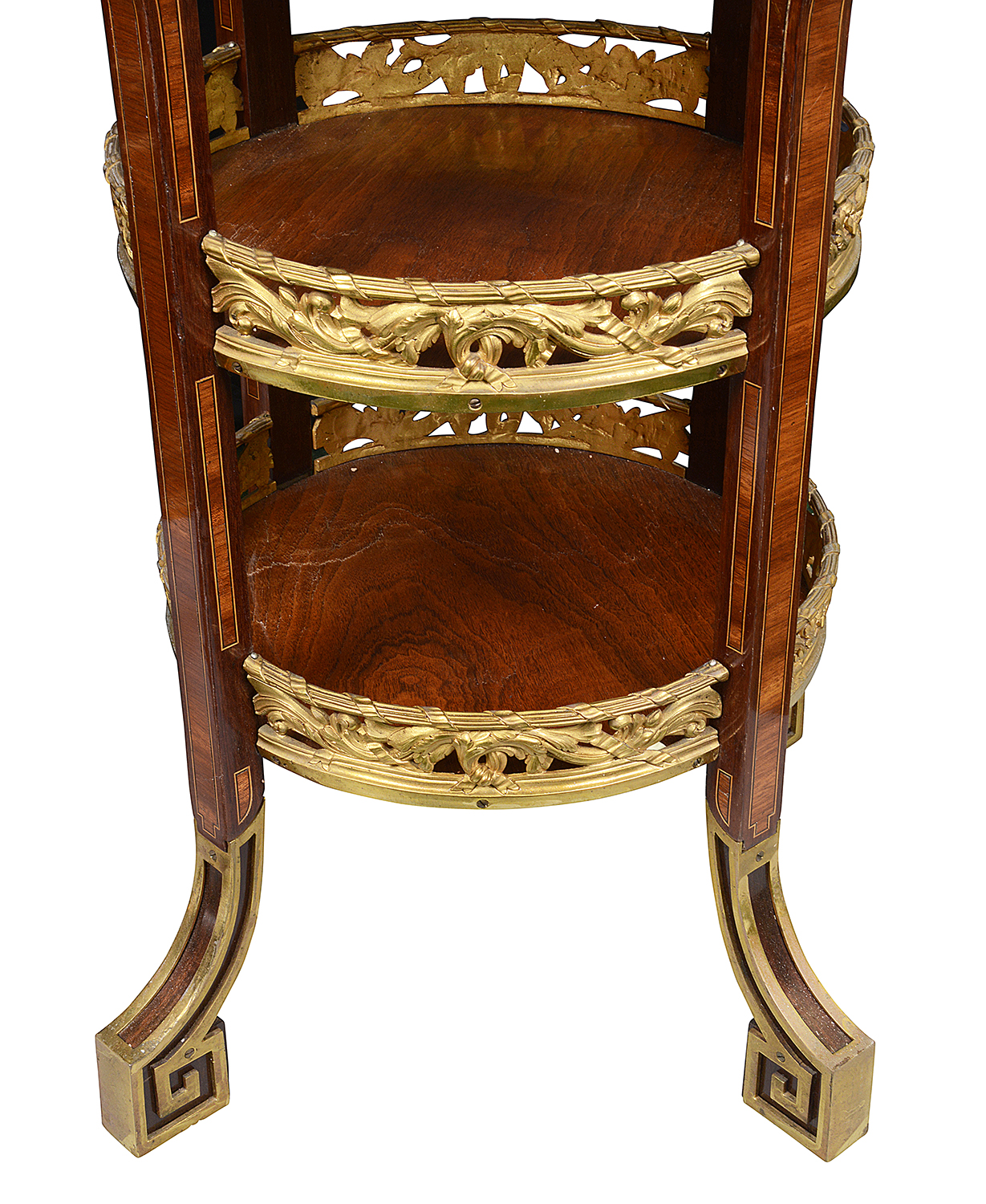 A rare matched pair of 19th Century French circular Louis XVI style side cabinet / tables. Each with wonderful floral marquetry inlay to the tops and sides. Hinged doors to each opening to reveal compartments within. Beautiful scrolling gilded ormolu mounts and moulding, pierced galleries to the under tiers, raised on elegant outswept legs.