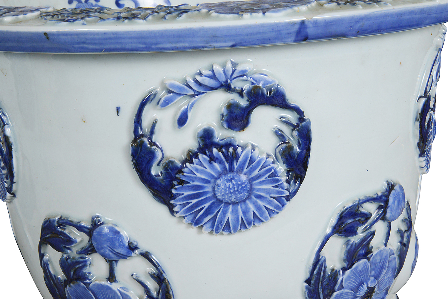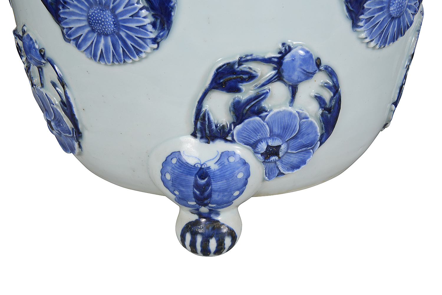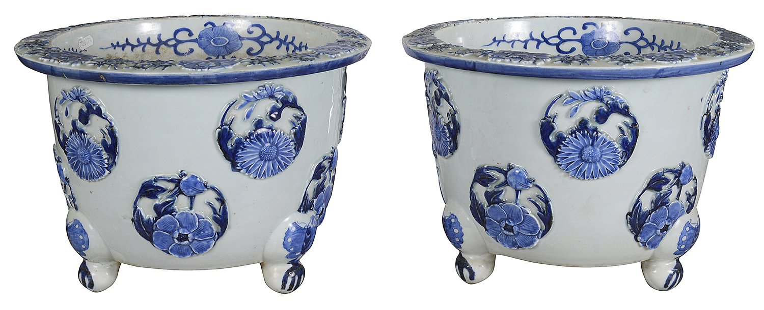 A very good quality pair of late 19th Century Japanese Blue and White Jardinieres, each with a white ground and raised circular relief panels depicting exotic flowers, raised on three scrolling feet with butterflies on. Circa 1880